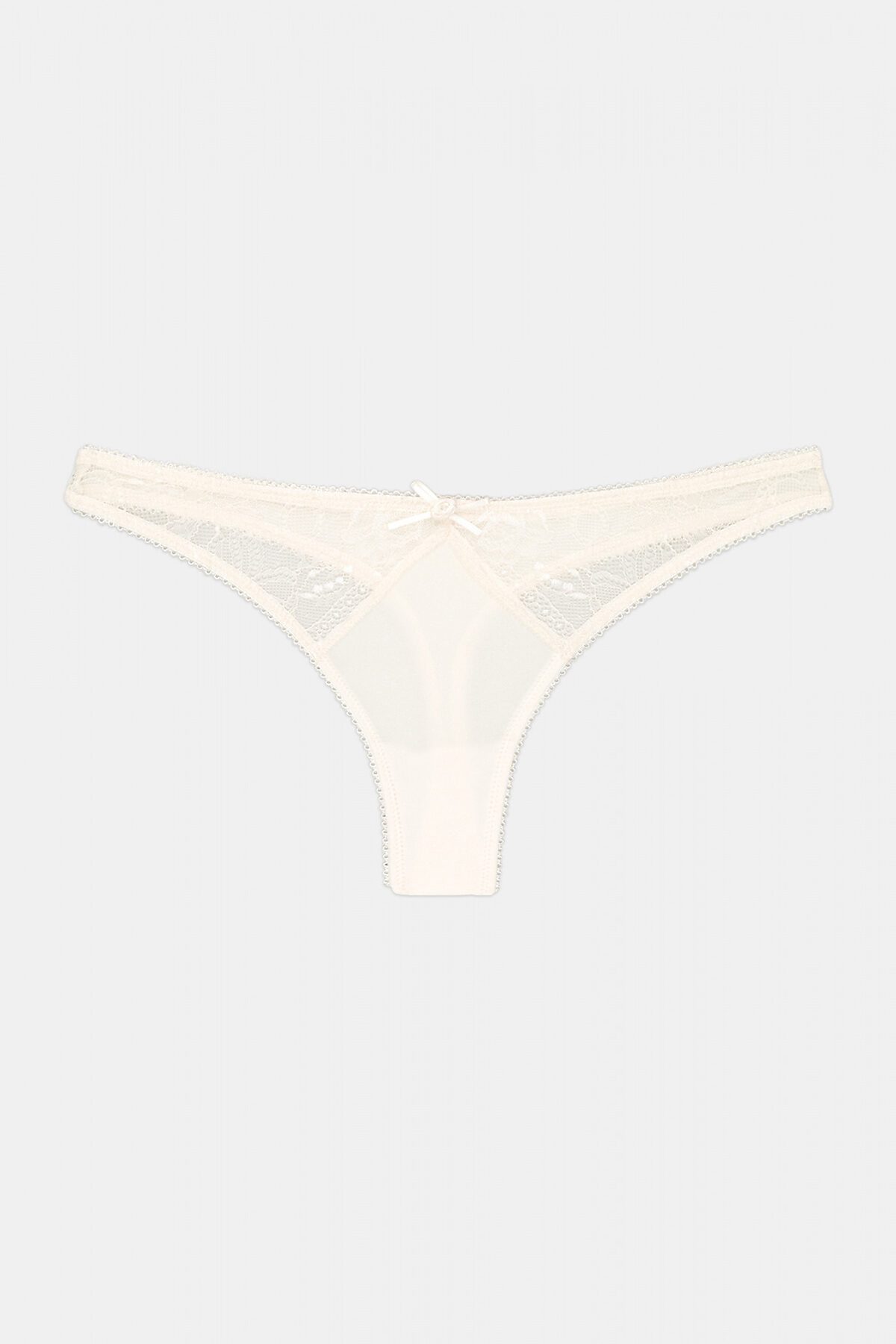 - Базовые трусики-стринг из эластичной ткани и кружева. - Передняя деталь декорирована атласным бантиком с розочкой. В комплект можно подобрать #79688.