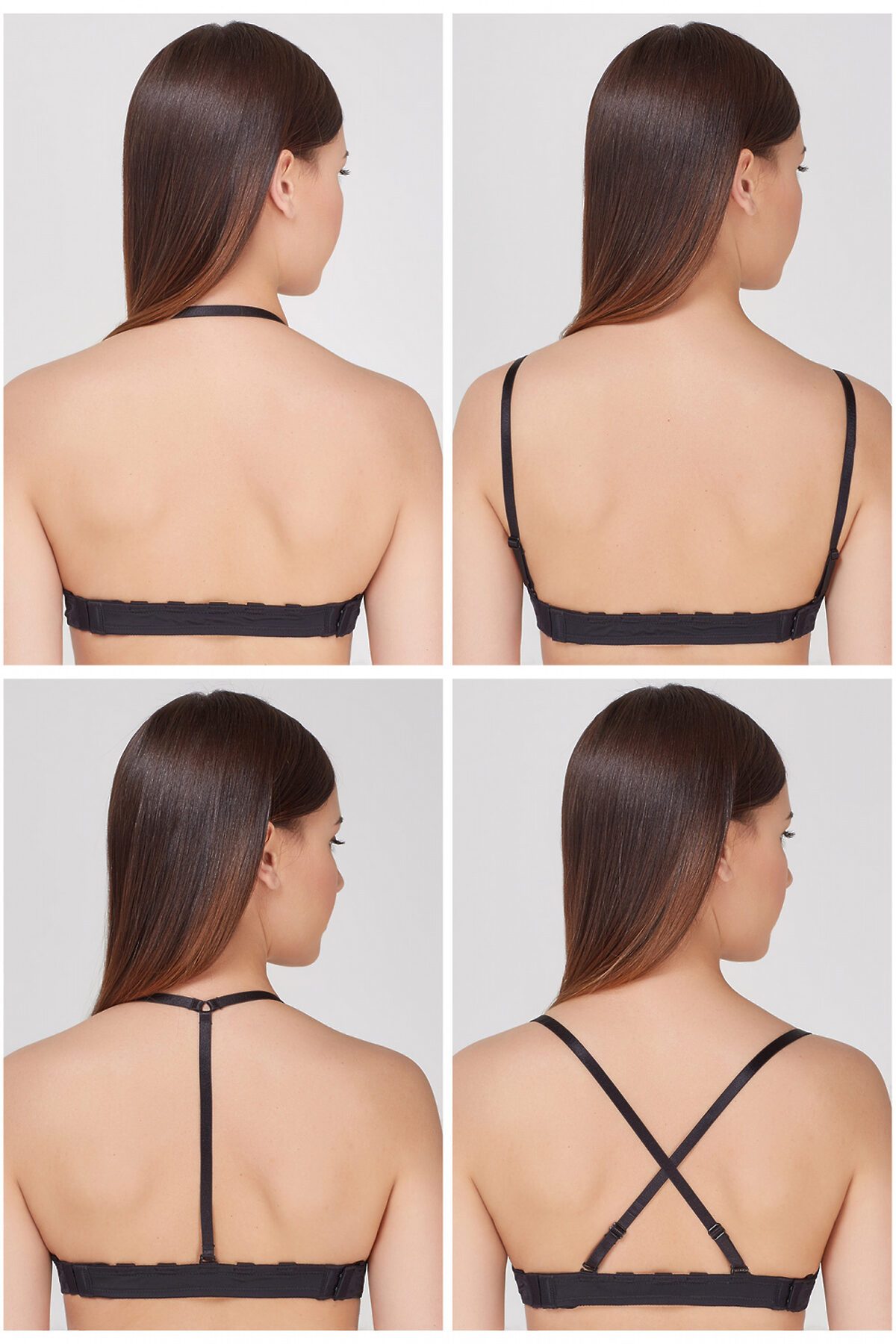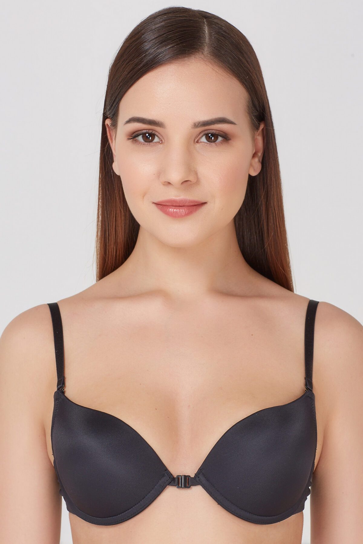 Базовый бюстгальтер из микрофибры. Формованные чашки на косточках, c Push-up для размеров 70AB, 75ABC, 8OB и без Push-up для размеров 70CD, 75DE, 80CDE, 85BCDE. В комплект входят разновидности задней детали (прозрачная лента из силикона, длинная эластичная лента) и бретелей для использования под разными видами одежды. Застежка расположена спереди. Бретели съемные.