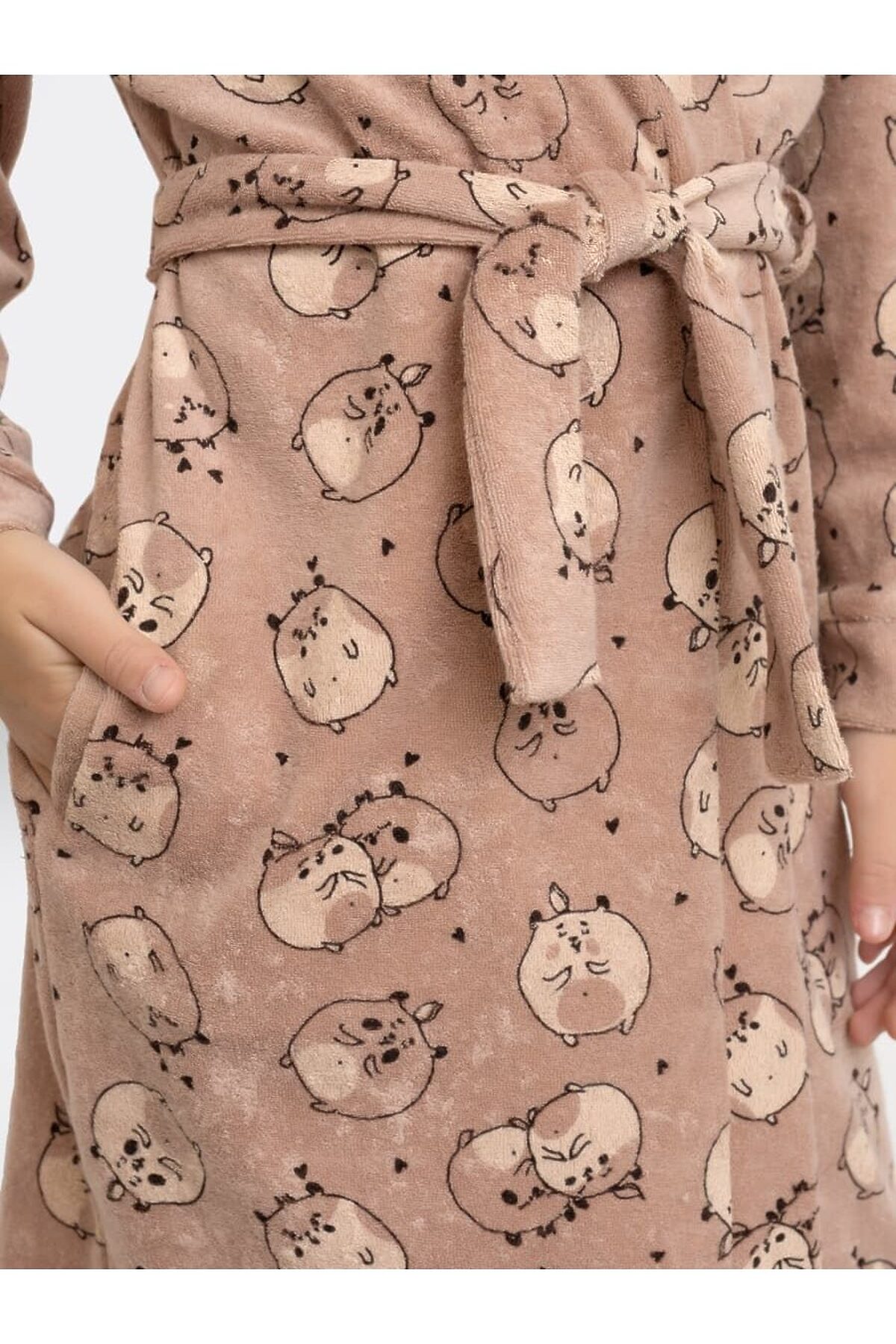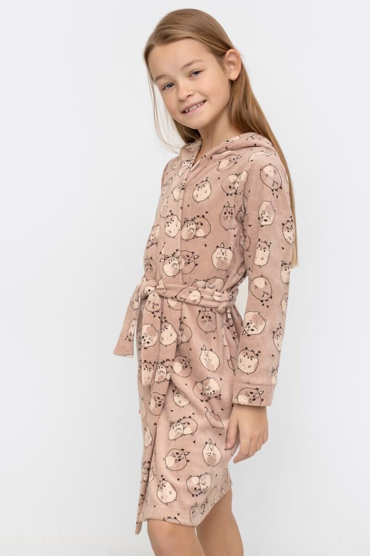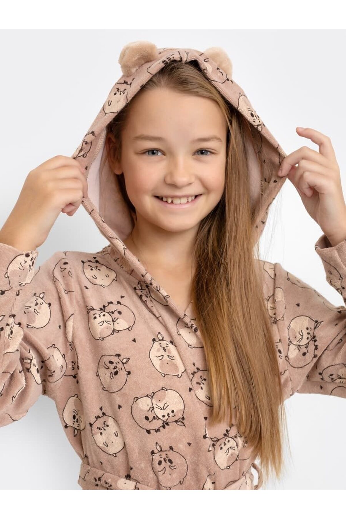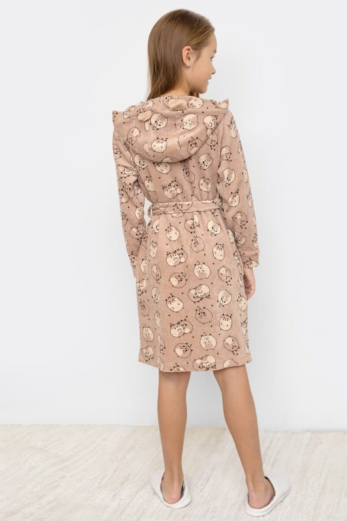 Уютный халат для девочек. Изготовлен из трикотажного махрового полотна. Силуэт прямой, длина ниже коленей. Халат запахивается и завязывается на съемный пояс. Просторный капюшон украшен декоративными деталями. Есть удобные боковые карманы. Длинные рукава с манжетами. Комфортный халатик!