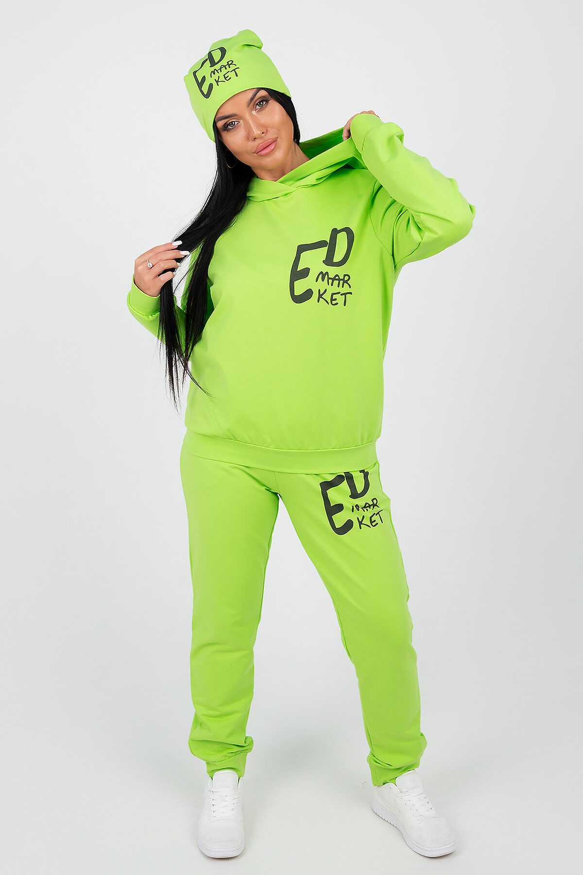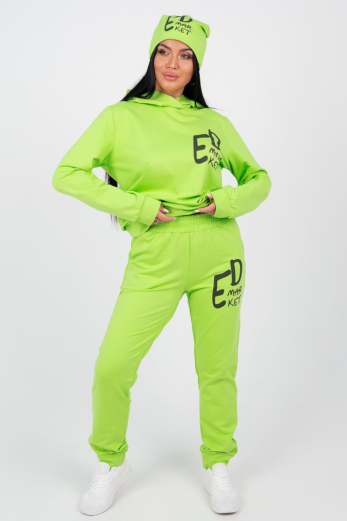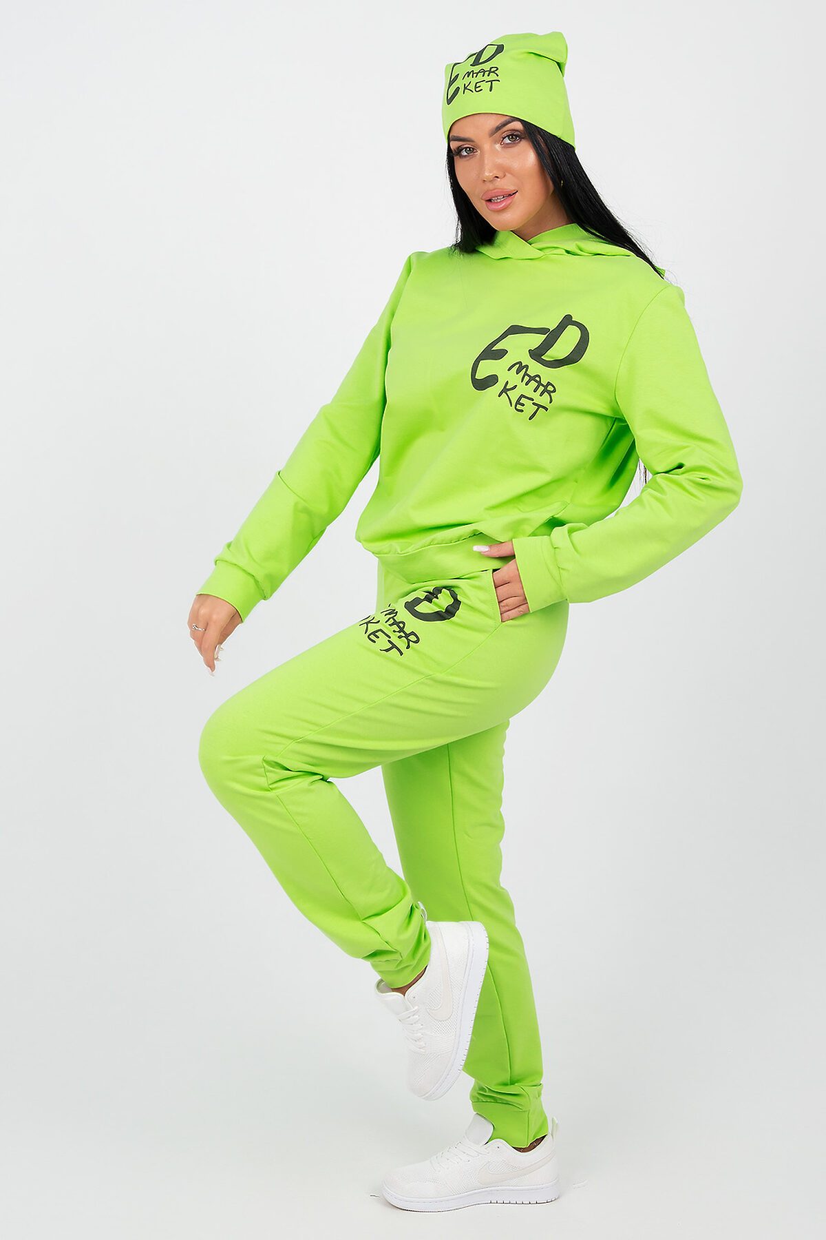 Молодежный спортивный костюм из футера 2х-нитки, состоящий из толстовки, брюк и шапки. Толстовка прямого силуэта, с капюшоном, рукава и низ на манжете. Брюки прямые, с боковыми карманами, удобный пояс на резинке, низок на манжете. На толстовке и передней части брюк контрастная печать. Завершает образ стильная шапка с печатью по центру.