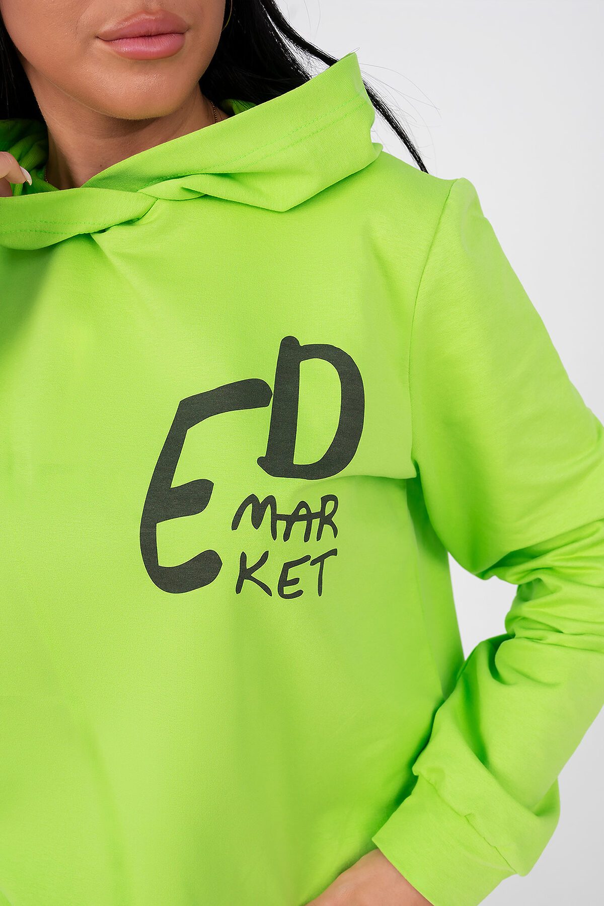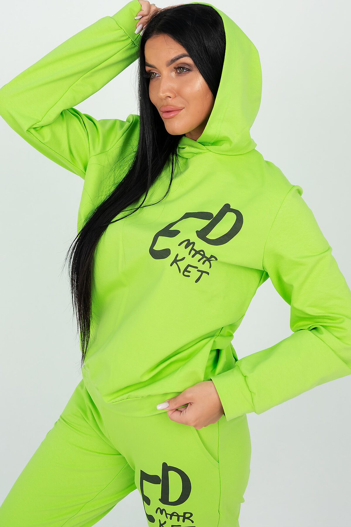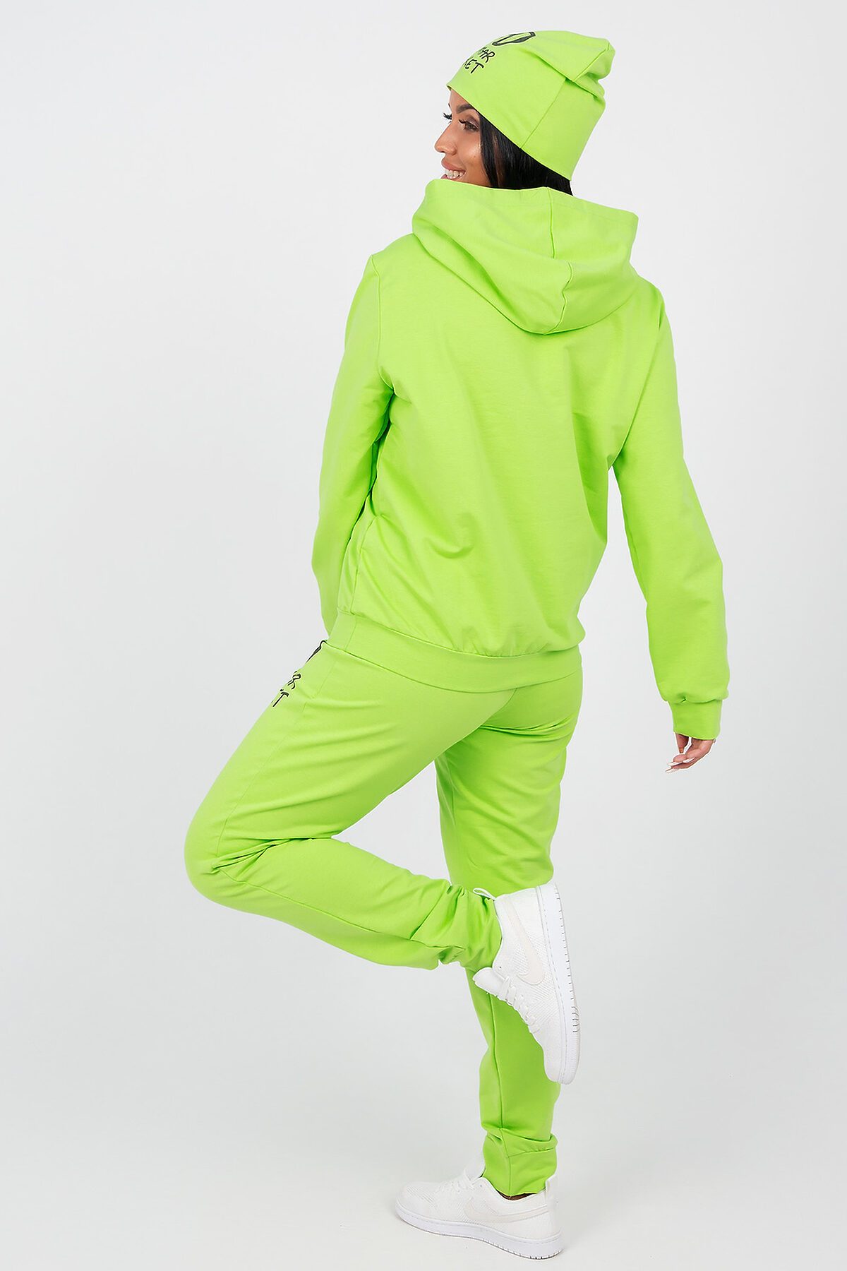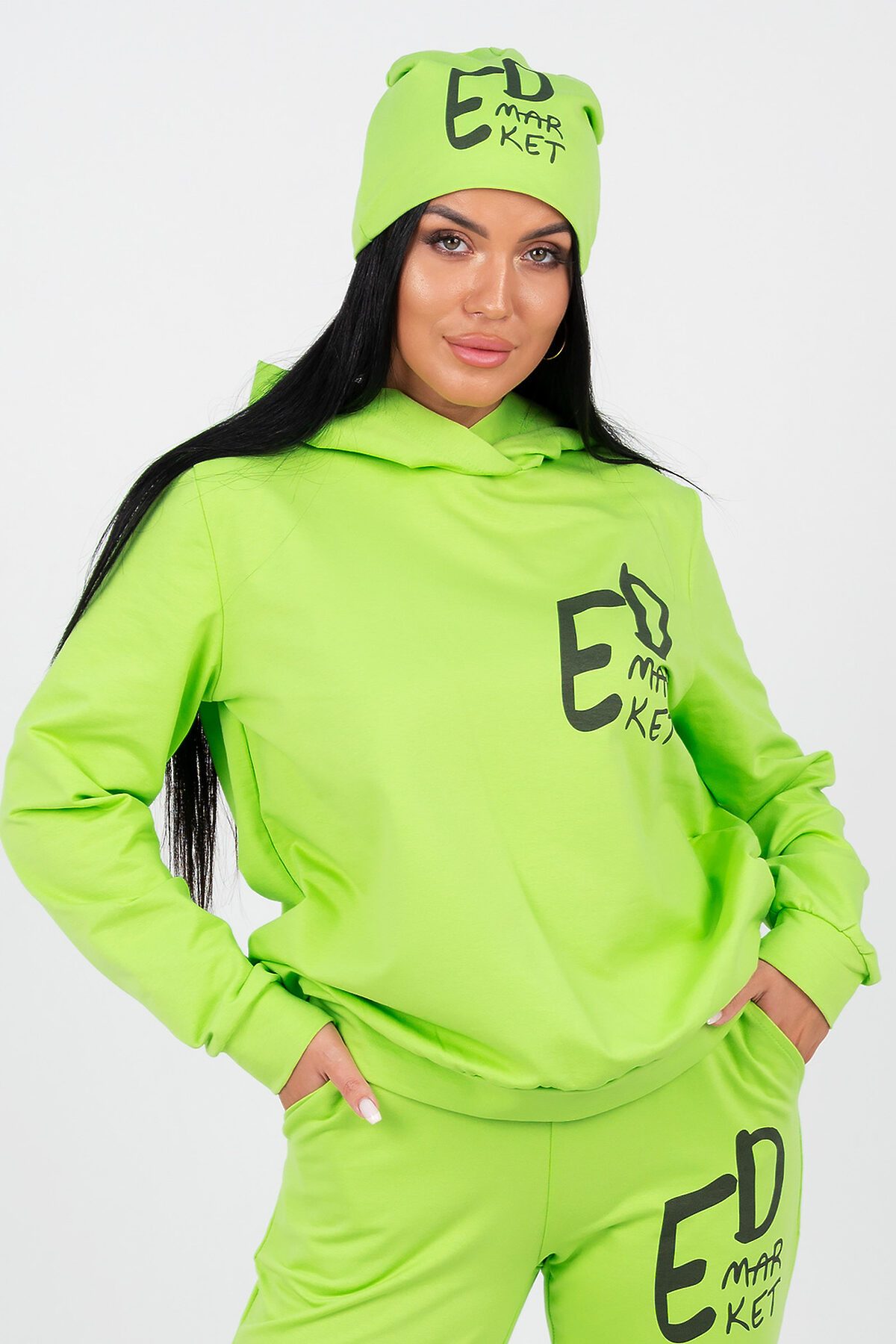 Молодежный спортивный костюм из футера 2х-нитки, состоящий из толстовки, брюк и шапки. Толстовка прямого силуэта, с капюшоном, рукава и низ на манжете. Брюки прямые, с боковыми карманами, удобный пояс на резинке, низок на манжете. На толстовке и передней части брюк контрастная печать. Завершает образ стильная шапка с печатью по центру.