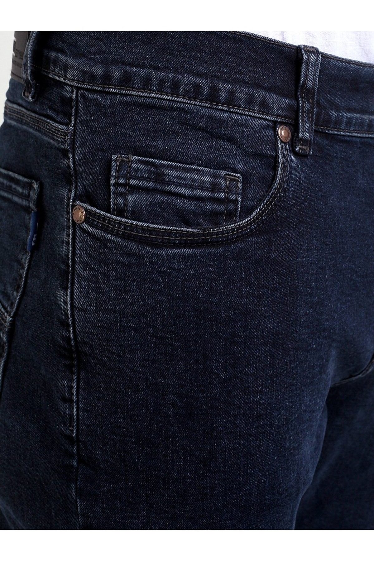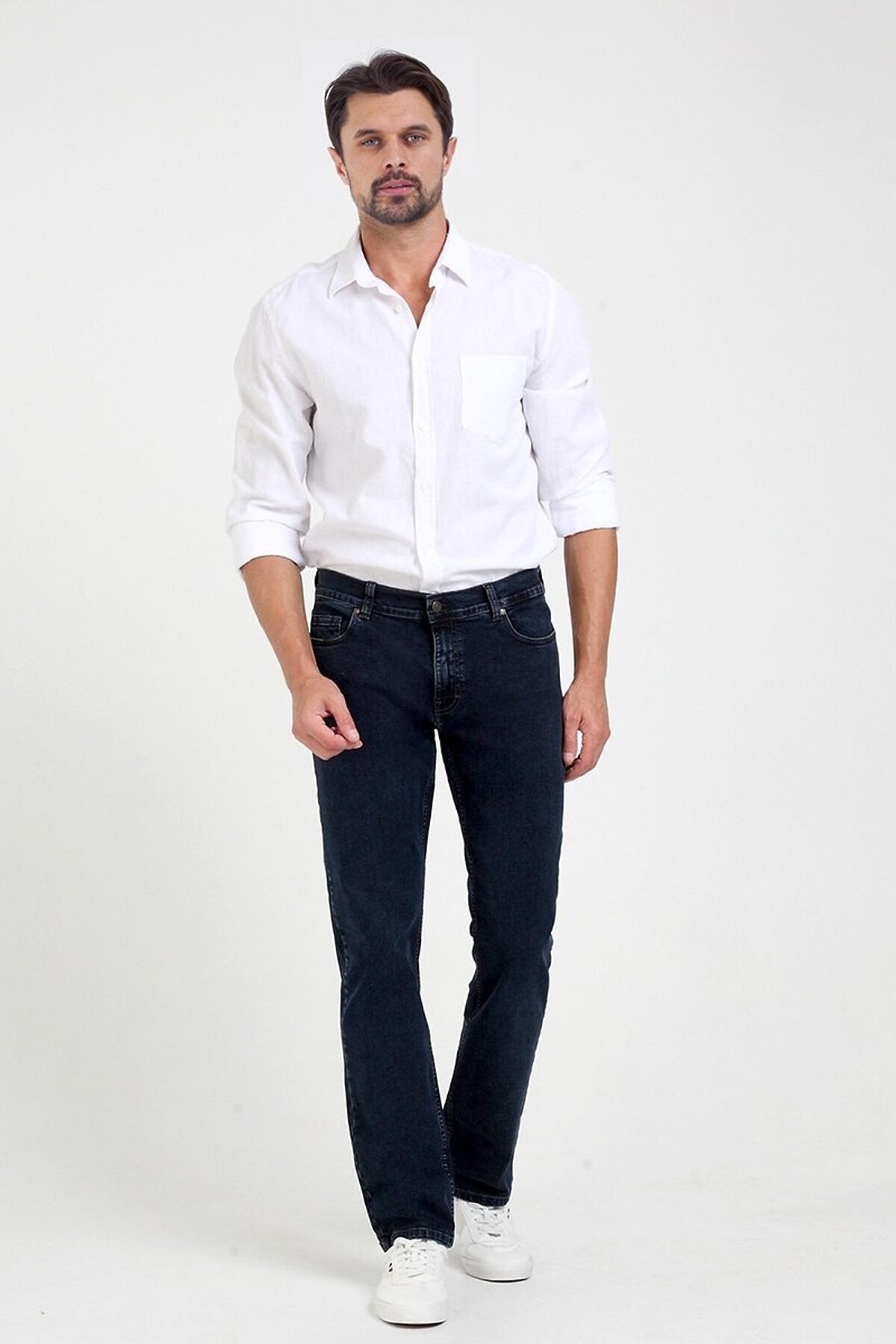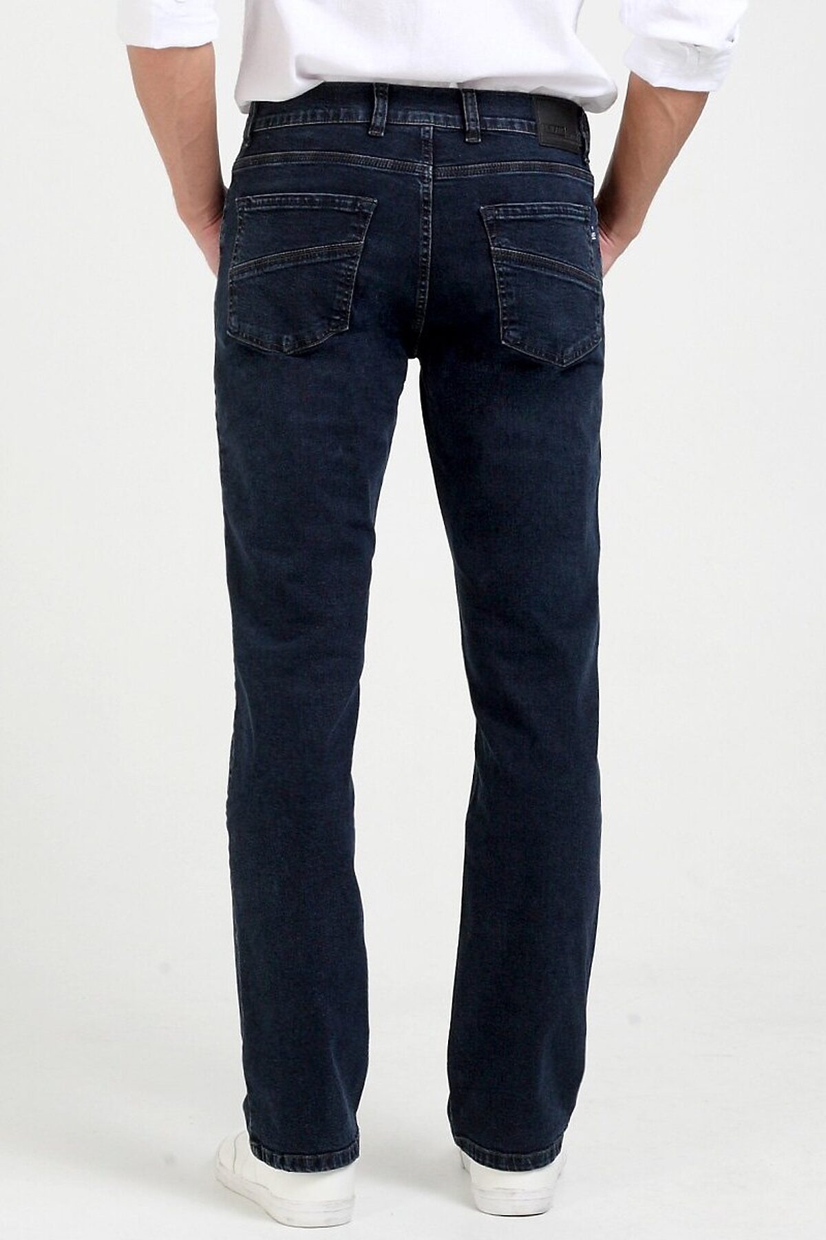 Мужские джинсы с пятью карманами. Посадка Slim fit (облегающие по бедру), средняя талия спереди, высокая сзади. Застежка на молнии. Немного зауженные к низу. Выполнены из слабоэластичной ткани denim comfort stretch (эластичность 30%), цвет ткани Blue/Black(лицевая сторона ткани темно-синяя, изнаночная сторона- черная). Классическая темная стирка с потёртостями только по швам. Параметры указаны для размера 32. Длина внутреннего шва - 83, 0 см.