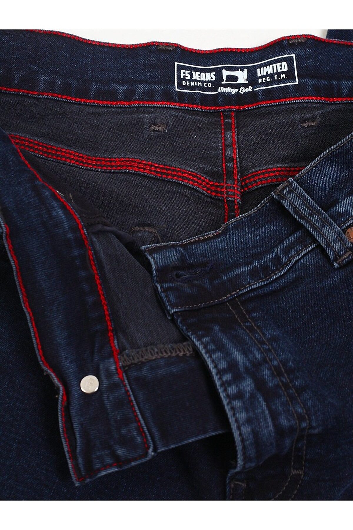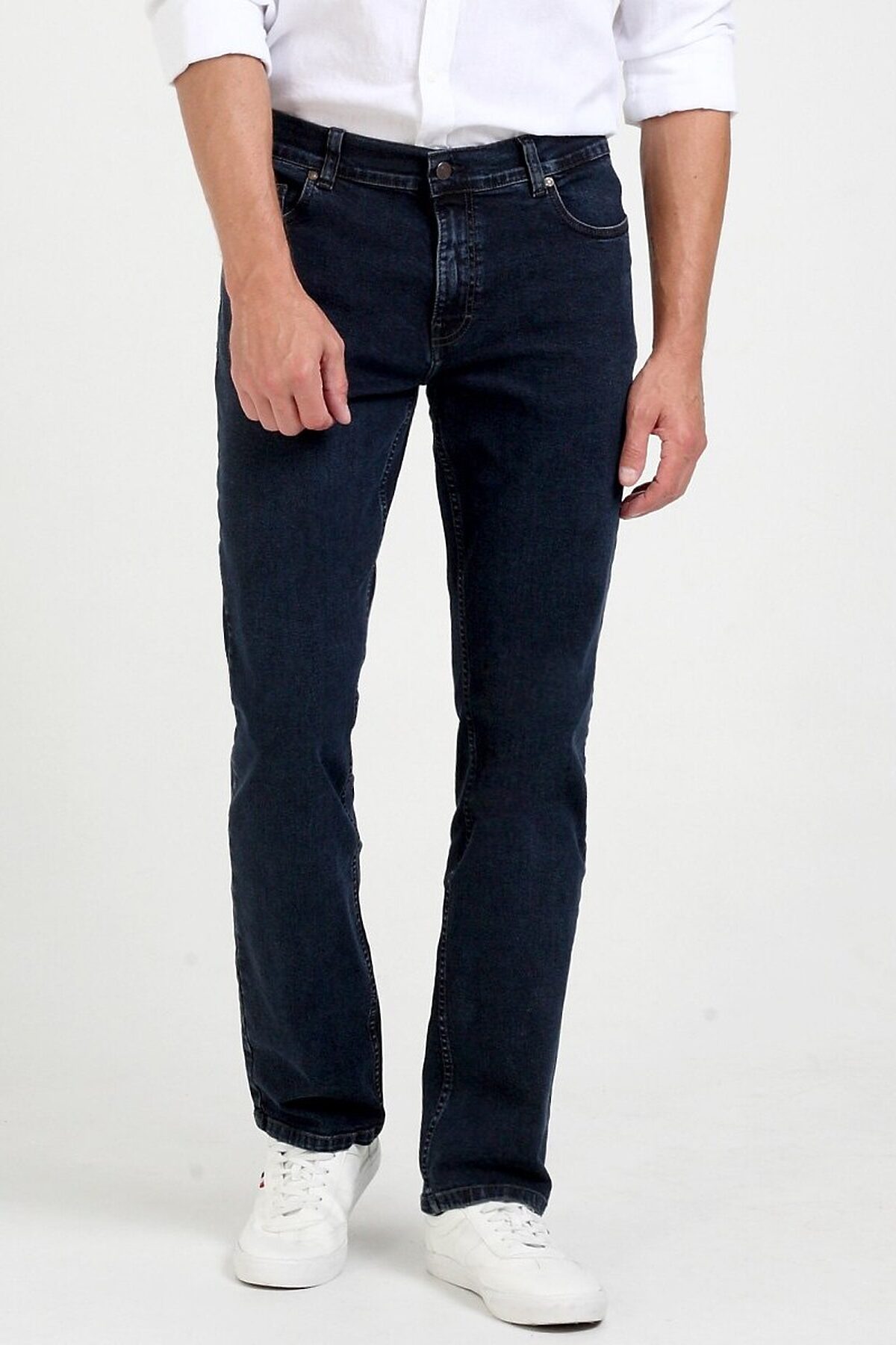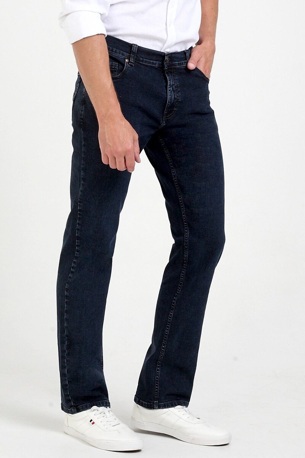 Мужские джинсы с пятью карманами. Посадка Slim fit (облегающие по бедру), средняя талия спереди, высокая сзади. Застежка на молнии. Немного зауженные к низу. Выполнены из слабоэластичной ткани denim comfort stretch (эластичность 30%), цвет ткани Blue/Black(лицевая сторона ткани темно-синяя, изнаночная сторона- черная). Классическая темная стирка с потёртостями только по швам. Параметры указаны для размера 32. Длина внутреннего шва - 83, 0 см.