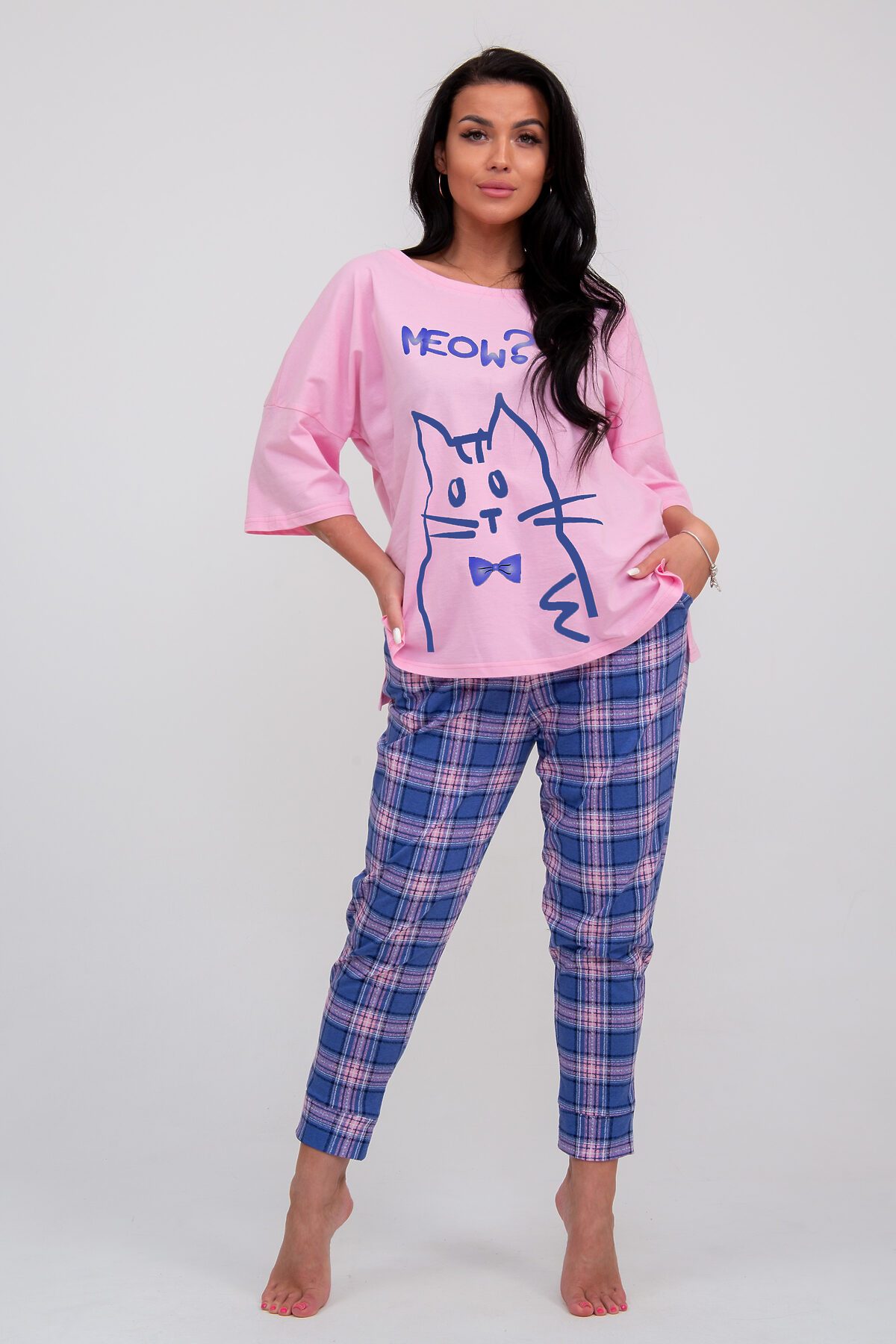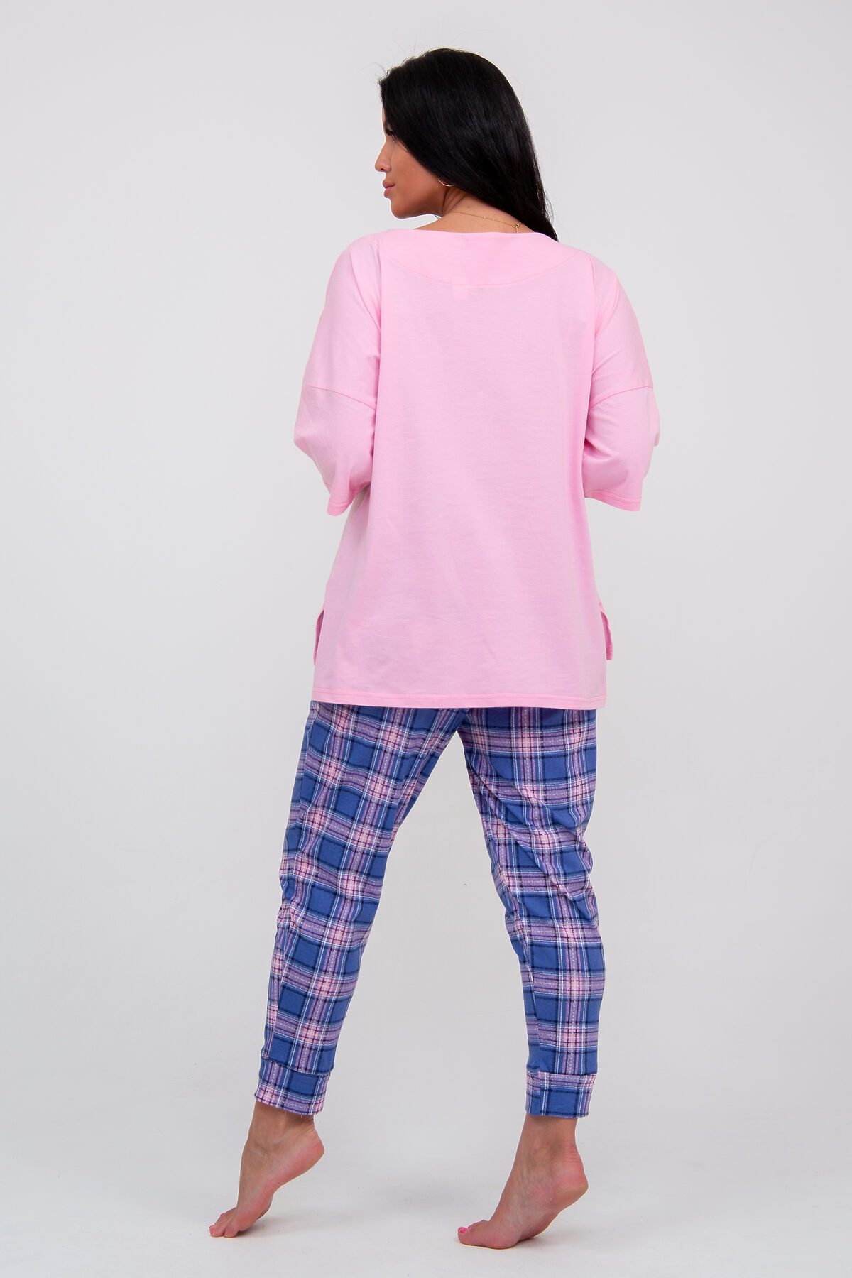 Костюм домашний состоит из футбоки и брюк. Футболка свободного силуэта, рукав три четверти, боковые разрезы. Дизайнерский принт. Брюки с отрезным поясом на резинке, на манжетах Карманы в боковых швах с обтачкой.