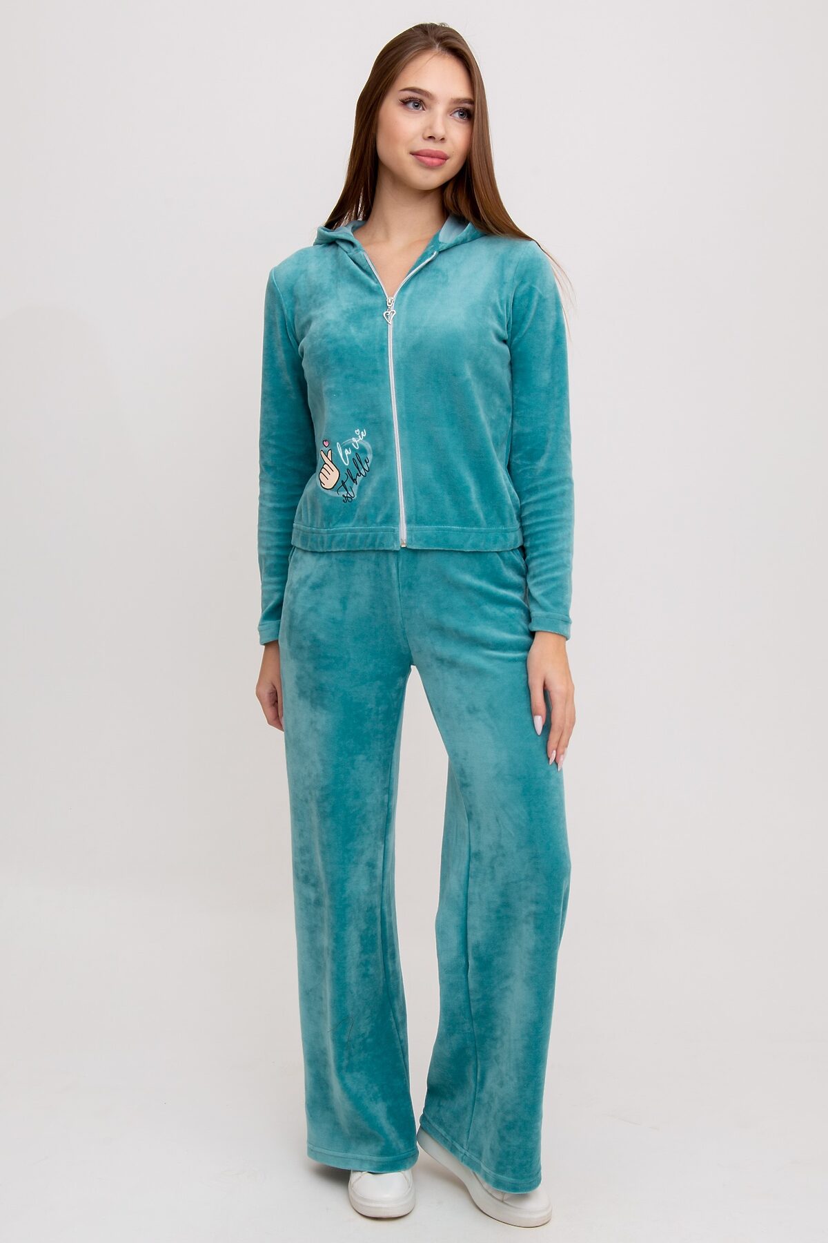 Костюм из велюрового полотна, состоит из толстовки и брюк Толстовка с застежкой на молнии. Капюшон среднего объема. Рукав втачной на манжете. Брюки с поясом на принтованной резинке свободного кроя, широкие внизу.