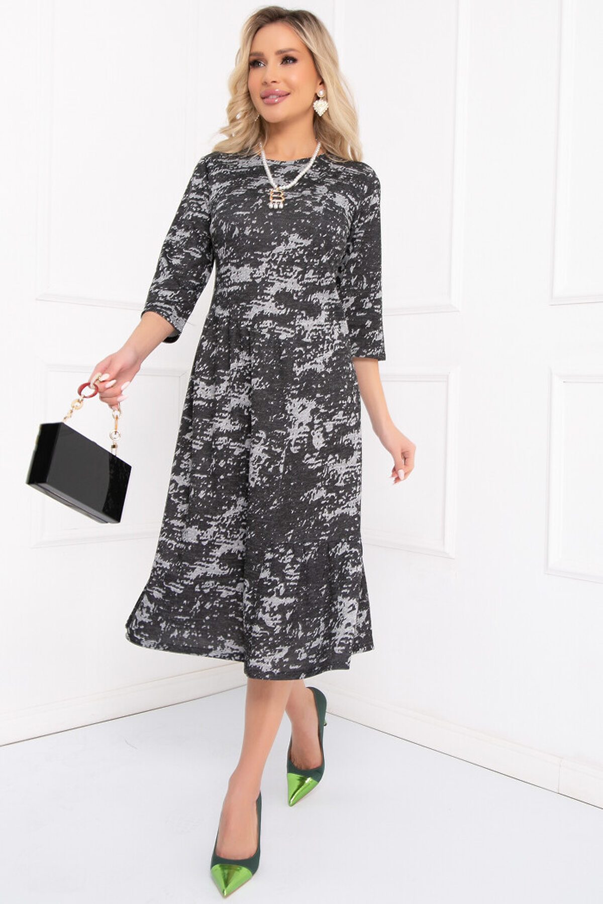 КАМПАНО - платье ассимитричного кроя из меланжевого трикотажа с принтом. Вырез горловины классический округлый, обработан обтачкой. Рукава 3/4, втачные. По низу левой стороны - волан. Удивляйте окружающих вместе с "Белловера"!