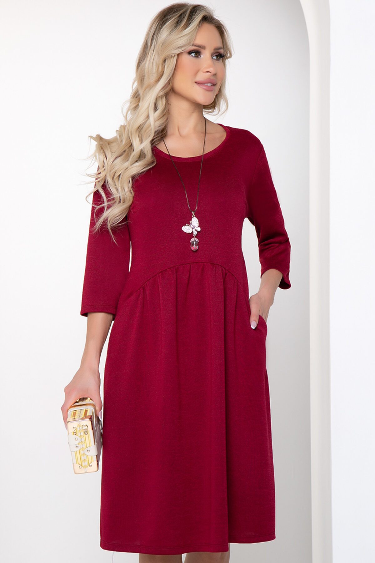 Арнеста – платье свободного силуэта из трикотажа. По талии декоративный подрез с боковыми карманами. Вырез горловины классический круглый, рукав втачной 3/4.