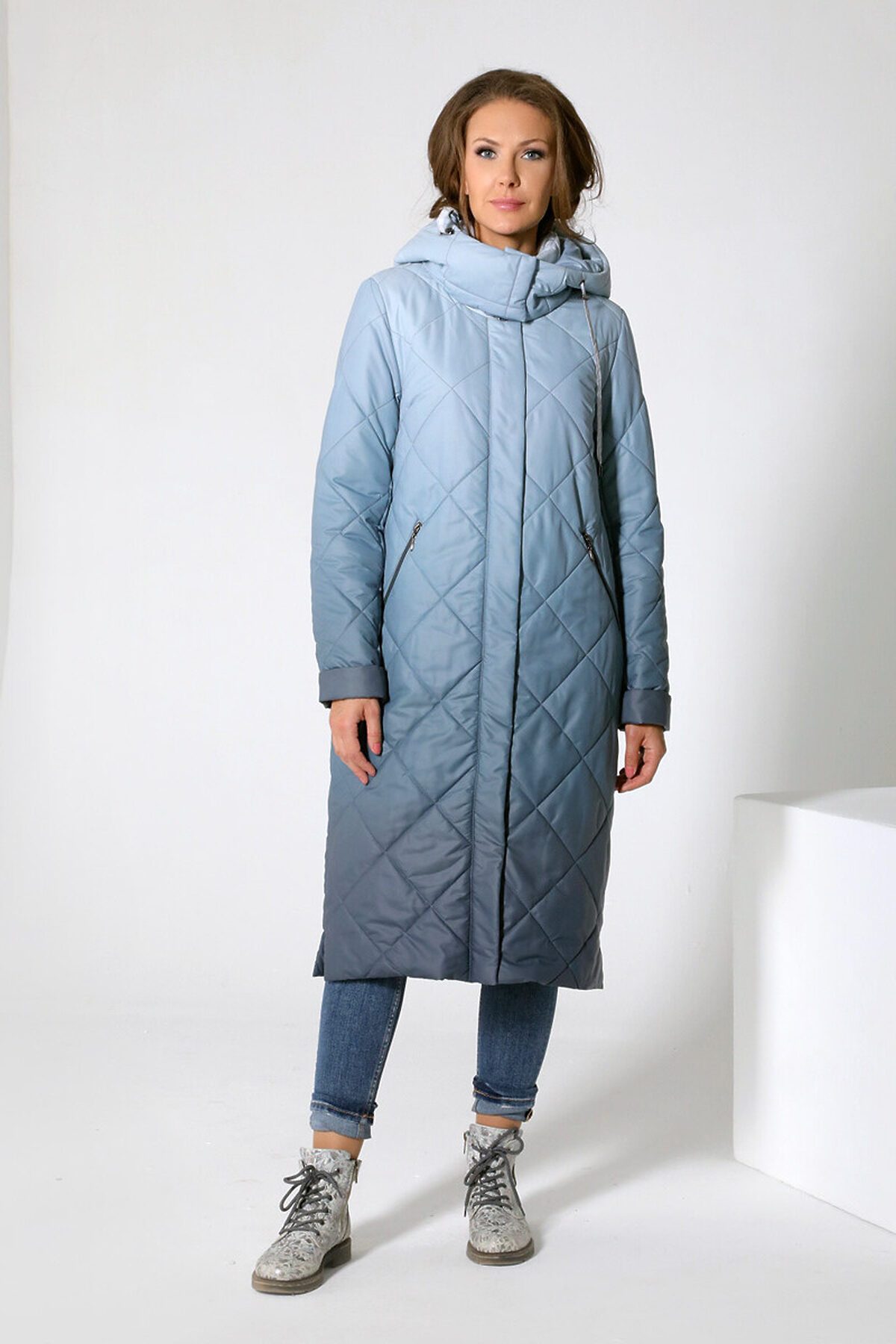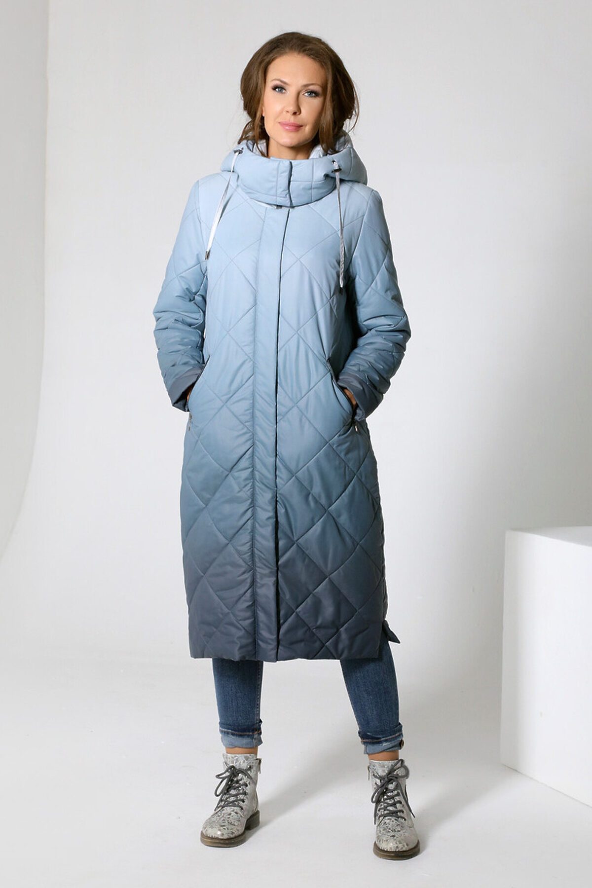 Длинное пальто прямого силуэта с втачными рукавами и застежкой на двухзамковую молнию и кнопки. Воротник - уютная стойка. Капюшон - втачной. Прорезные карманы застегиваются на молнию. Есть внутренний карман, тоже на молнии. Эта лаконичная модель современного кроя выполнена из принтованной ткани "деграде" (переход от одного цвета к другому), что и является определяющим фактором ее актуальности.