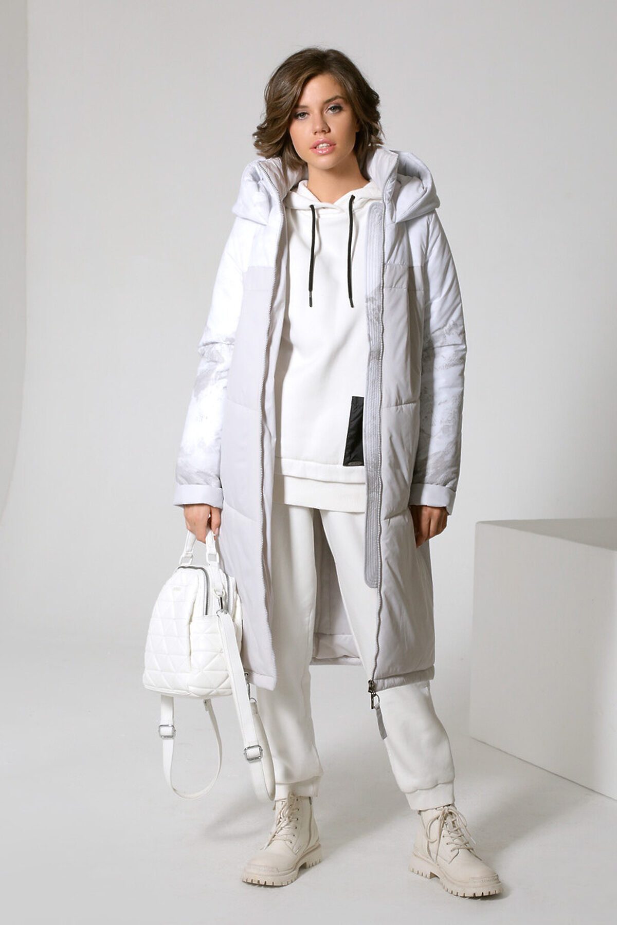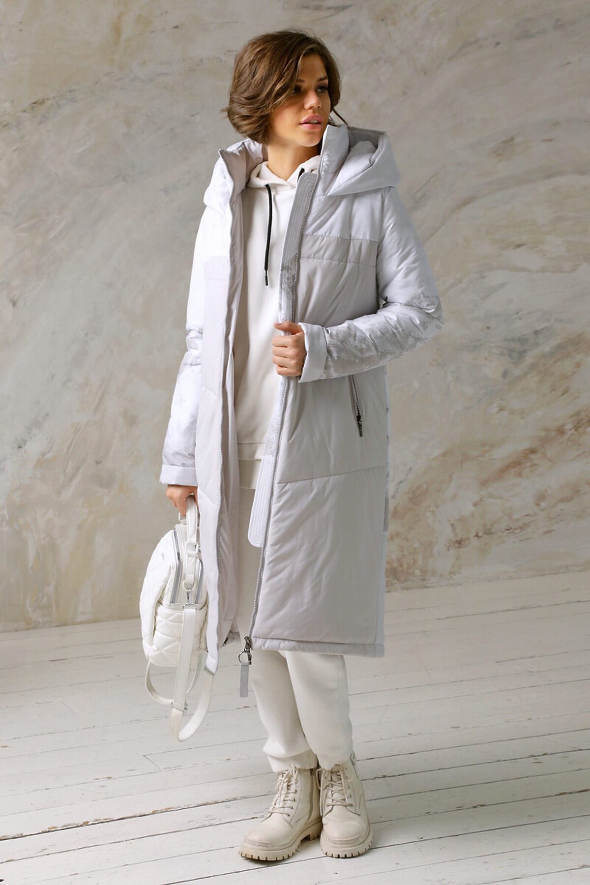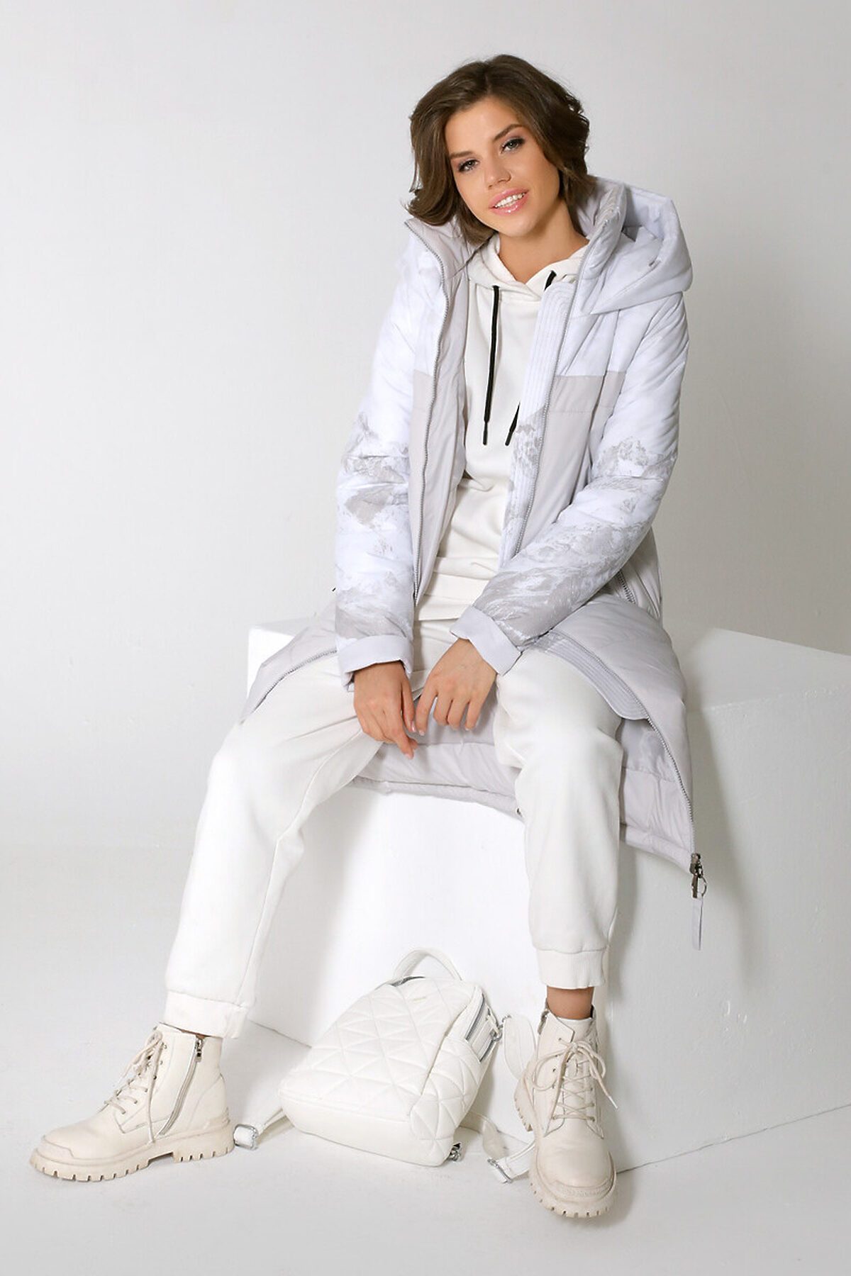 Пальто прямого силуэта с втачными рукавами и застежкой на двухзамковую молнию. Воротник - стойка; капюшон - втачной. Прорезные карманы застегиваются на молнию; есть потайной карман, тоже на молнии. Сочетание принтованной отделки с однотонной тканью, которое является трендовой деталью наступающего сезона, придает изделию не только актуальный, но и очень оригинальный вид.