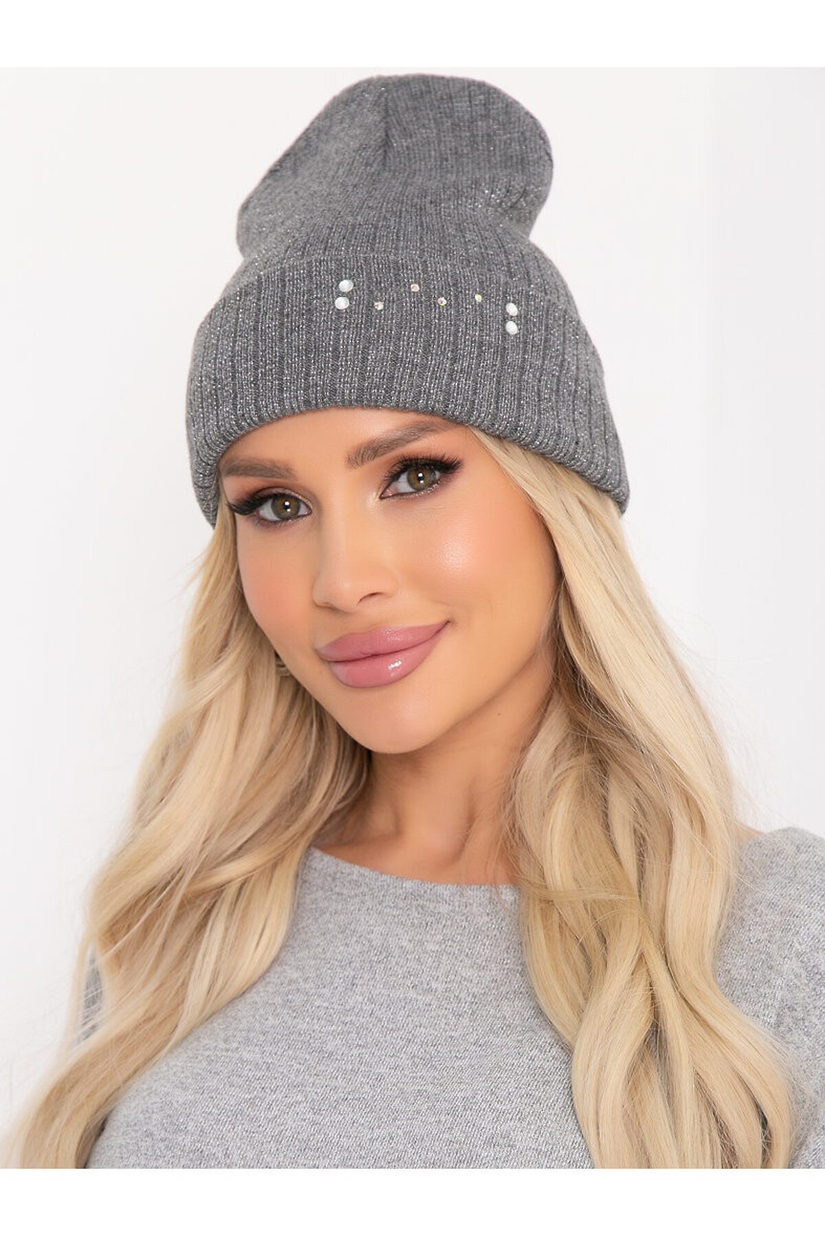 СЕВОЛА - стильная шапка из трикотажного полотна с люрексом с отворотом. По переду – декоративные стразы. Будьте яркой и практичной вместе с "Белловера"!