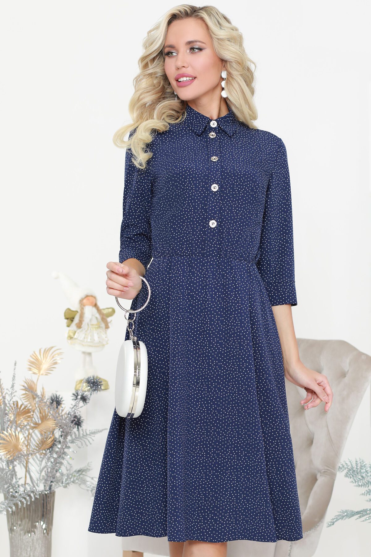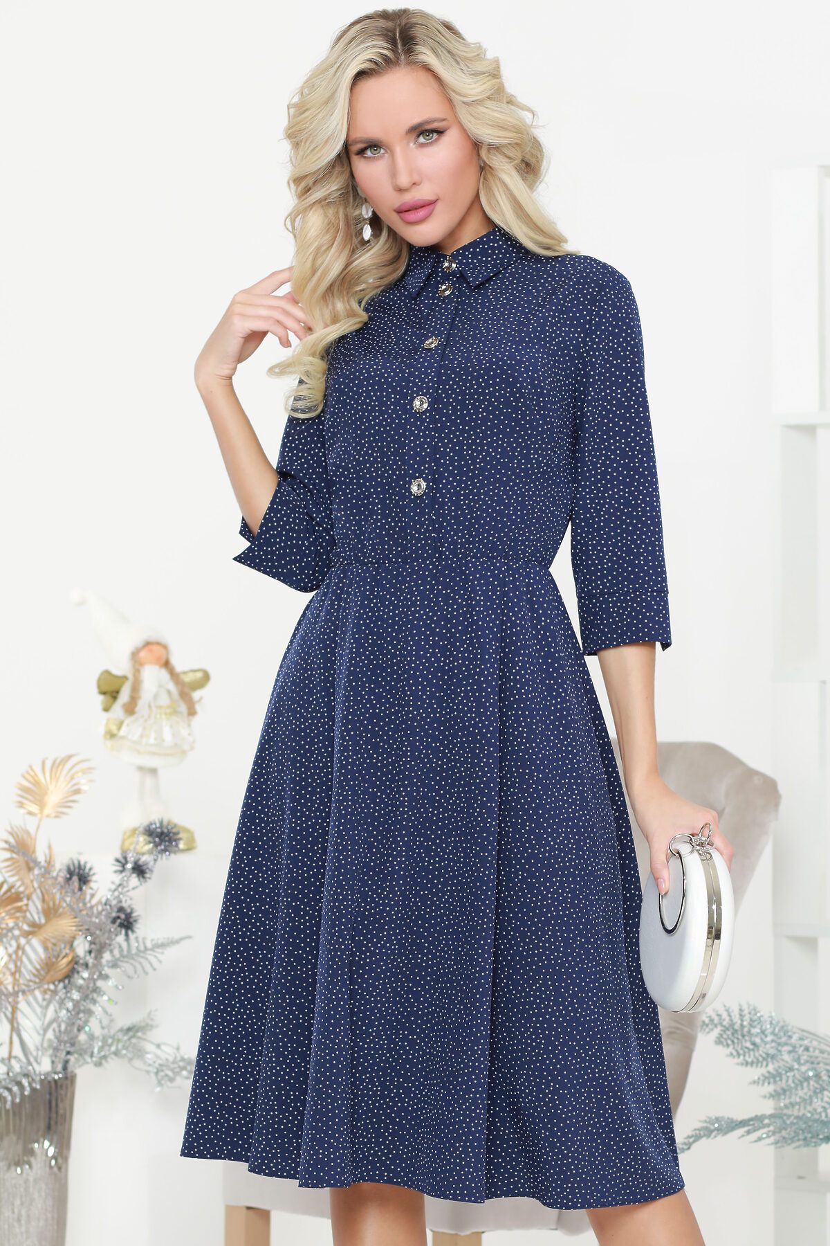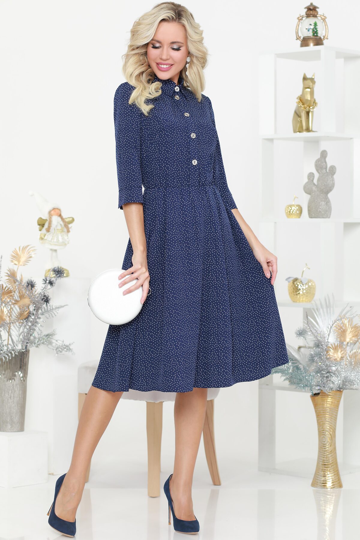 Стильное повседневное платье с рубашечной застежкой до пояса и отложным воротничком выглядит элегантно и строго. Рукав длиной три четверти заканчивается манжетом без застежки. Умеренно расклешенная юбка средней длины удобна в повседневной жизни. Длина: 44 размер - 108 см 46 размер - 108 см 48 размер - 109 см 50 размер - 109 см 52 размер - 110 см 54 размер - 110 см Рост модели на фотографии 170 см. Параметры модели: 88 х 63 х 96 см.