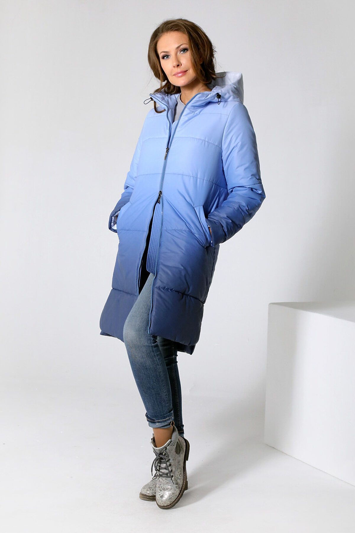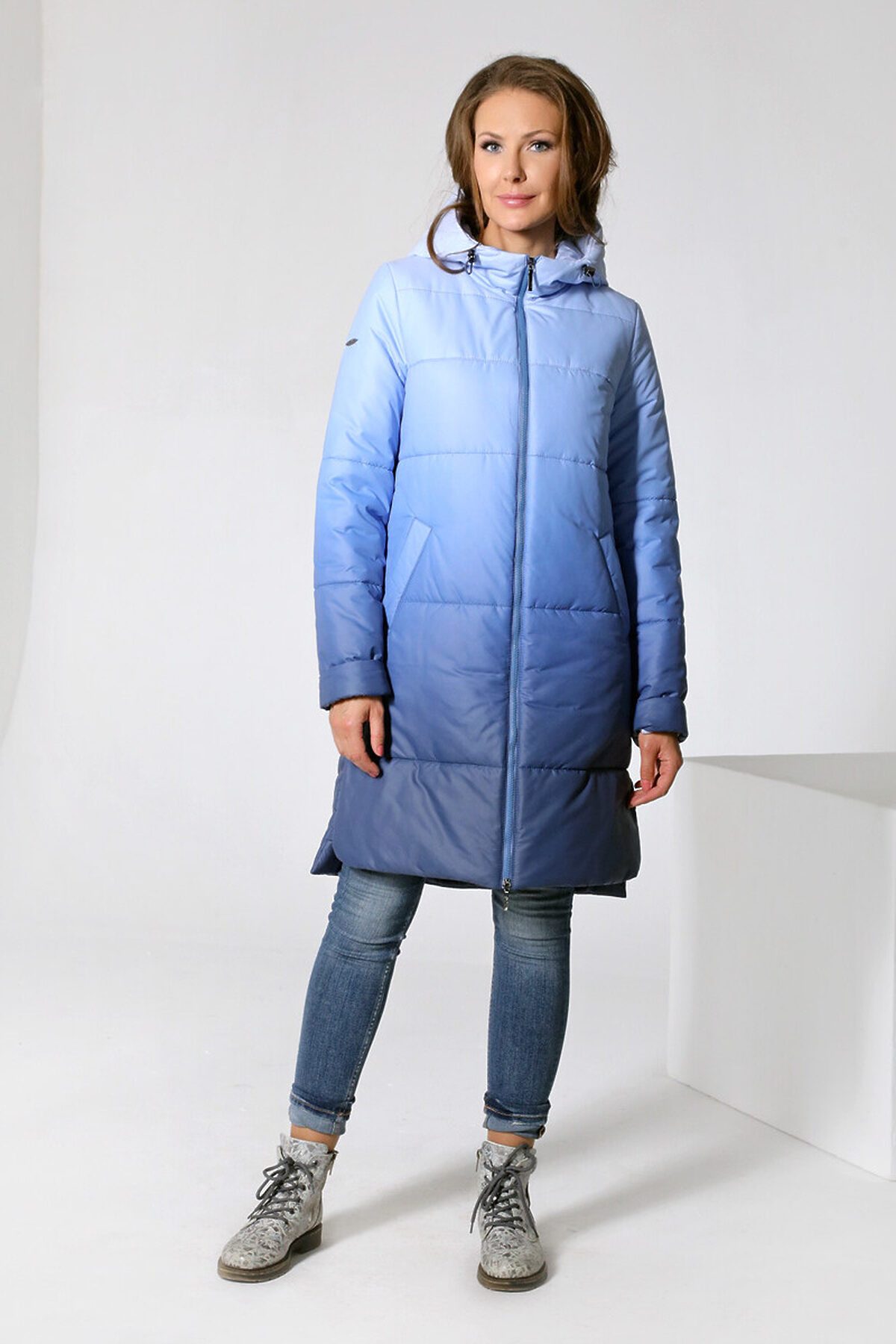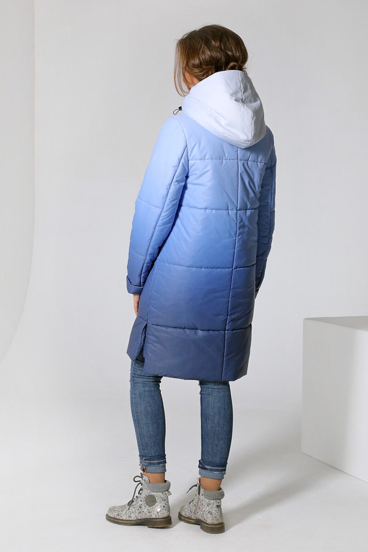 Пальто прямого силуэта с втачными рукавами и застежкой на двухзамковую молнию и кнопки. Воротник - стойка, переходящая в капюшон. Карманы - прорезные . Есть внутренний карман на молнии. Эта лаконичная модель современного кроя выполнена из принтованной ткани "деграде" (переход от одного цвета к другому), что и является определяющим фактором ее актуальности.