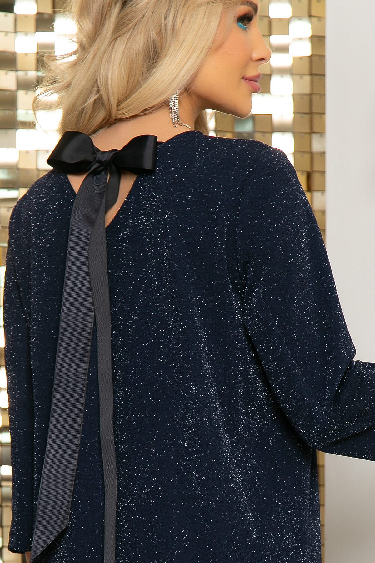 Дизайнерское платье длины миди в красивом мерцающем синем оттенке. Платье прямого кроя создано для любительниц комфорта, потому как не облегает фигуру. По спинке на юбке есть разрез. Акцент в данном платье обращен на спину, где V-образный вырез завязывается на бант из репсовой ленты. При желании можно подчеркнуть линию талии поясом из основной ткани, который входит в комплект.