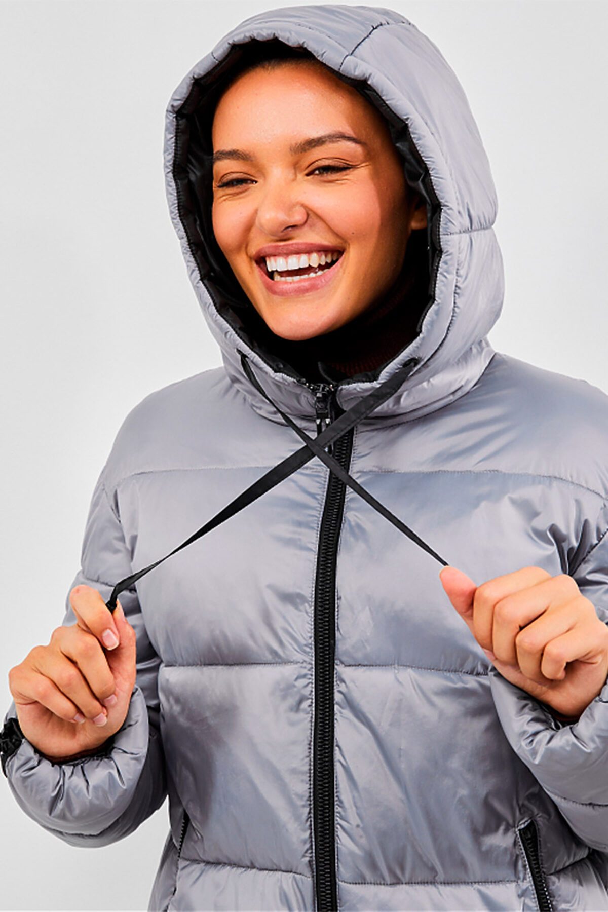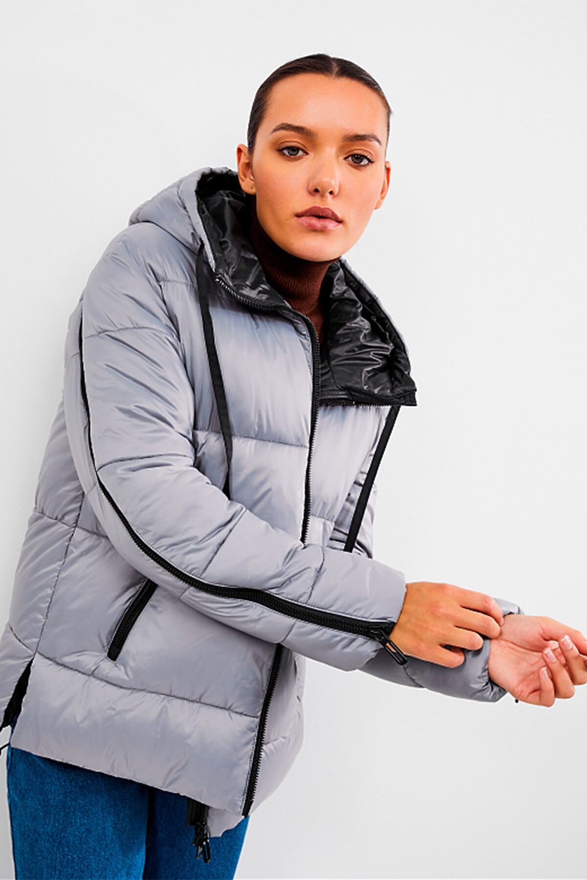 Стильный короткий пуховик с контрастной черной отделкой. Изделие свободного силуэта с центральной застежкой на молнию. По рукавам идут декоративные молнии черного цвета, по низу рукава, внутри, имеется ветрозащитная утяжка. Имеются два удобных прорезных кармана на молнии. По низу изделия имеется утяжка. Есть внутренний карман. Ткань изделия обработана водоотталкивающей пропиткой. Утепление Био-пух 300 гр., рекомендуемый температурный режим от -15°C до +0°C. Длина изделия: 65 см. Длина рукава: 64 см.