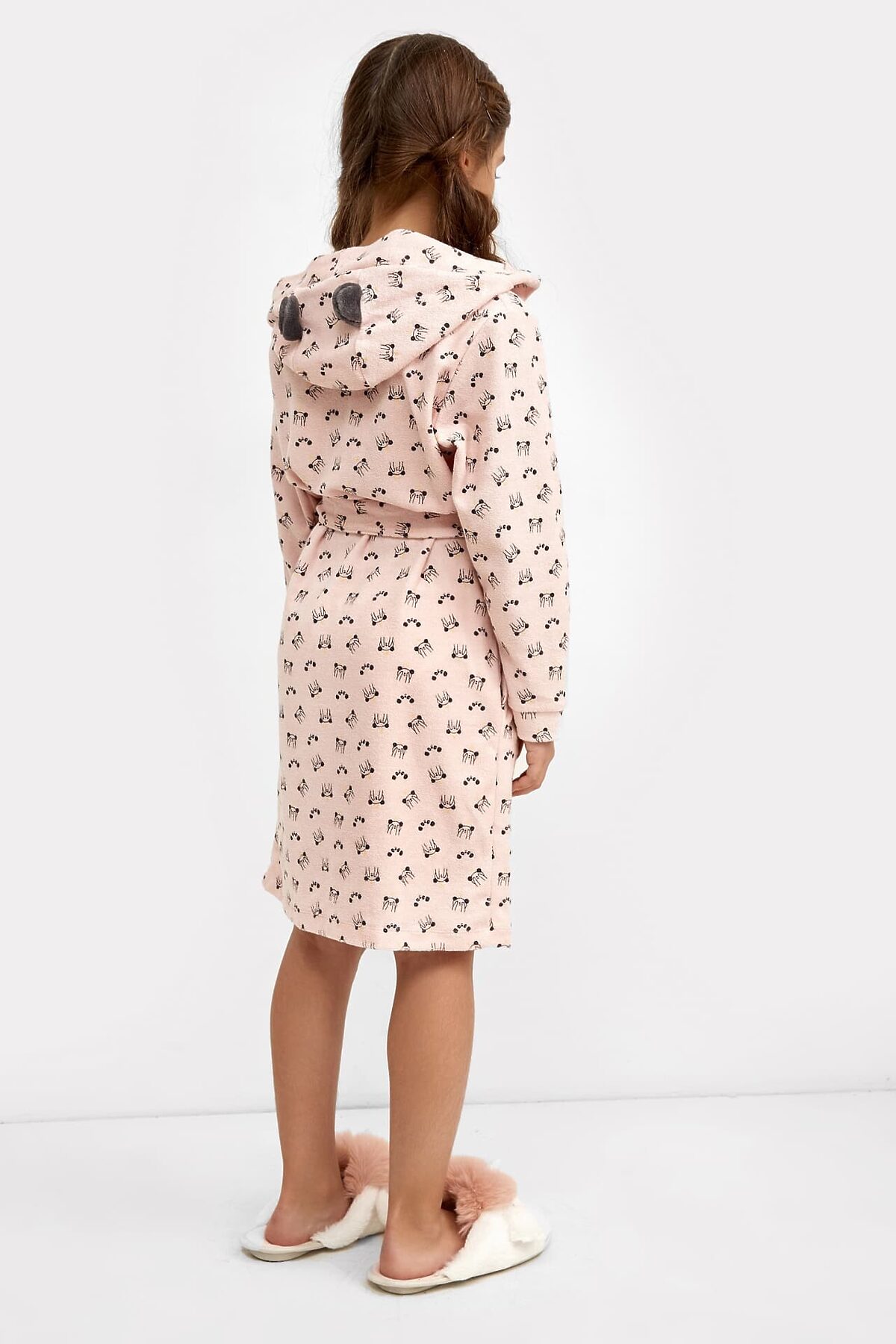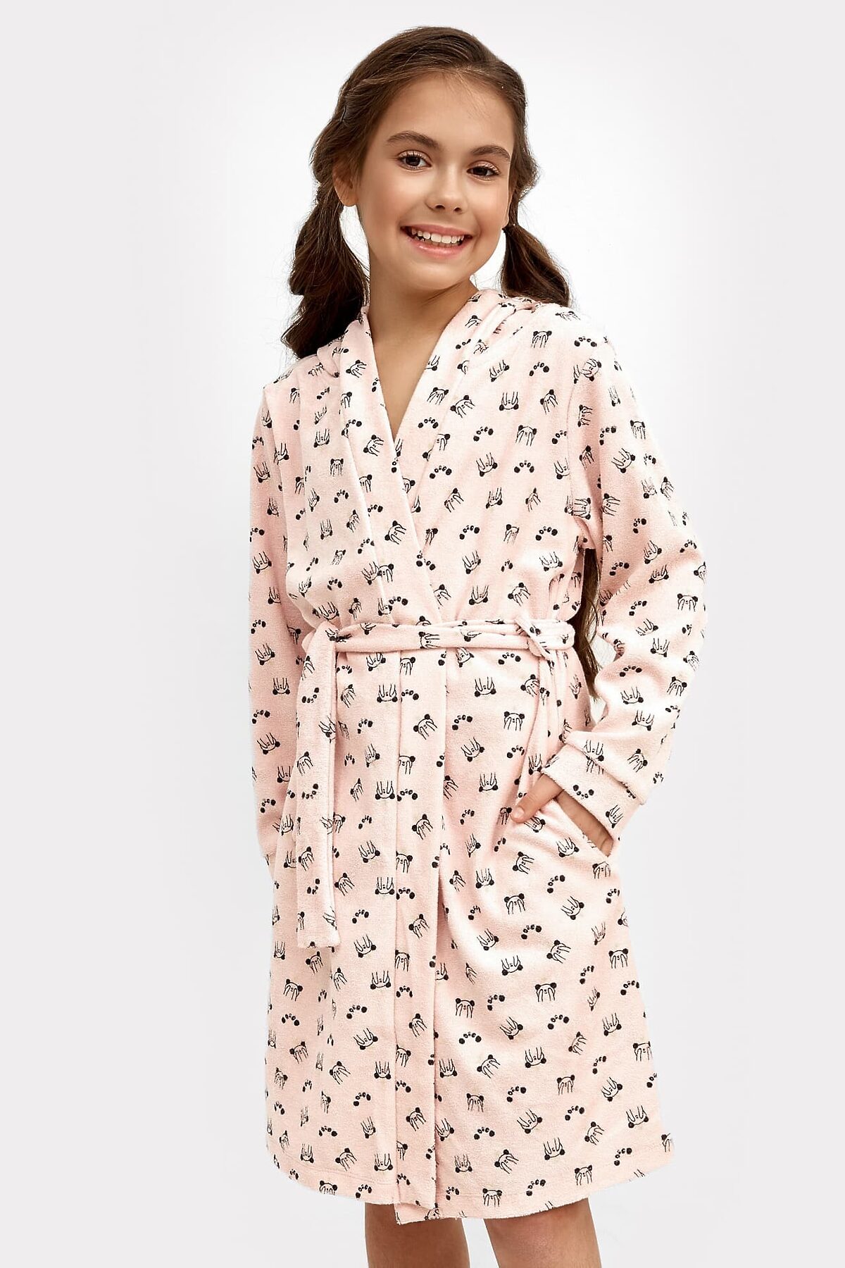 Уютный халат для девочек. Изготовлен из трикотажного махрового полотна. Силуэт прямой, длина ниже коленей. Халат запахивается и завязывается на съемный пояс. Просторный капюшон украшен декоративными деталями. Есть удобные боковые карманы. Длинные рукава с манжетами. Комфортный халатик!