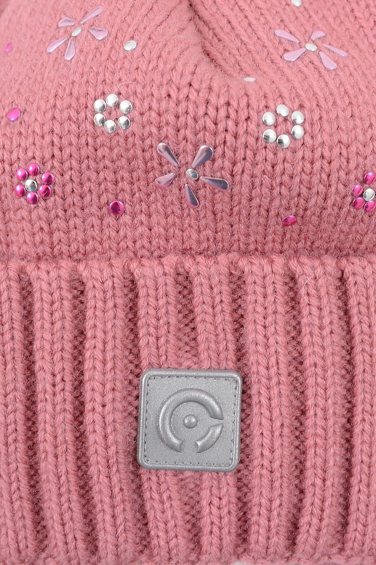 Шапка на широких завязках с высоким отворотом и мягким подкладом из интерлока. Спереди украшена стразами. На отвороте прикреплён светоотражатель, который обеспечивает дополнительную безопасность в тёмное время суток. На макушке - меховой помпон.
