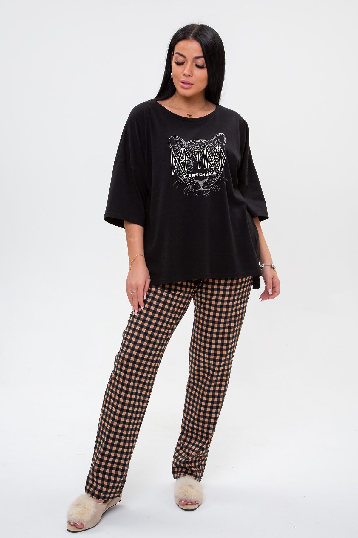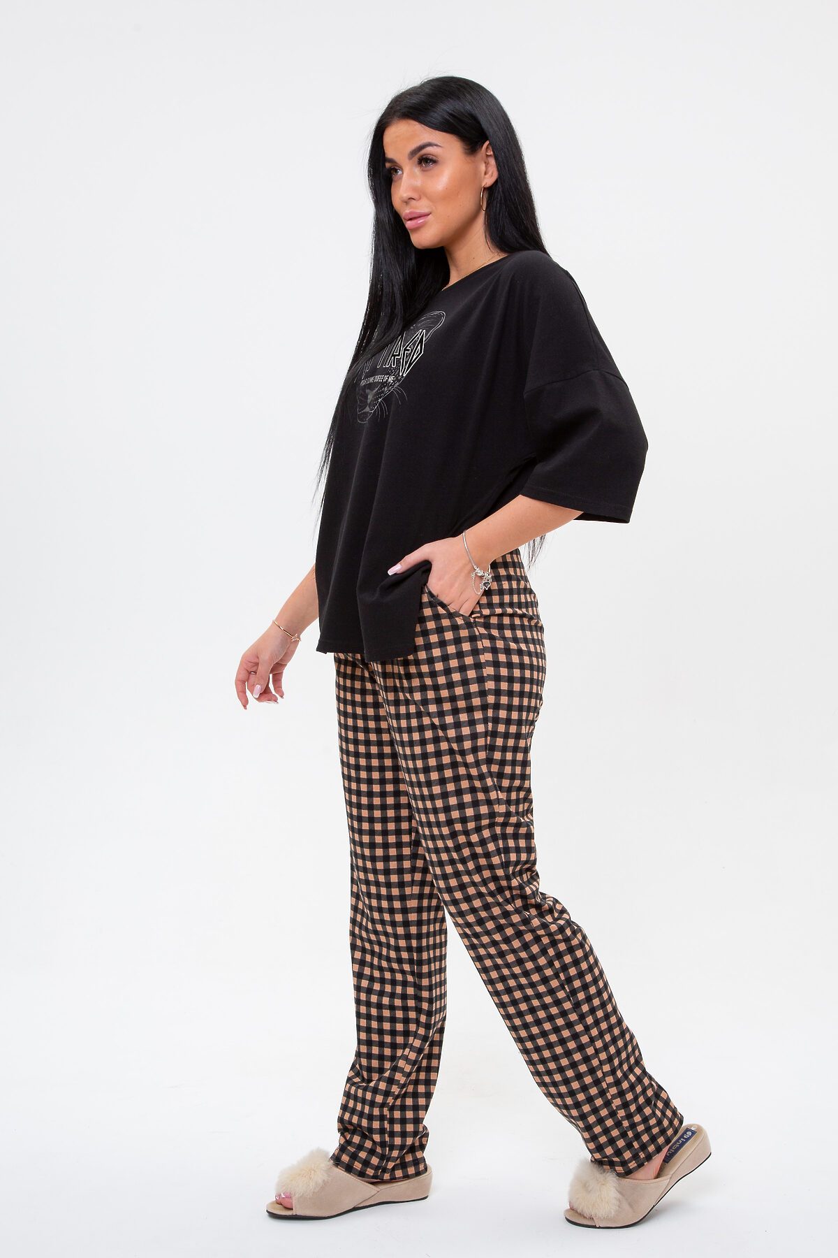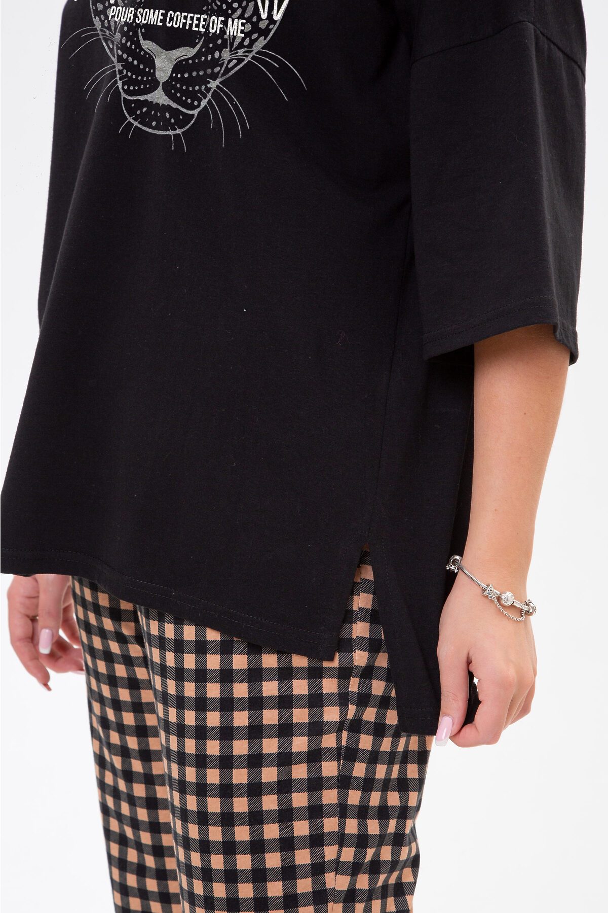 Костюм состоит из футболки и брюк. Футболка со спущенной проймой и рукавом три четверти, задекорирована дизайнерским принтом, в боковых швах футболки имеются разрезы. Брюки сводобного силуэта с отрезным поясом на резинке и прорезными карманами. Правильная посадка
