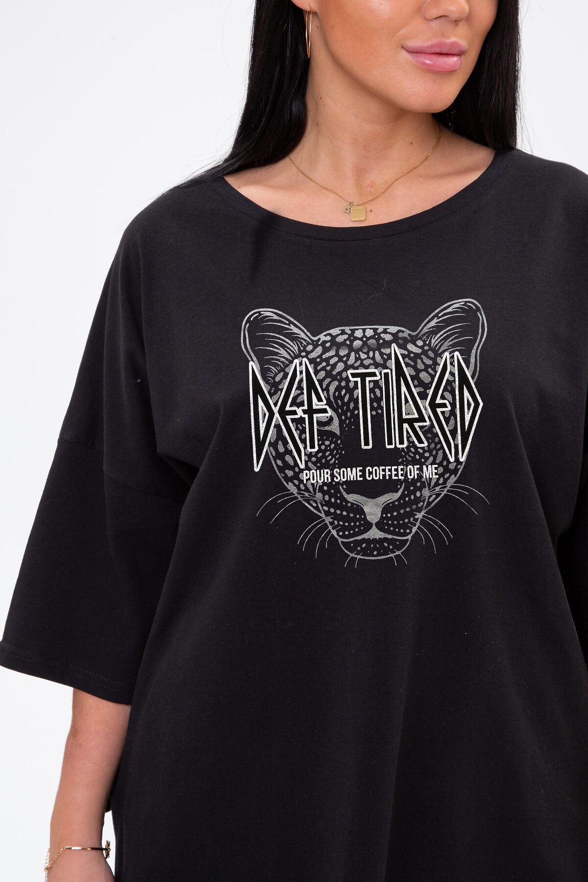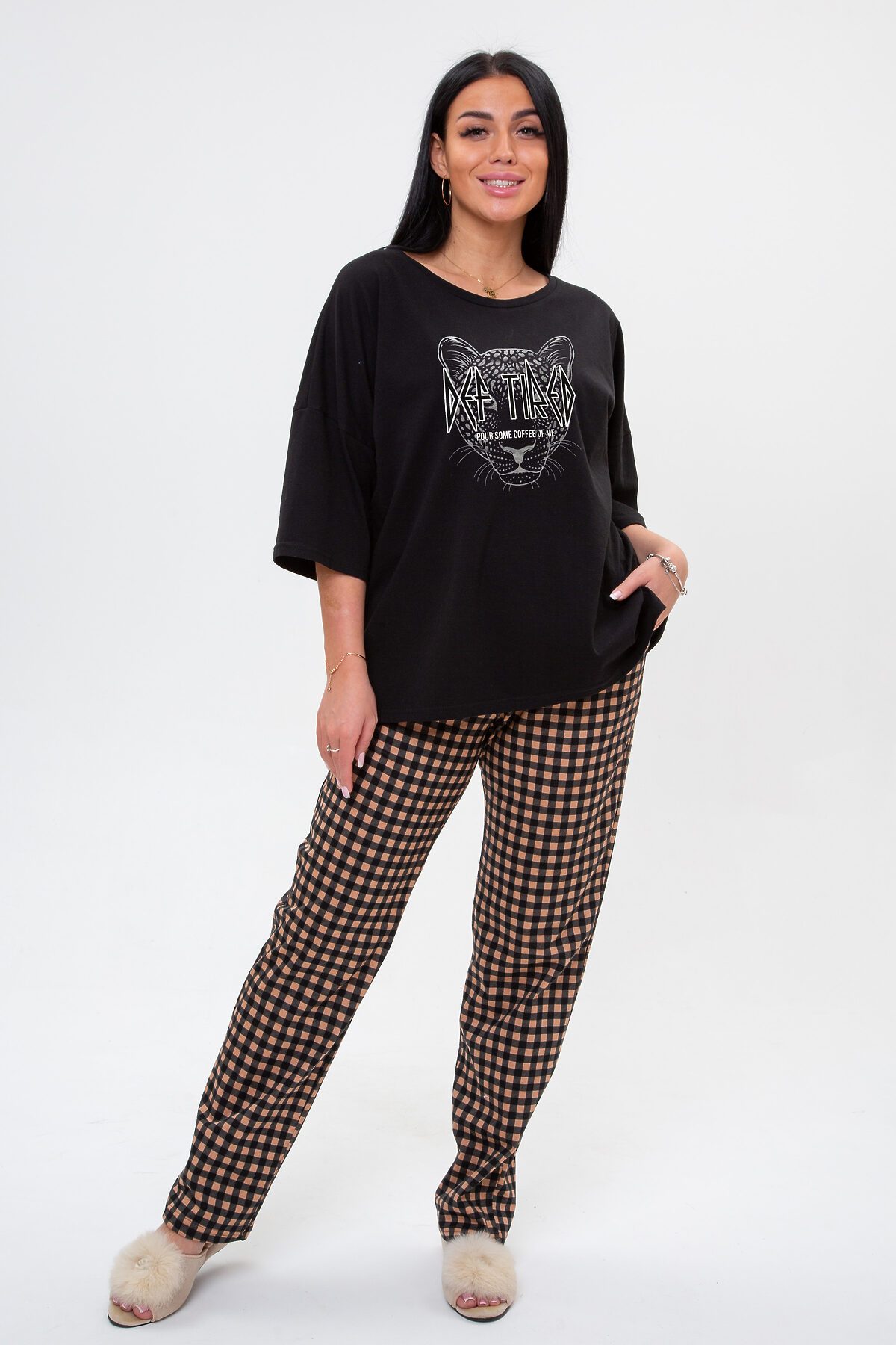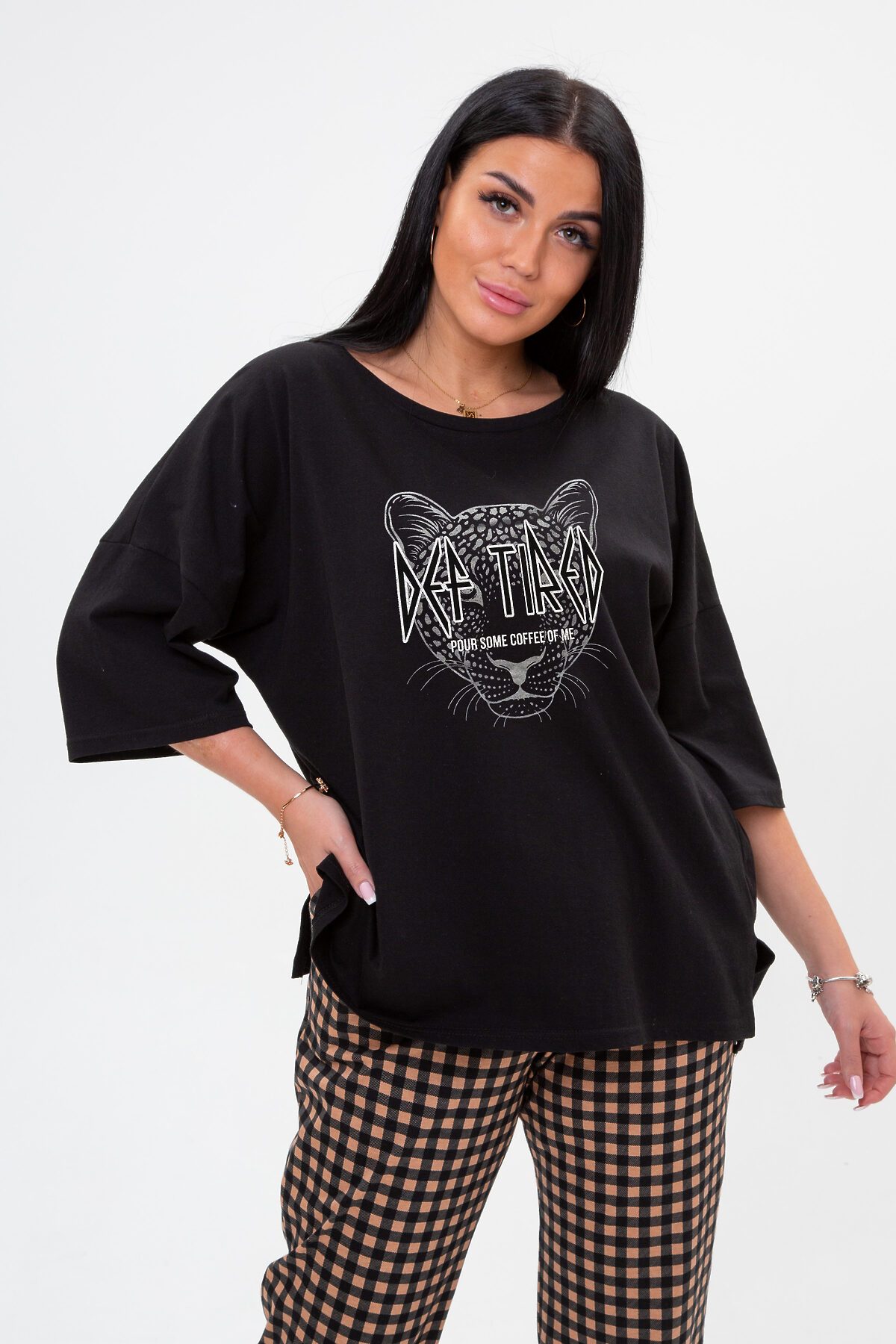 Костюм состоит из футболки и брюк. Футболка со спущенной проймой и рукавом три четверти, задекорирована дизайнерским принтом, в боковых швах футболки имеются разрезы. Брюки сводобного силуэта с отрезным поясом на резинке и прорезными карманами. Правильная посадка