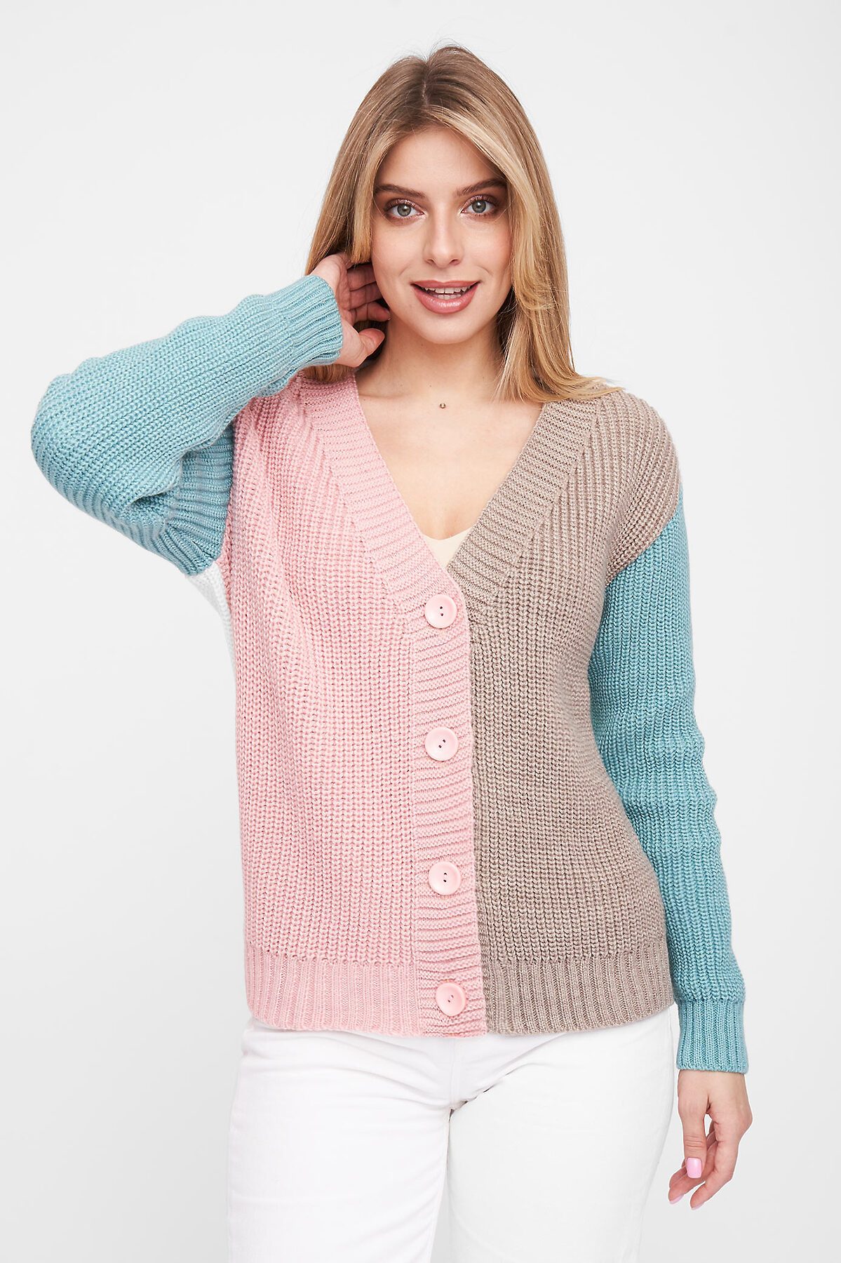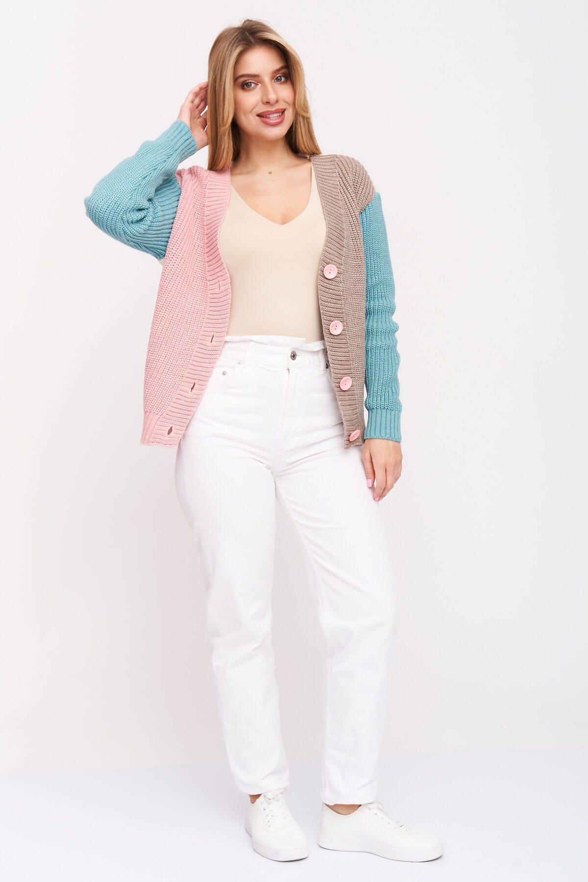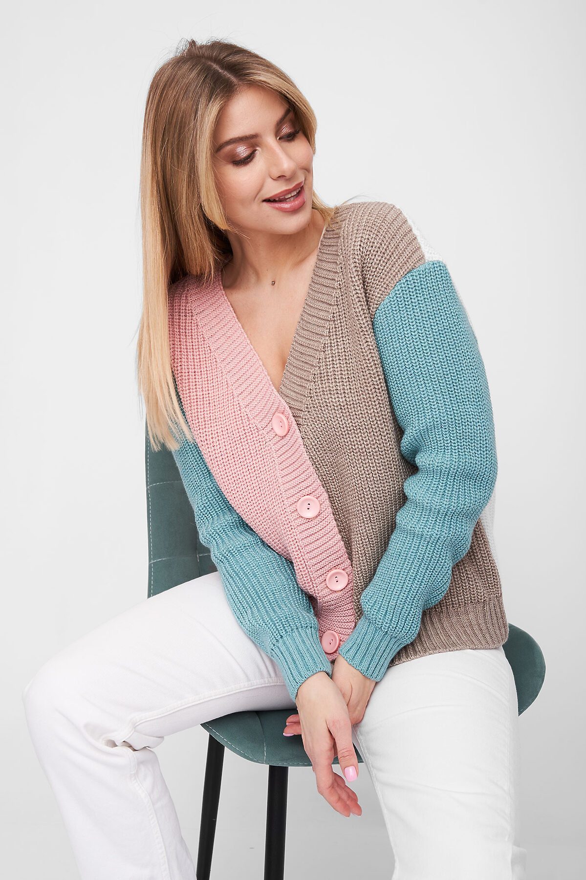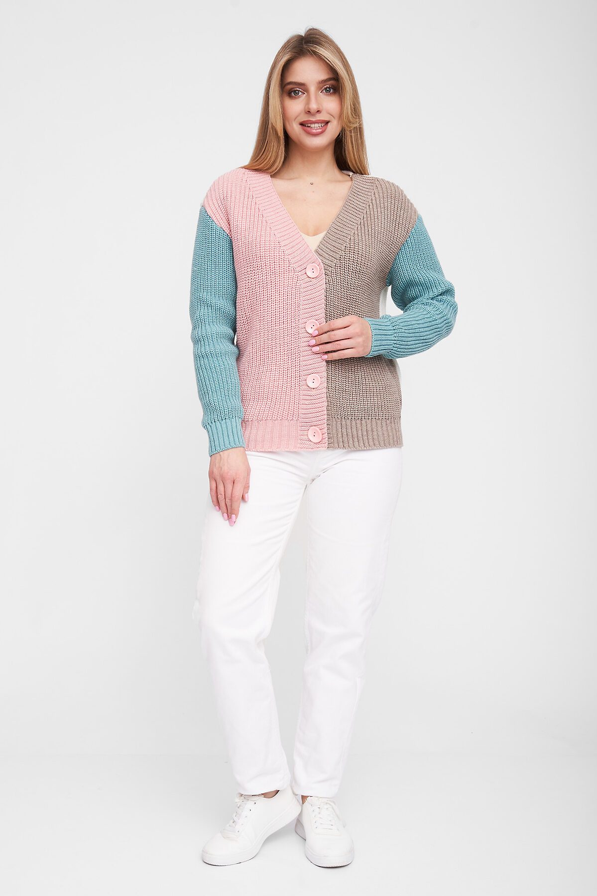 Вязаный жакет в стиле оверсайз с V-образным вырезом горловины, спущенным плечом и рукавом полной длины. Застёжка спереди на пуговицы. Полочки, спинка и рукава выполнены разного цвета пряжи.Эта модель - универсальный второй слой для создания утепленных повседневных образов.