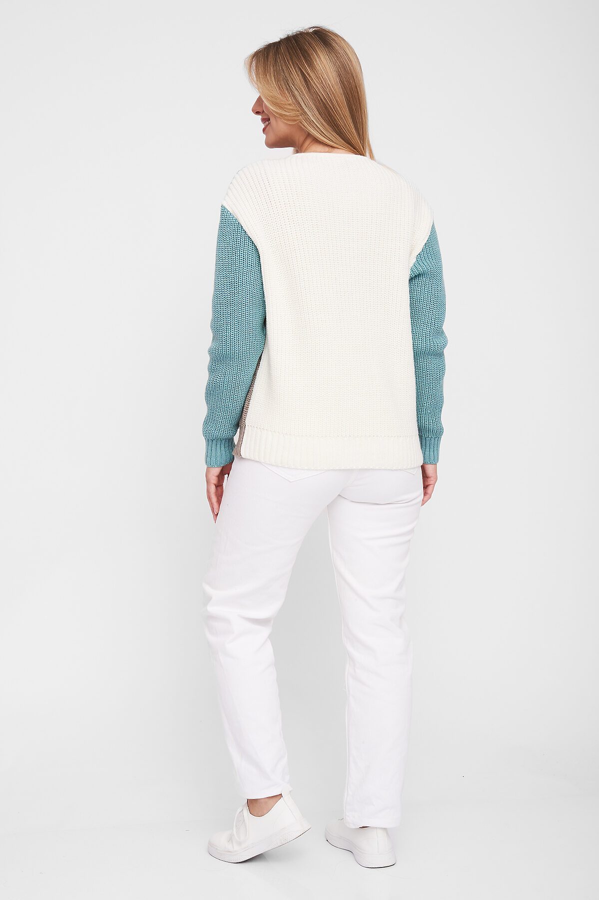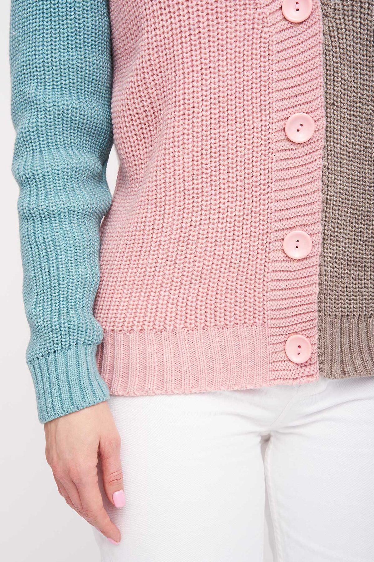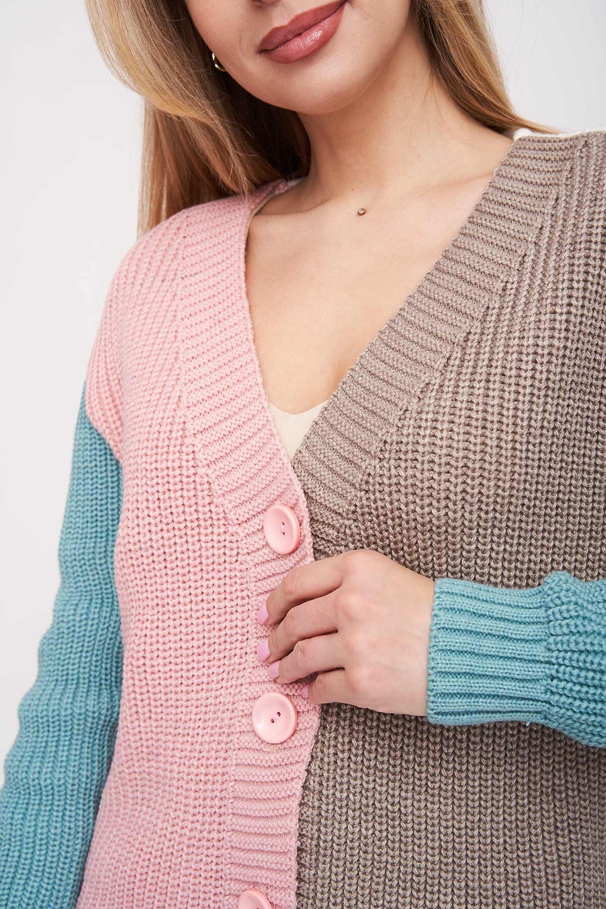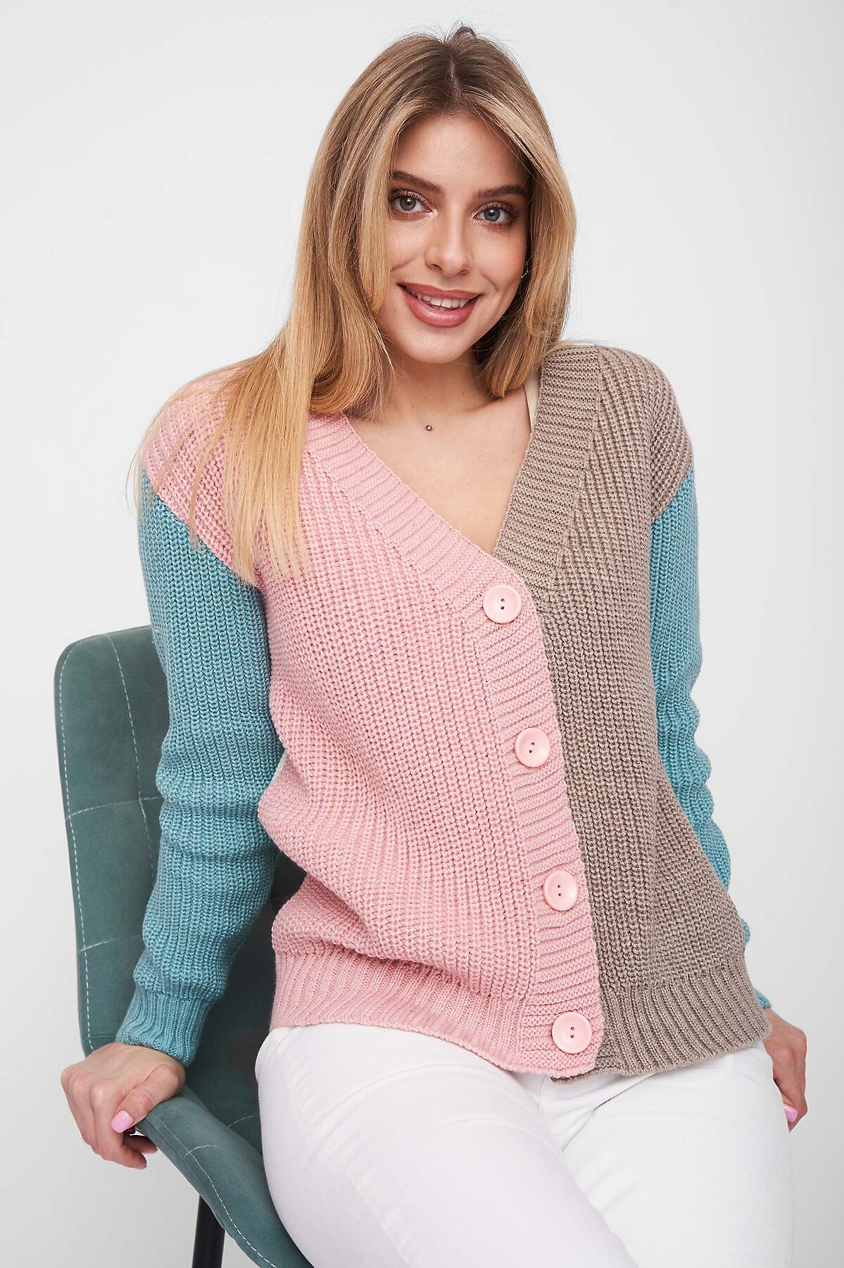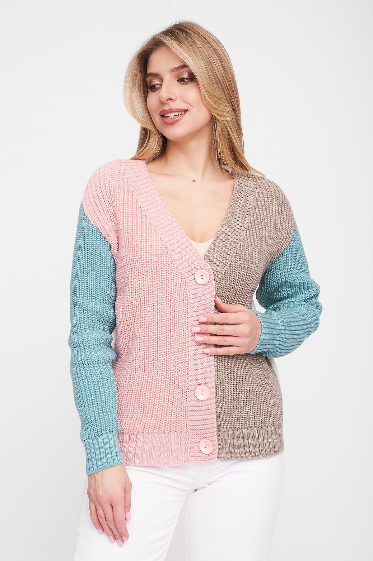 Вязаный жакет в стиле оверсайз с V-образным вырезом горловины, спущенным плечом и рукавом полной длины. Застёжка спереди на пуговицы. Полочки, спинка и рукава выполнены разного цвета пряжи.Эта модель - универсальный второй слой для создания утепленных повседневных образов.
