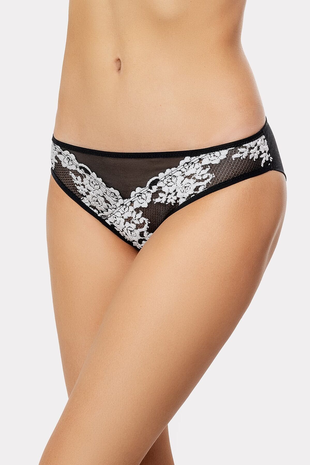 Трусы женские средняя линия талии, силуэт - слип. Трусы выполнены из эл. кружева, сетки, и хл.эл. Задняя деталь выполнена из сетки в сгиб со швом на ширитиле. Верхний срез трусов и нижние срезы передней детали окантованы ловаблем. Верхний срез ластовицы отрезной.