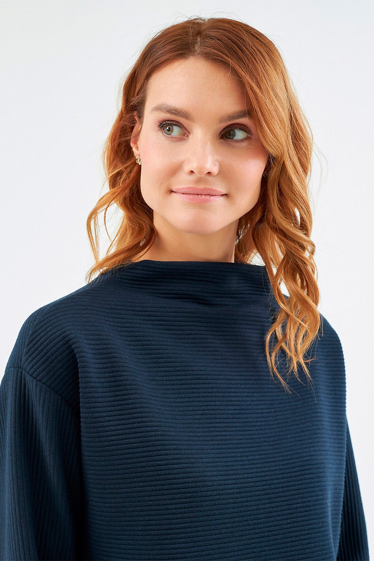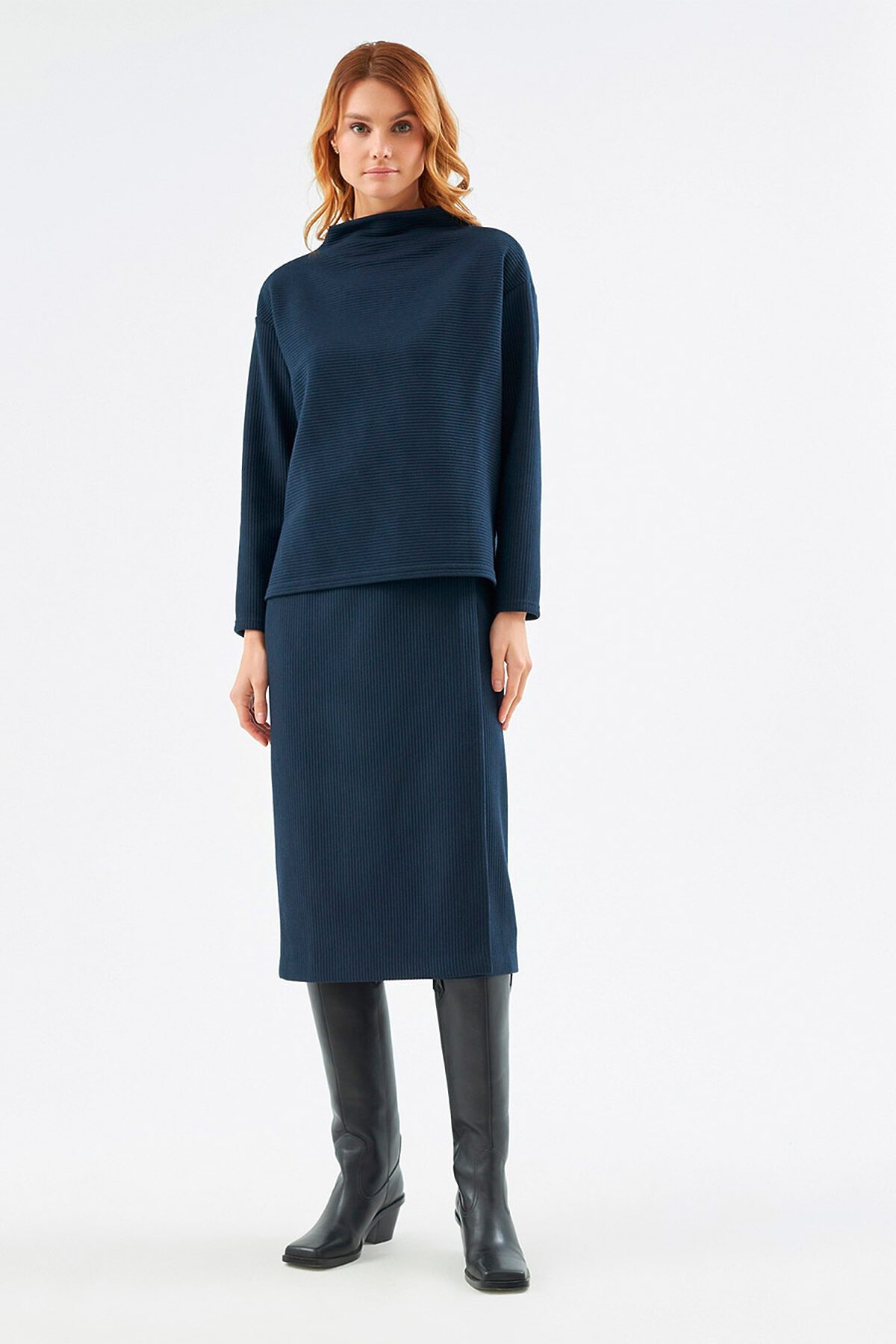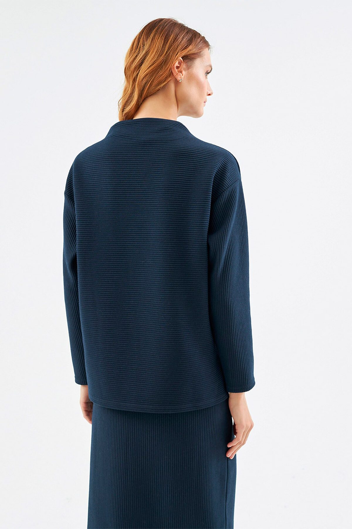 Джемпер прямого силуэта из фактурного трикотажа тёмно-синего цвета, со спущенным плечом, рукавом полной длины и цельнокроеным воротником-стойка.