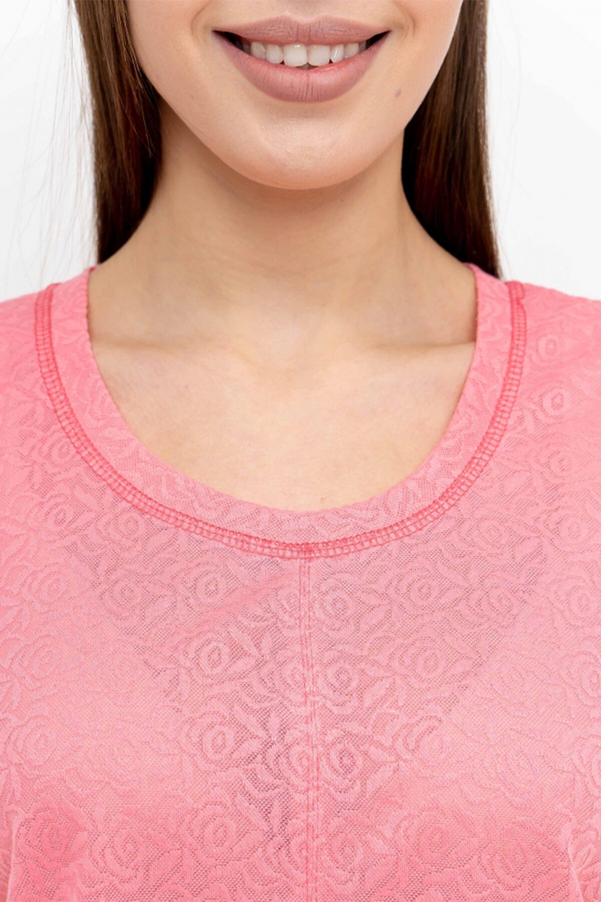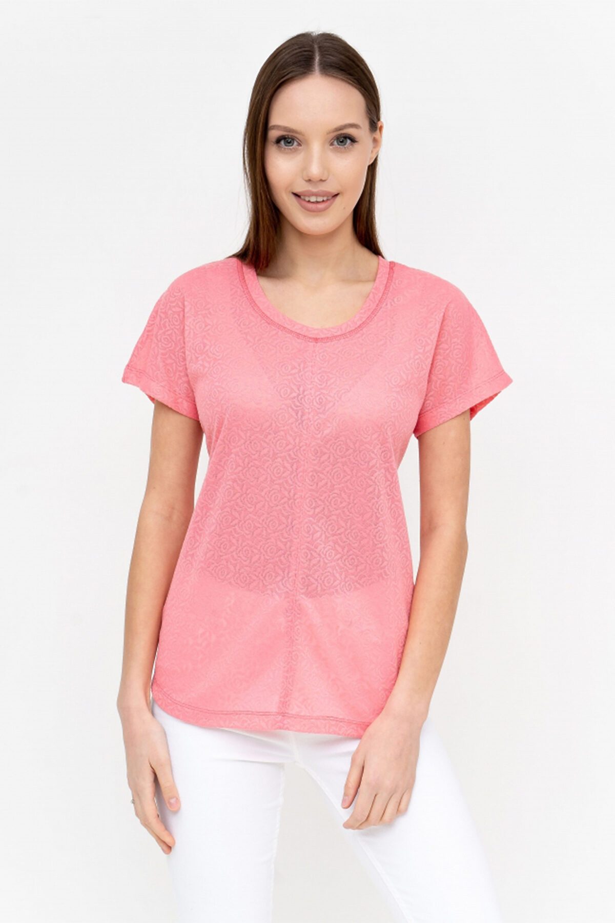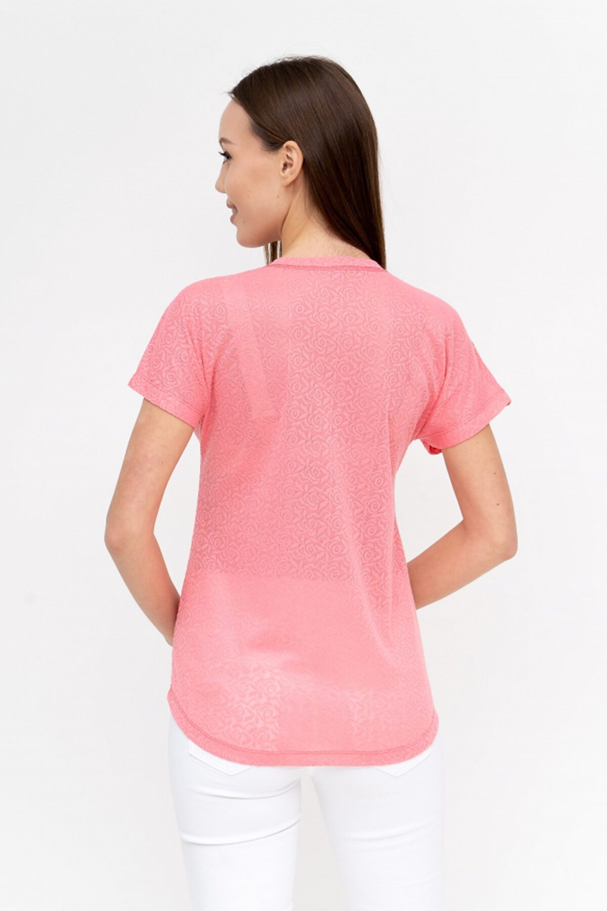 Футболка прямого силуэта с цельнокроеными короткими рукавами. Круглая горловина с широкой обтачкой. По середине полочки проходит вертикальный соединительный шов с декоративной строчкой.