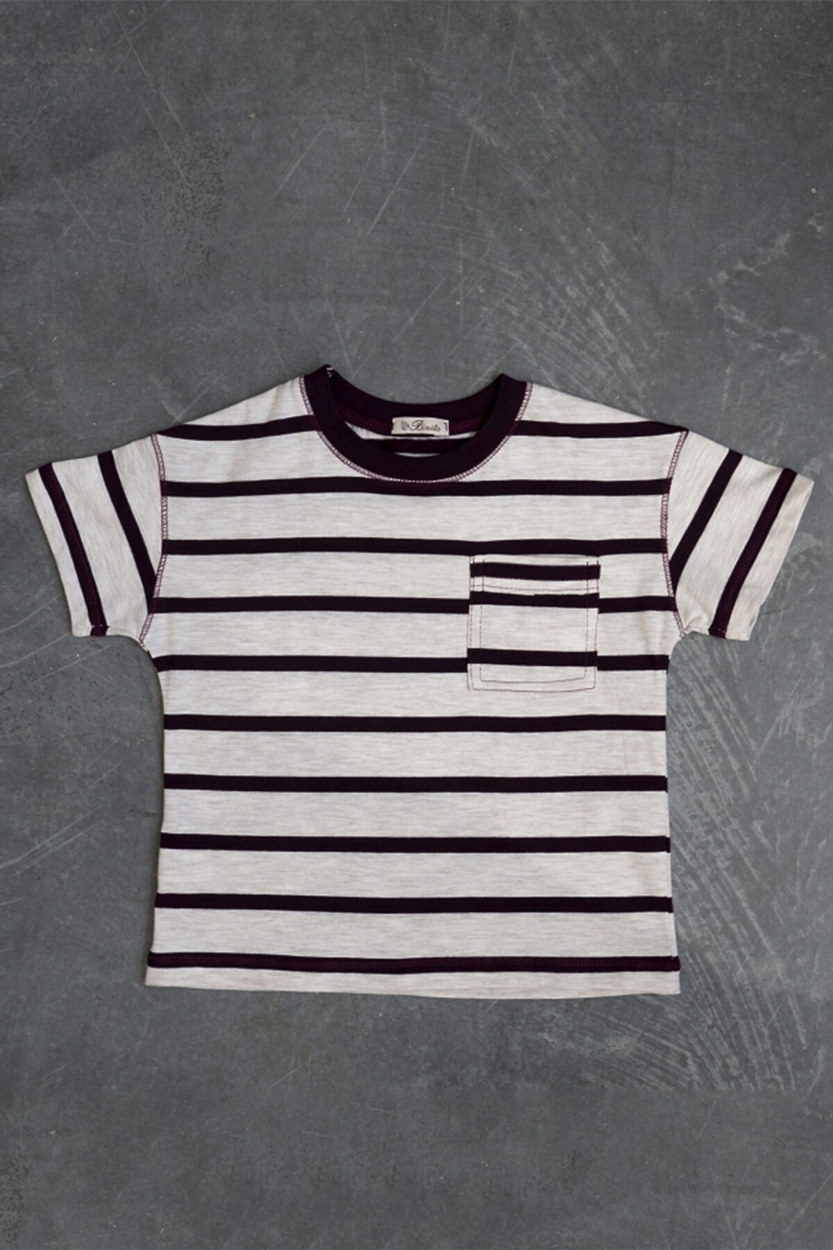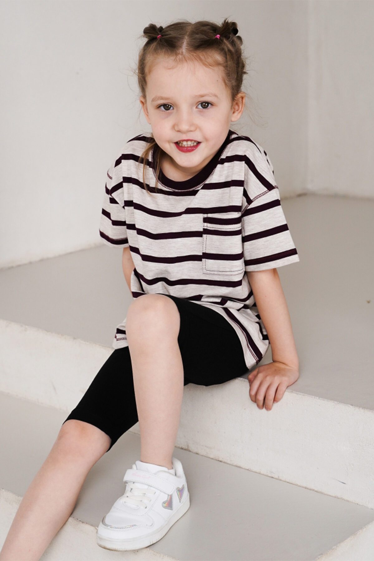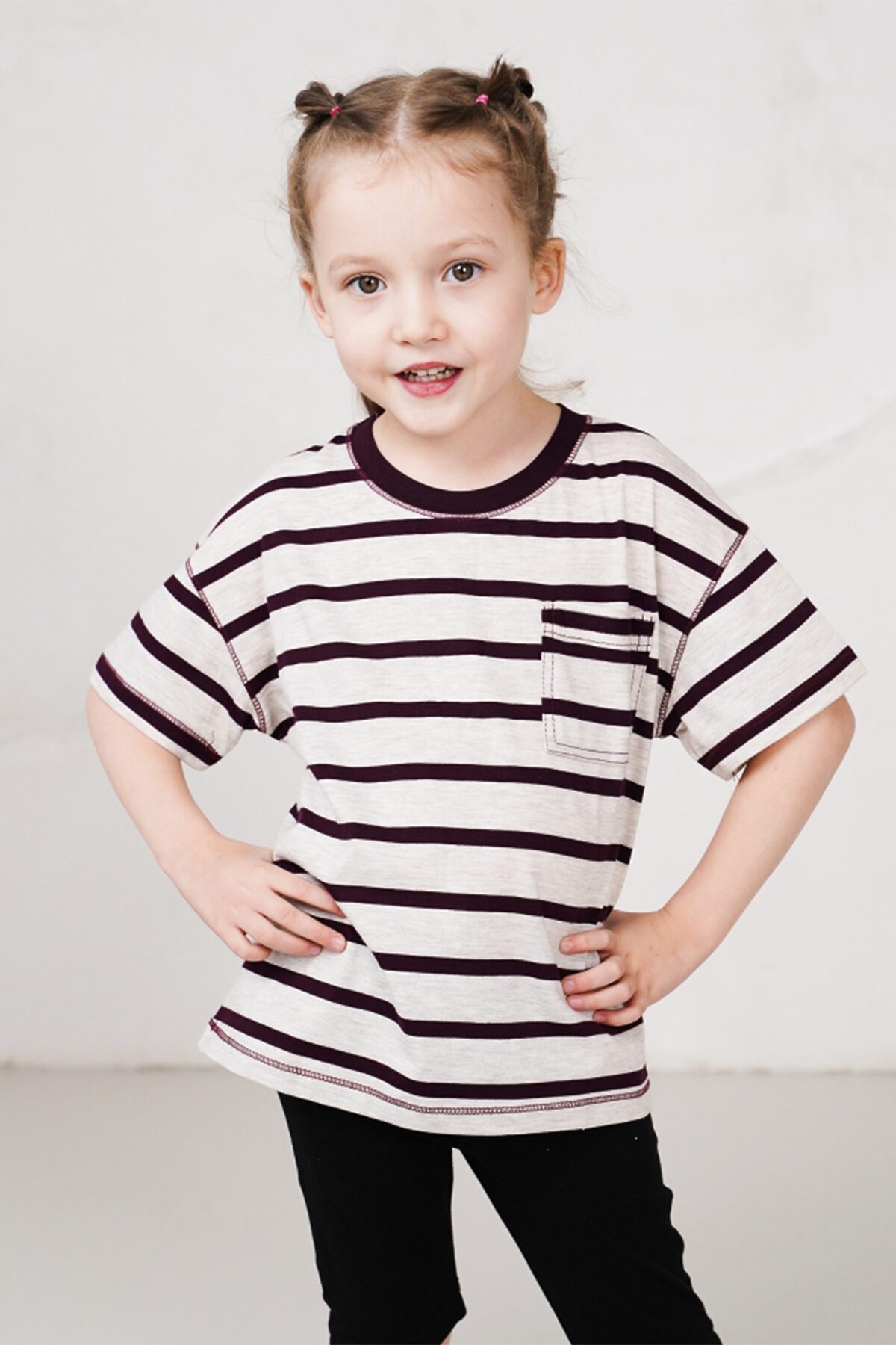 Футболка прямого свободного силуэта с короткими рукавами. Круглая горловина обработана широкой обтачкой в цвет полоски основы. Накладной карман на полочке «как у взрослых».