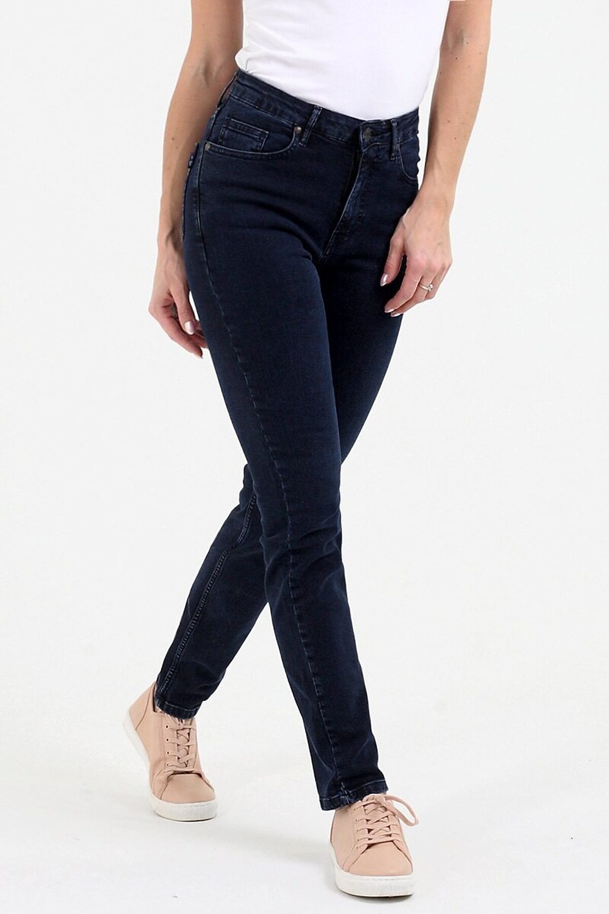 Женские классические джинсы с пятью карманами. Посадка Regular fit (полуоблегающие по бедру). Специально завышенная талия. Для улучшения посадки по талии сделан подкройной пояс из 2-х частей. Застежка на молнии. Узкие по низу. Выполнены из слабоэластичной ткани denim comfort stretch, цвет ткани Blue/Black (лицевая сторона ткани темно-синяя, изнаночная сторона черная). Темная стирка с потёртостями только по швам. Параметры указаны для размера 28. Длина внутреннего шва - 78, 0 см.