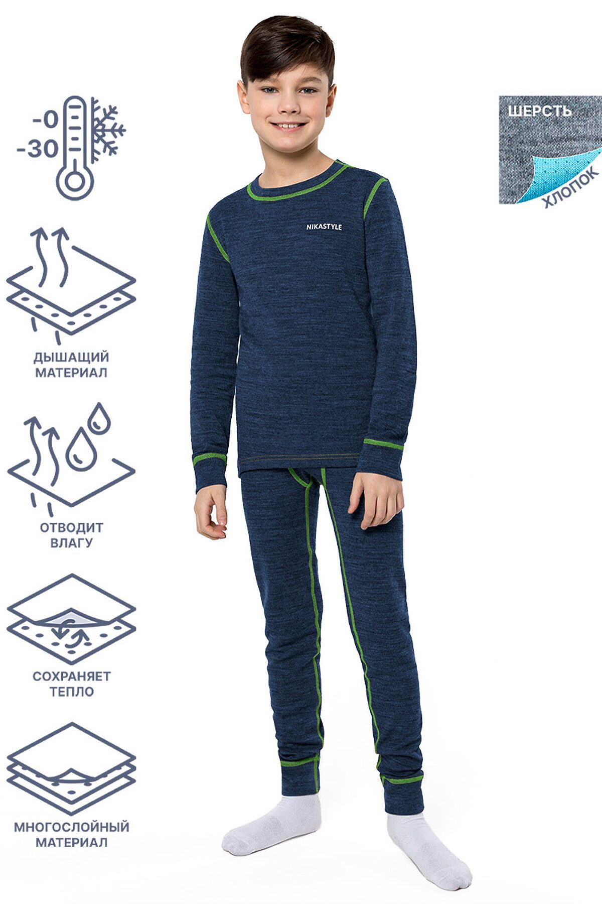 Комплект для мальчика «Термо» (лонгслив и кальсоны) из двухслойного трикотажного полотна. Внешний слой состоит из шерстяных и акриловых нитей, сохраняющих тепло и выводящих лишнюю влагу. Внутренняя часть выполнена из 100% хлопка, приятного на ощупь. Легкое, мягкое и приятное на ощупь, хорошо сохраняет тепло. Не сковывает движения и выводит влагу. Функционал: плоские швы делают такое белье максимально незаметным под одеждой, удлиненный низ лонгслива обеспечивает надежную защиту спины от холода при любой активности, кальсоны хорошо садятся по фигуре и крепко держатся благодаря поясу с широкой резинкой. Комплект можно носить под верхнюю одежду в холодный период (подойдет на температуру до -30 С при условии соблюдения принципа многослойности). Рекомендуем приобрести комплектом аксессуары, обувь и другие вещи из капсулы в карточке товара, которые отлично сочетаются с изделиями коллекции.