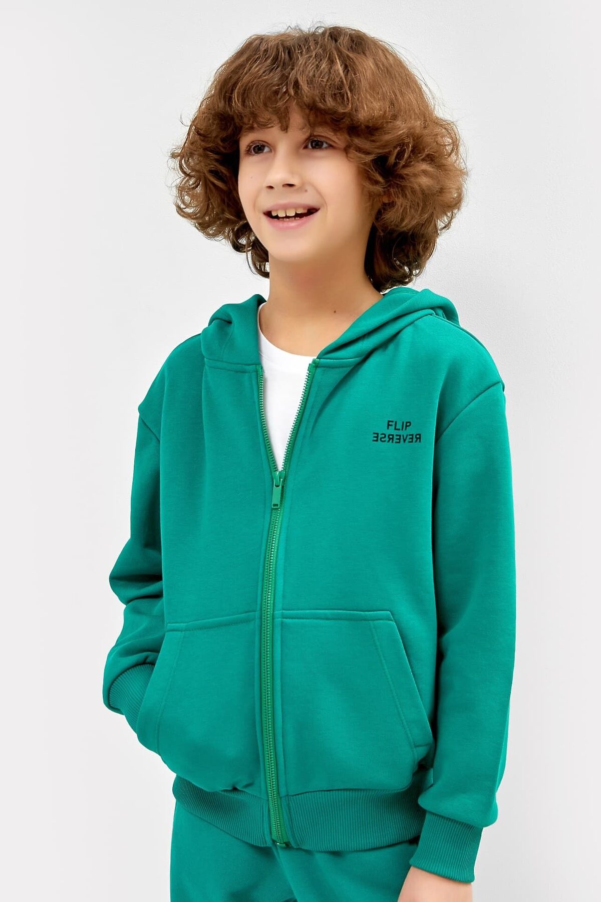 Жакет из легкого трикотажного футера без подчеса. Прямой свободный силуэт, уютный капюшон, длинные рукава с манжетами, вместительный карман-кенгуру, центральная застежка на молнию – очень комфортная модель. Свободу движений гарантирует спущенная линия плеча. Рекомендуем вашему мальчику!