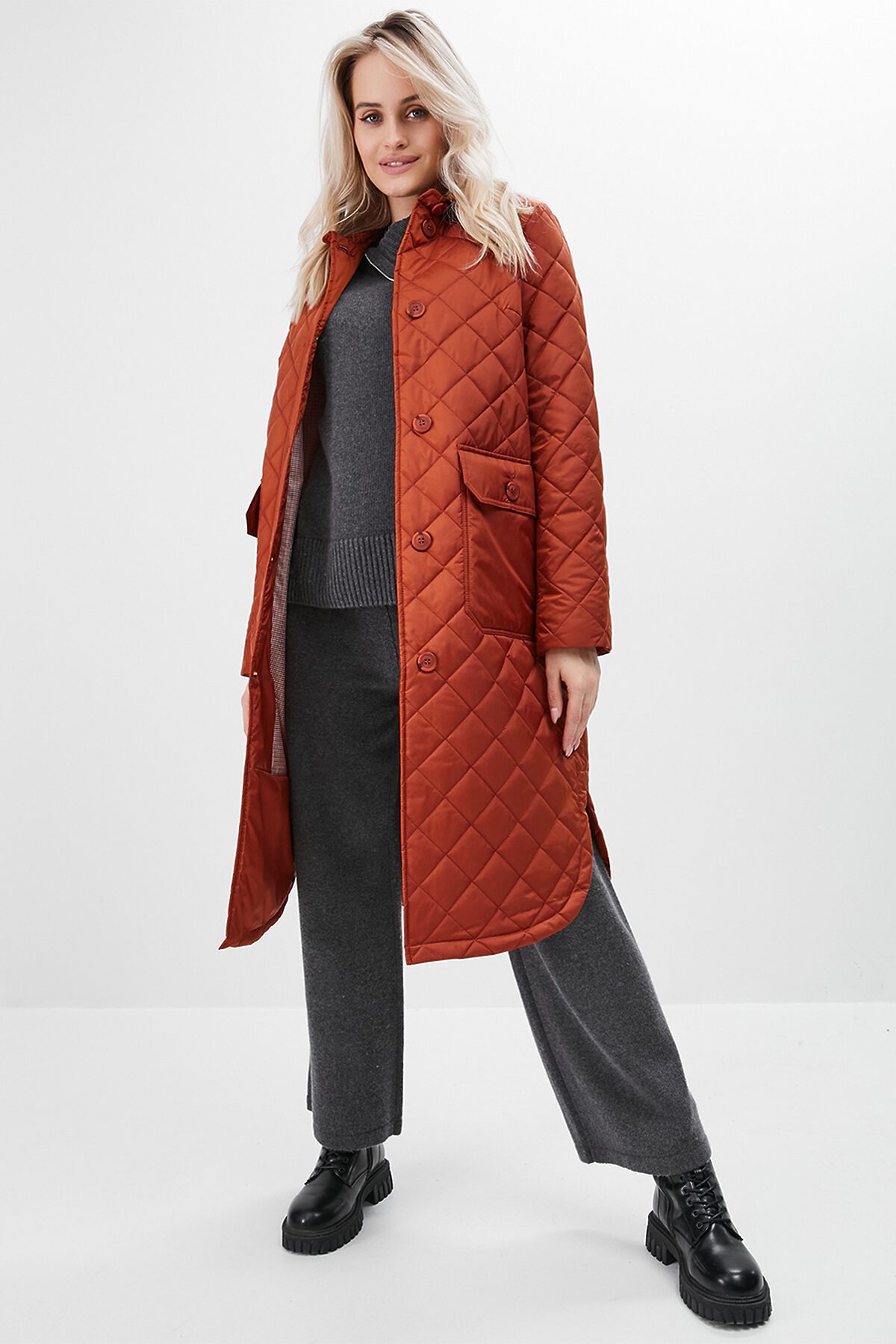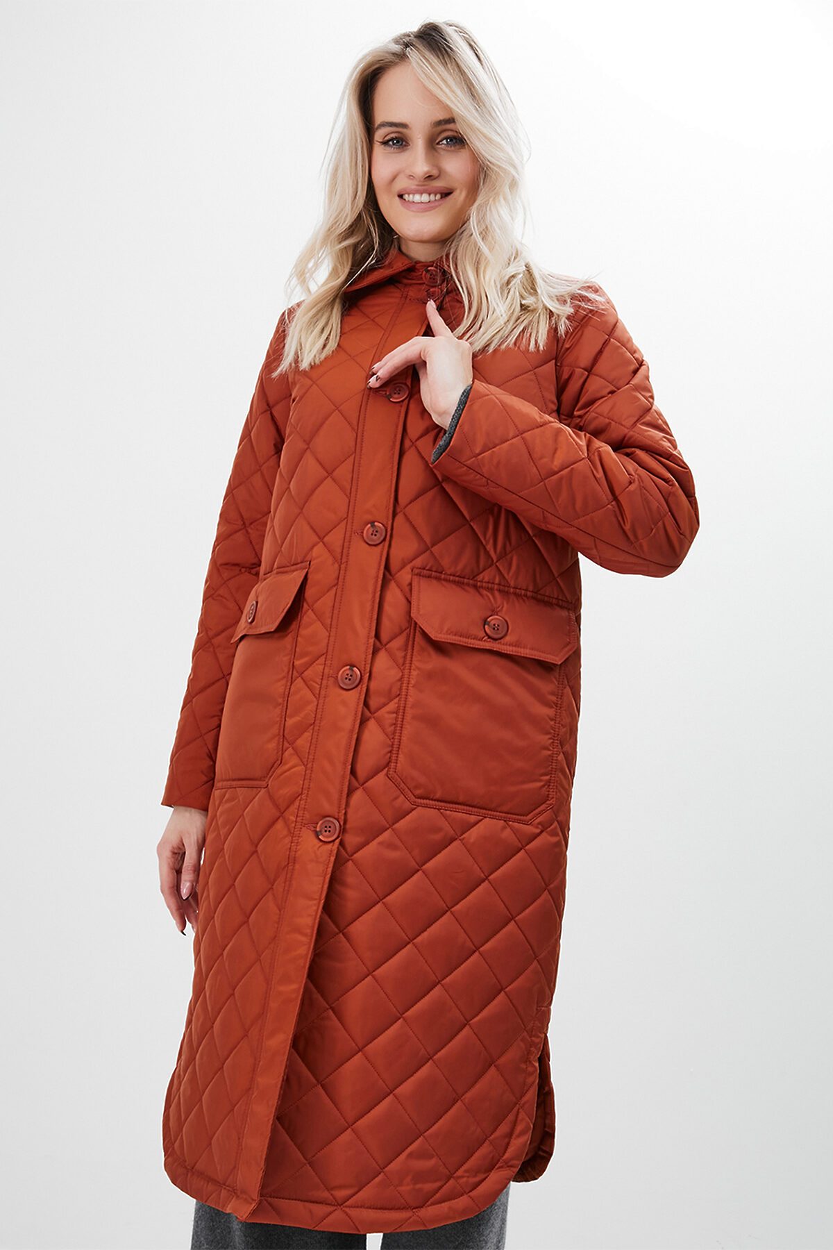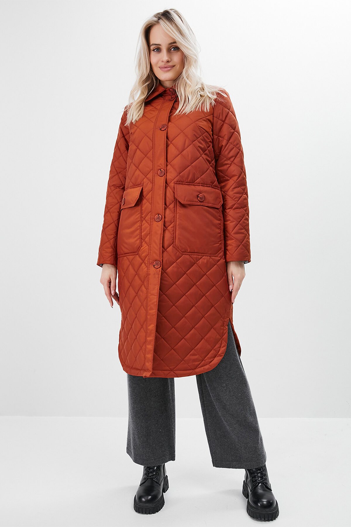 Утепленный плащ-рубашка прямого силуэта с втачным рукавом. В модели имеются два функциональных накладных кармана с клапанами на пуговицах, а также один внутренний карман. Ткань - плащевая с водоотталкивающей пропиткой, расстеганная ромбом. Утепление нового поколения ORSOTHERM 100 гр. Рекомендуемый температурный режим от +10°C до +18°C. Длина изделия: 110 см. Длина рукава: 64 см.