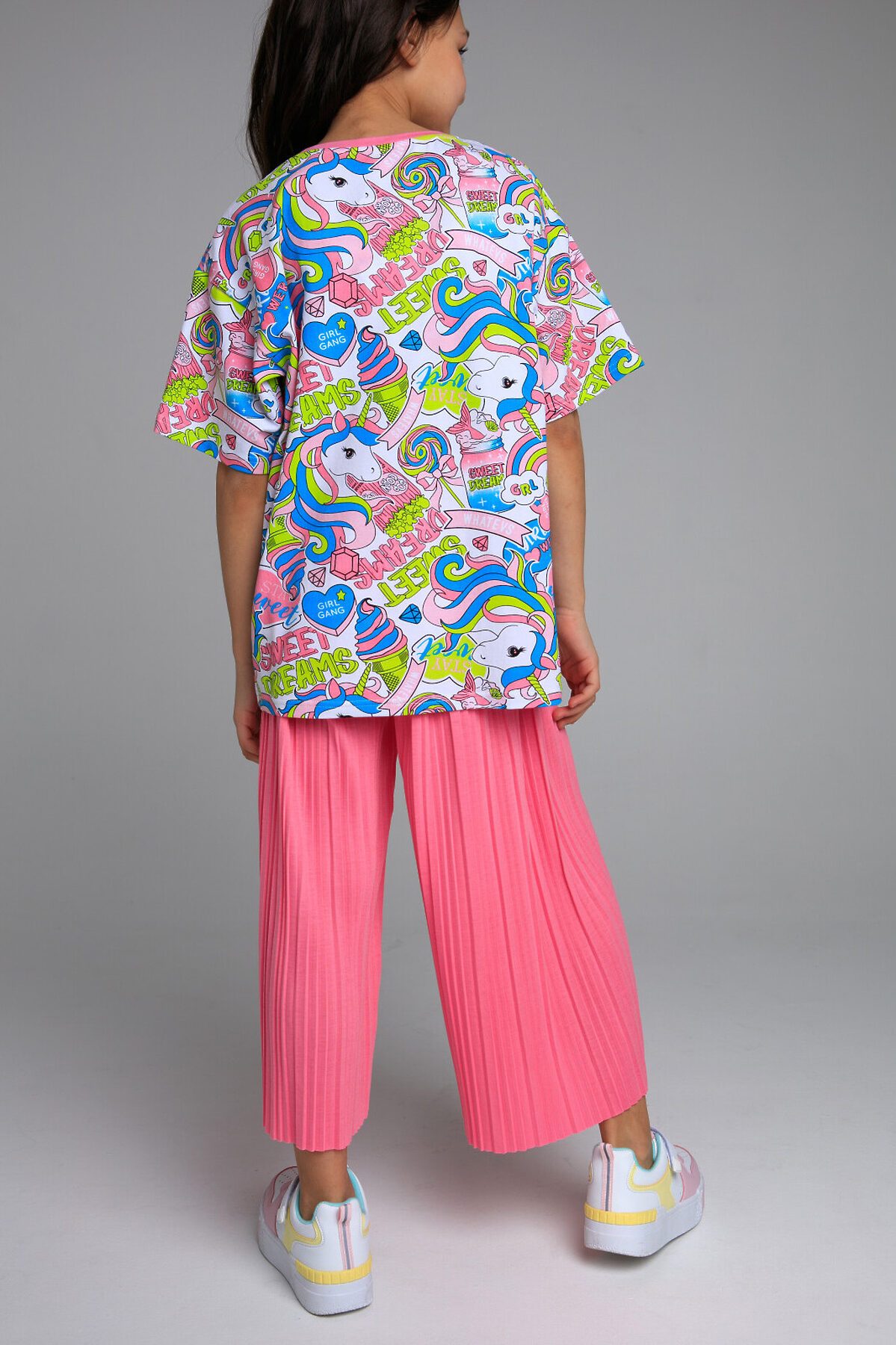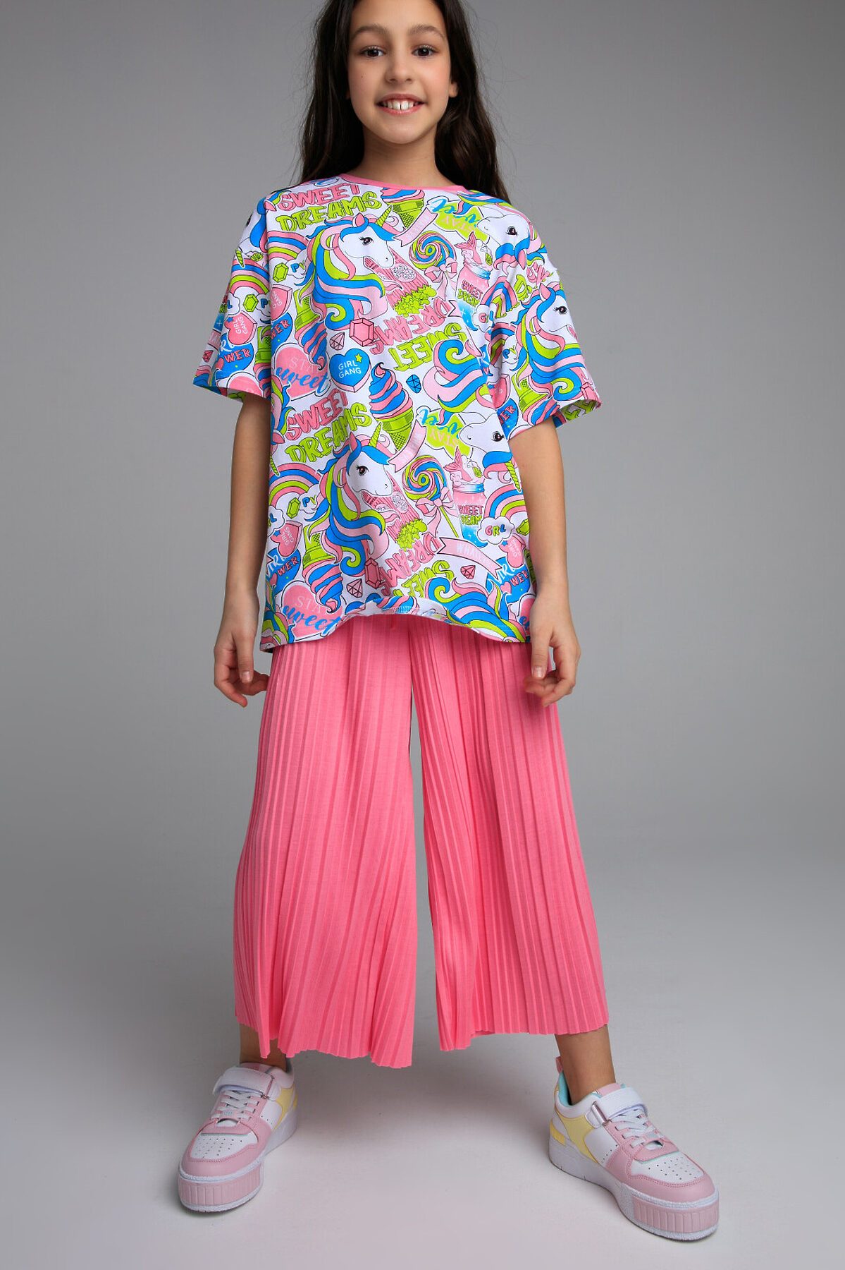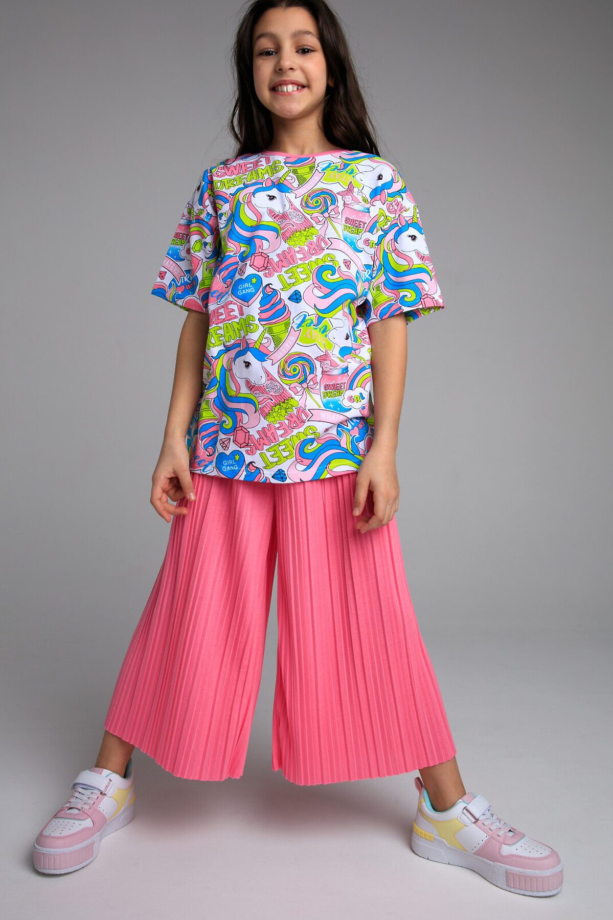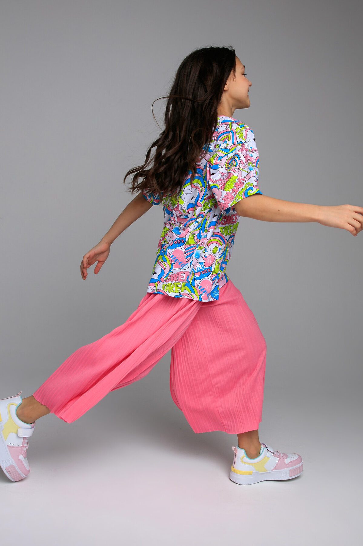 Кюлоты из качественного эластичного и приятного на ощупь трикотажа джерси. Гофрированный материал в складку. Эластичный пояс со шнурком. Высокое содержание хлопка. Благодаря наличию эластана в составе ткани изделие проще в уходе и держит форму.