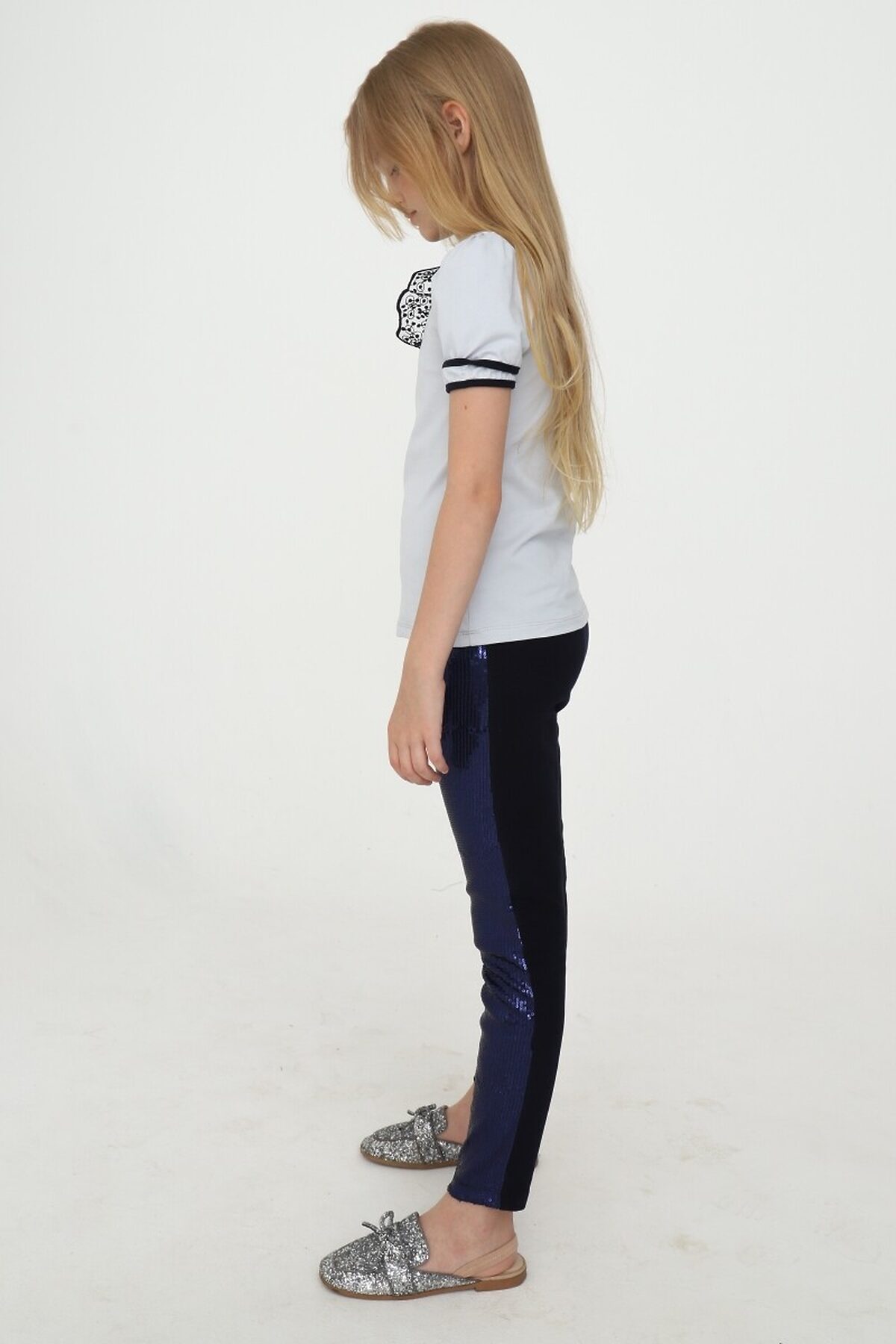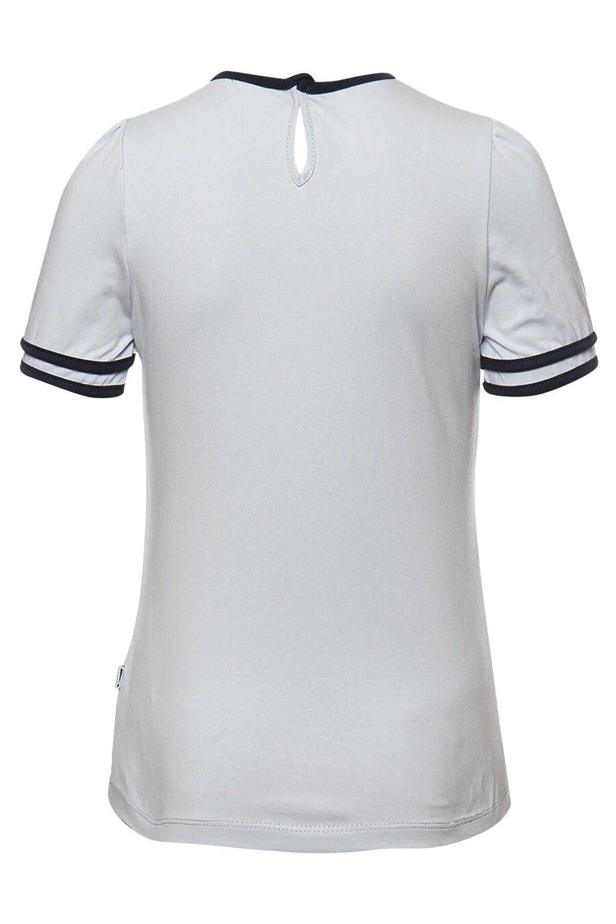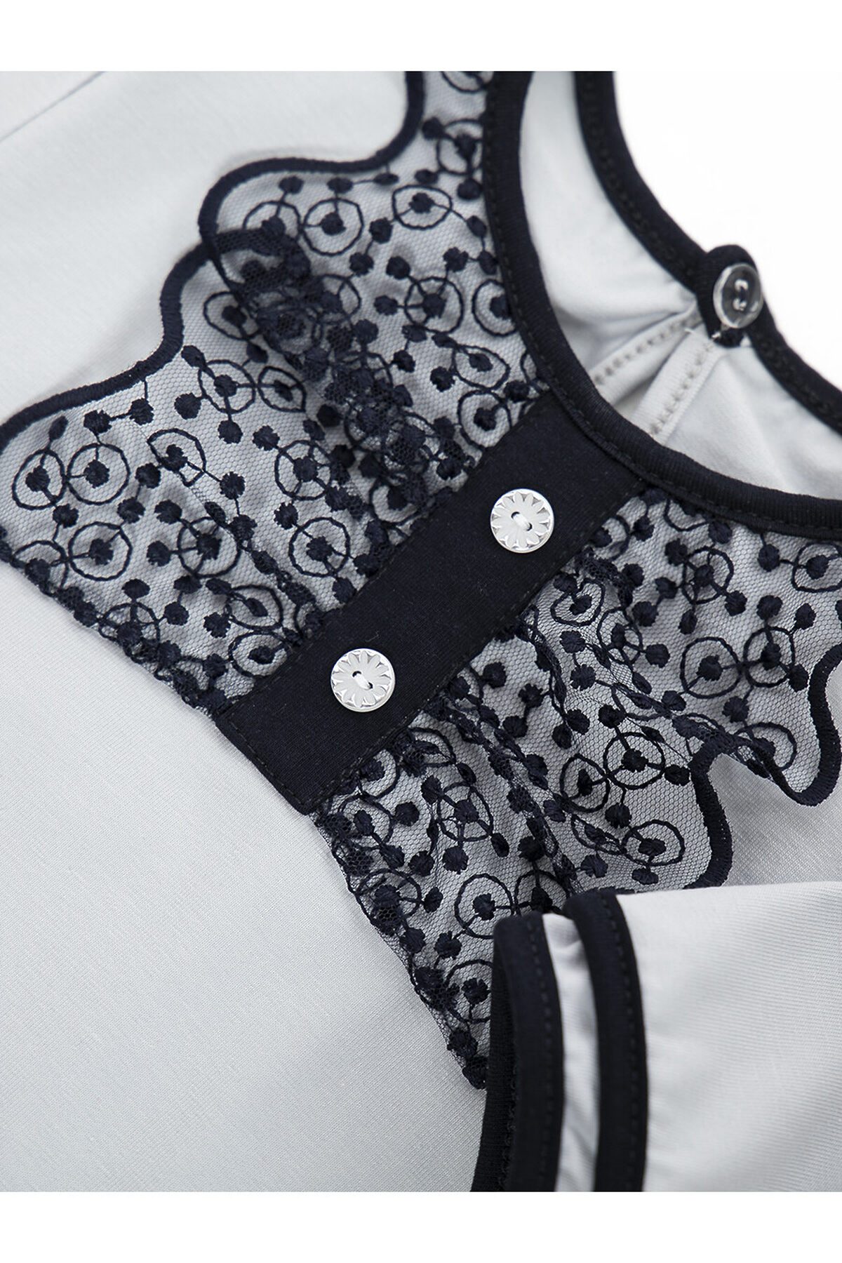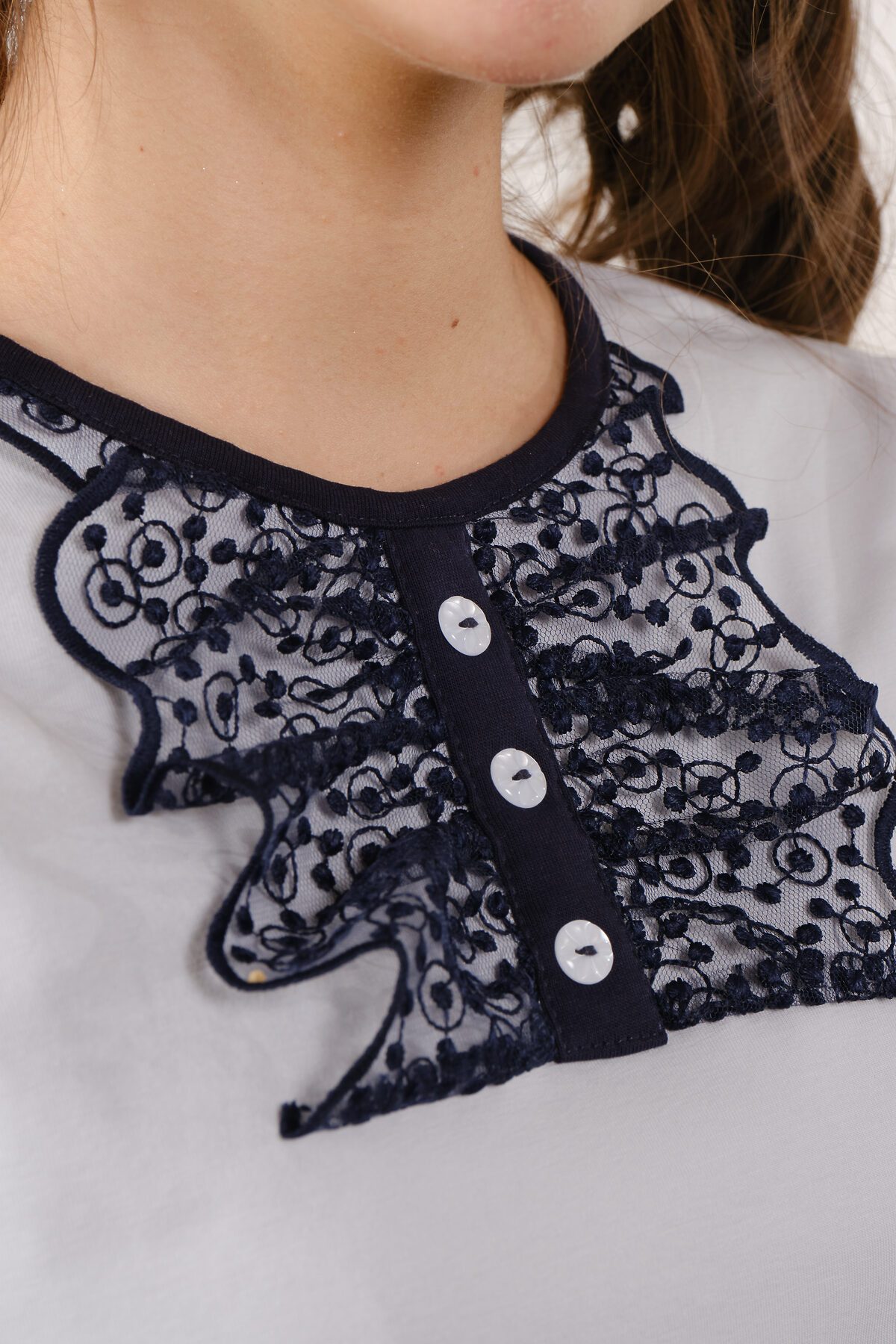 Блуза трикотажная для девочки с короткими втачными рукавами, присборенными по окату. Центр верхней части полочки декорирован планкой с 2-мя пуговицами и кружевом в виде "жабо". Застежка- капелька по центру спинки. Низ рукавов и горловина окантованы трикотажной бейкой контрастного цвета.