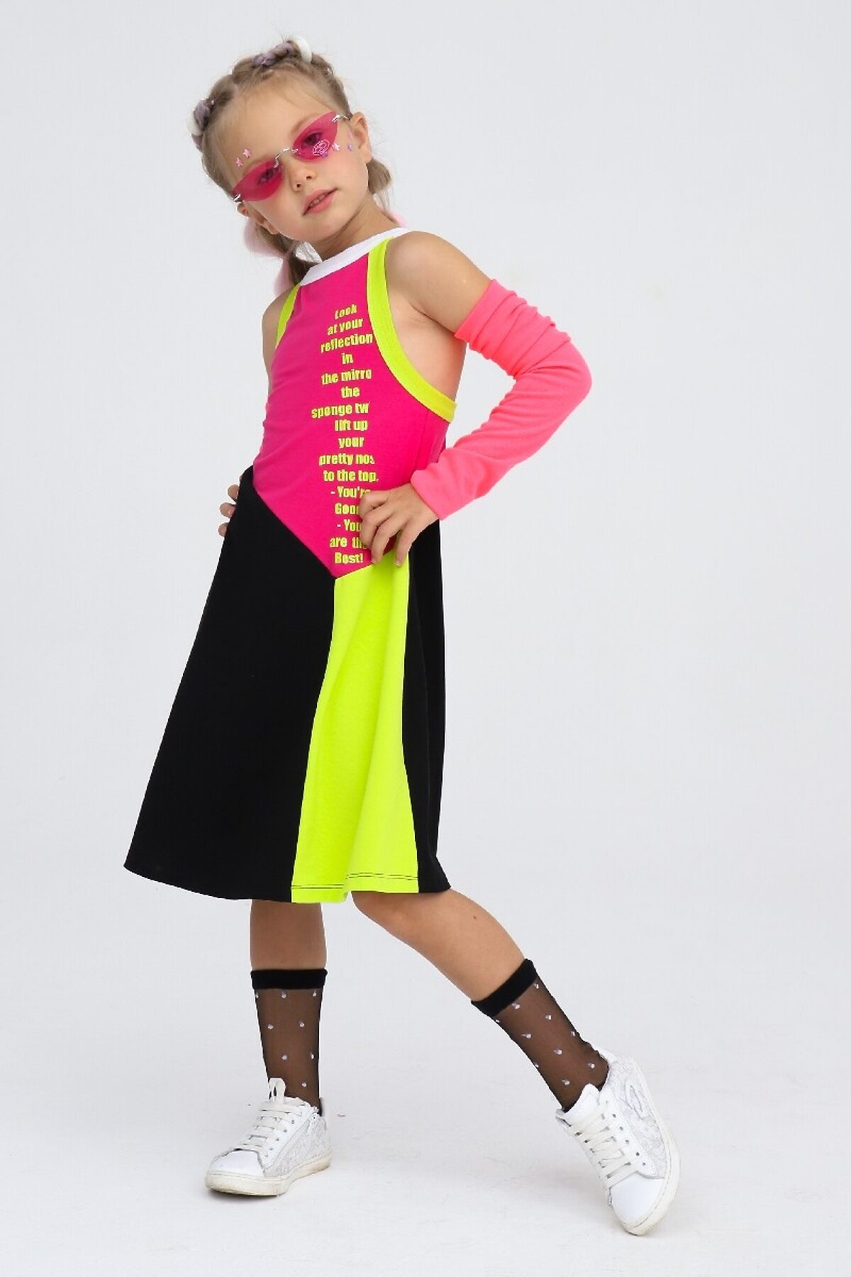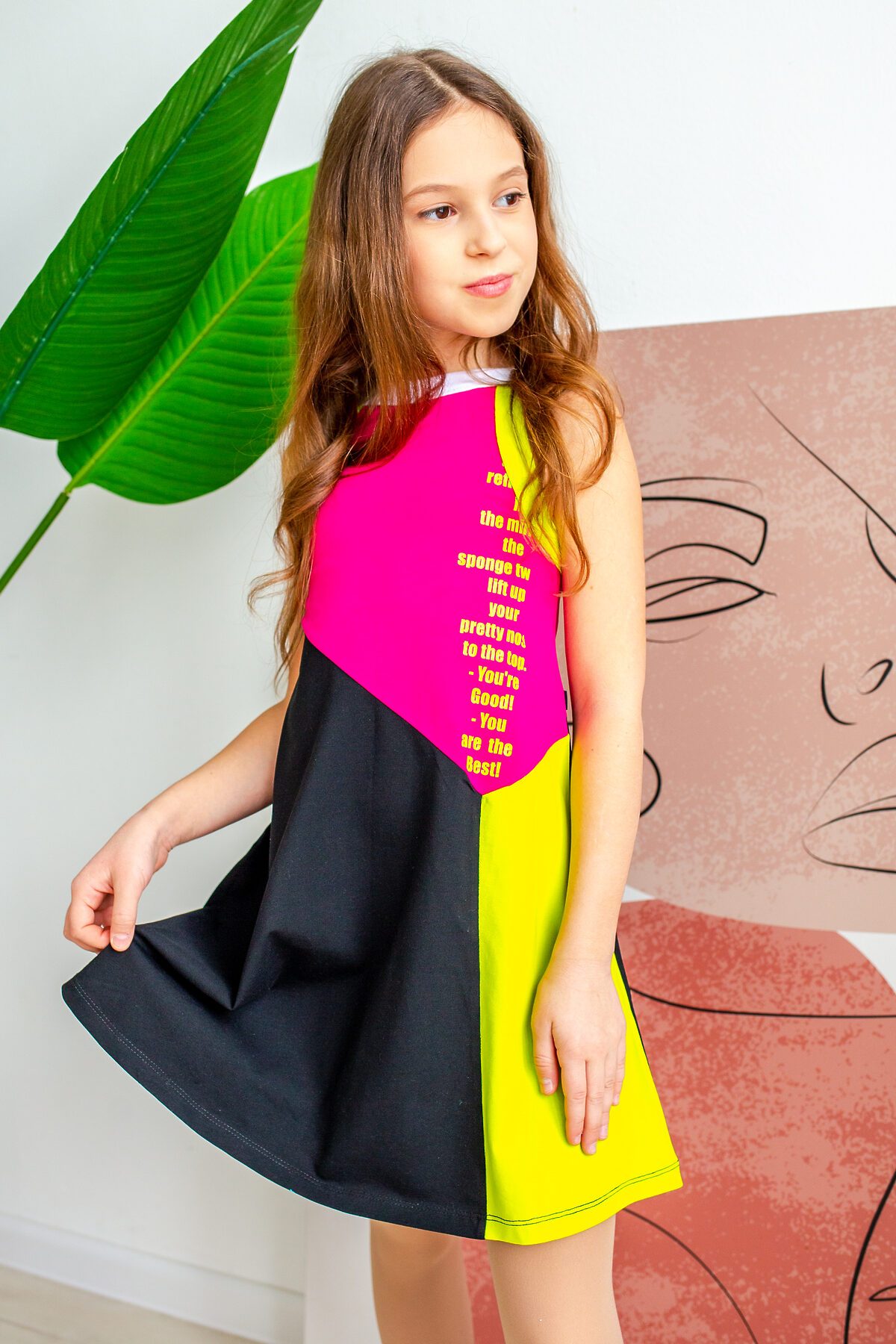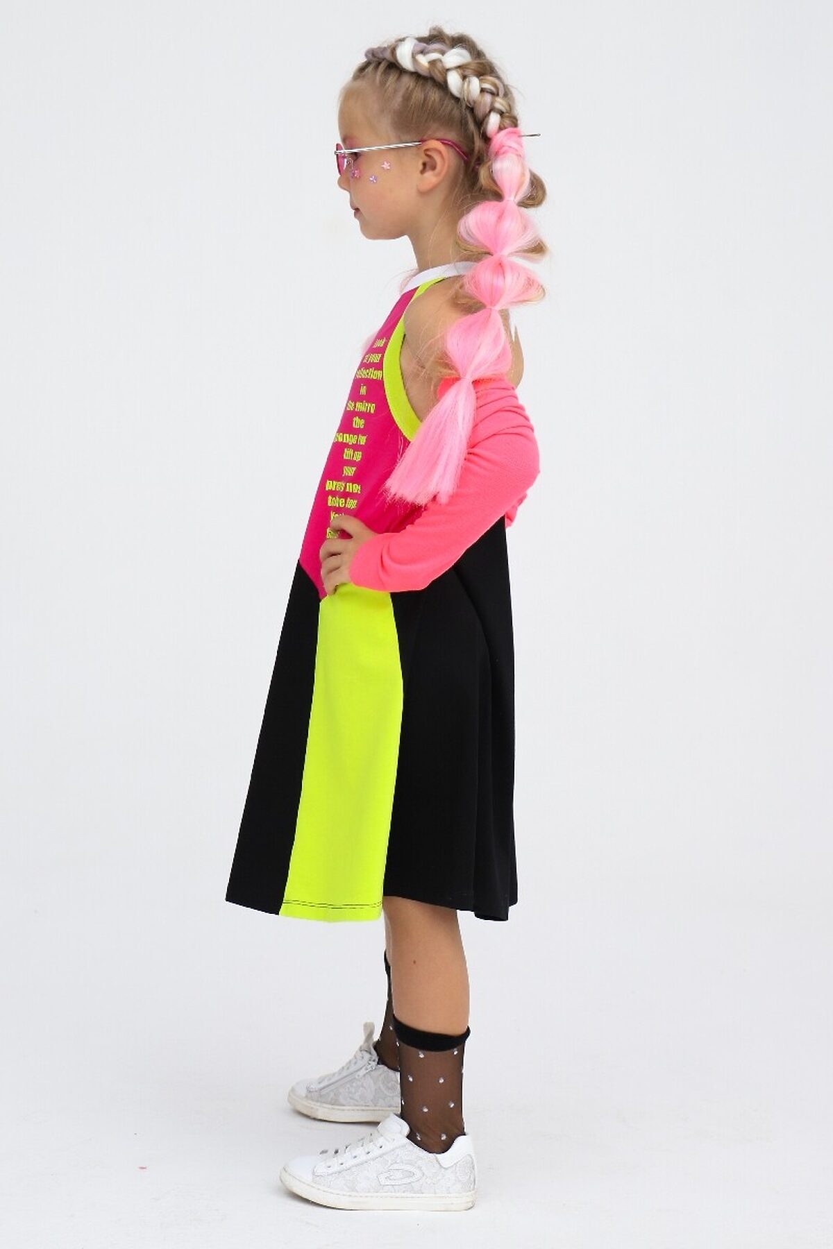 Сарафан трикотажный полуприлегающего силуэта, с расширенной к низу юбкой. Перед и спинка имеют А-симметричные конструктивные линии реза, верхняя часть полочки декорирована принтом. Детали сарафана выполнены из полотен контрастных расцветок.