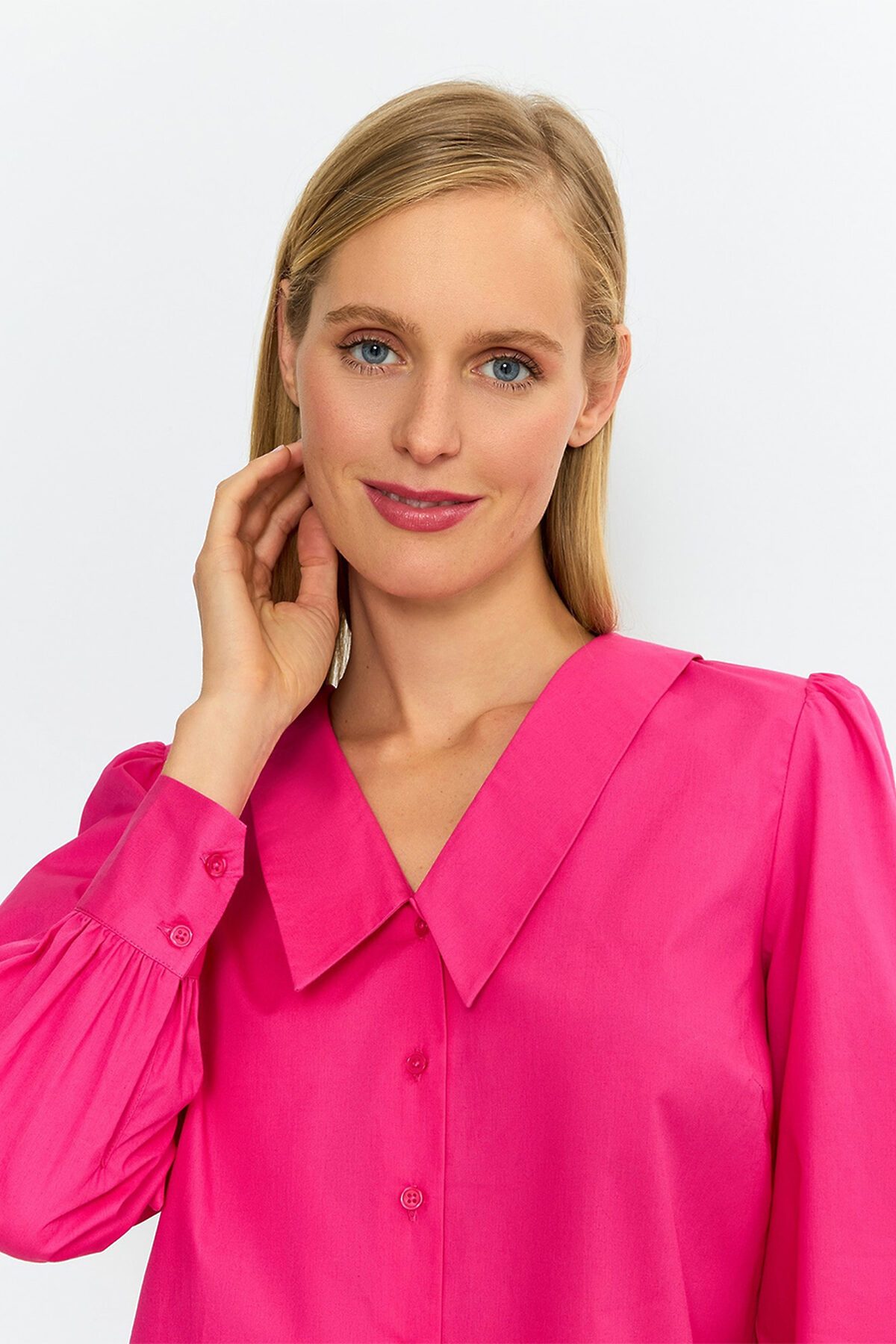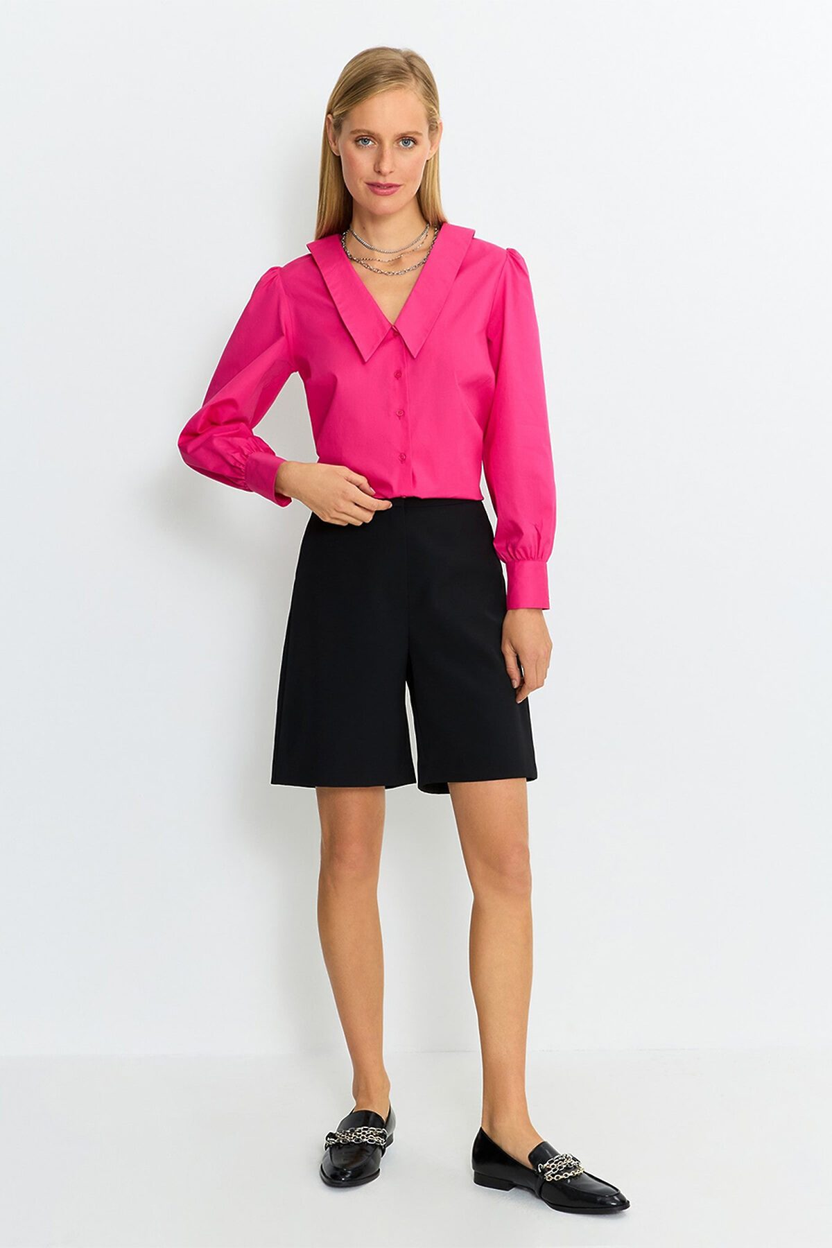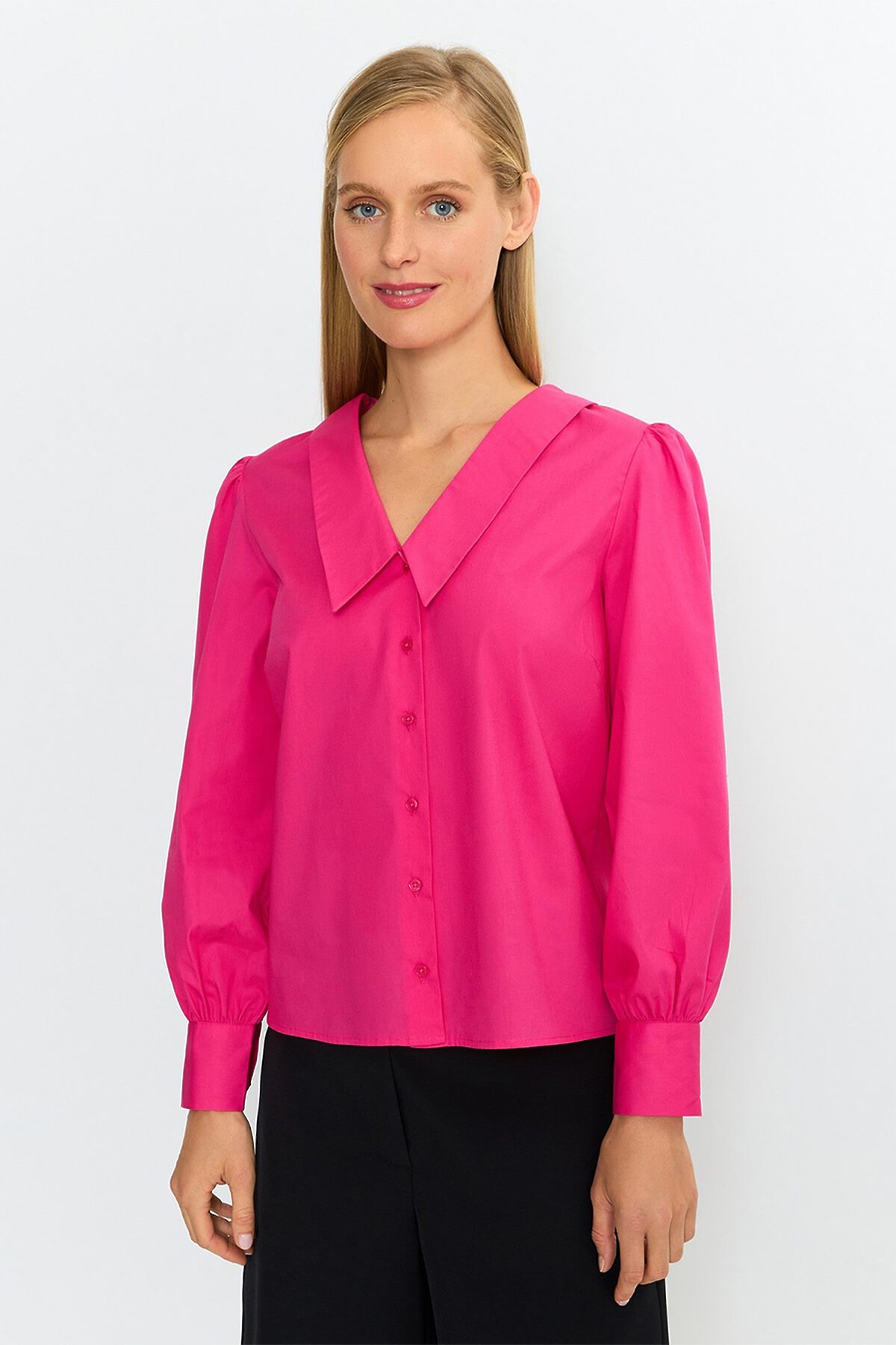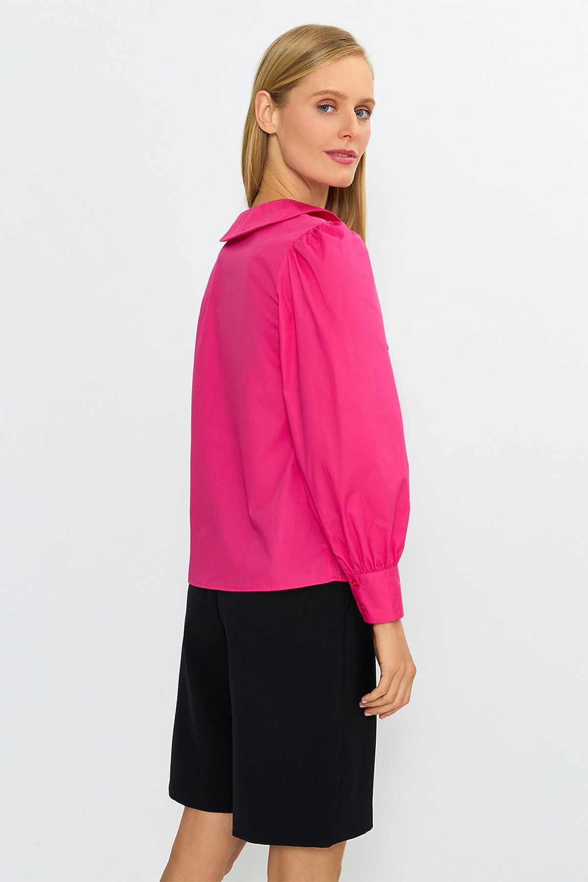 Блуза прямого свободного кроя, с отложным воротничком и акцентными рукавами.