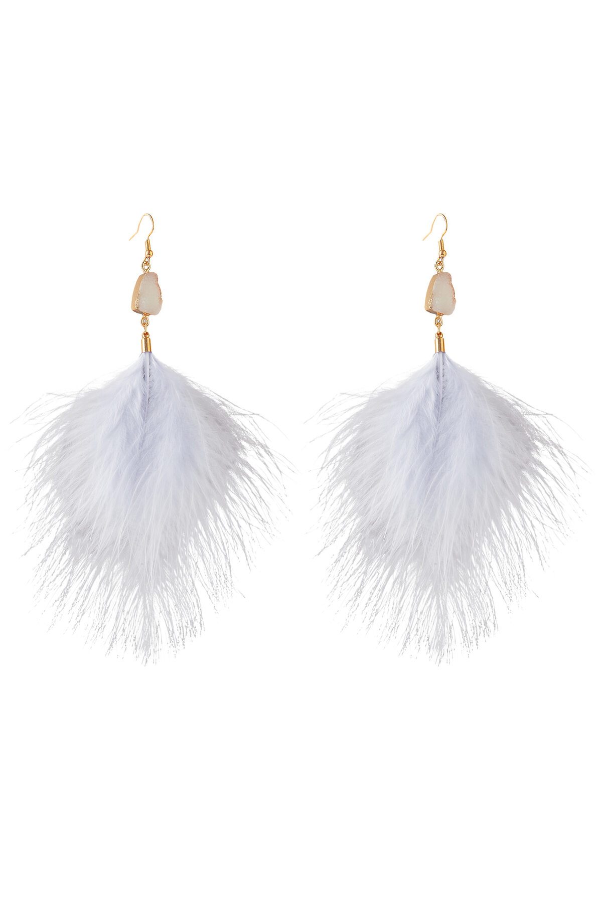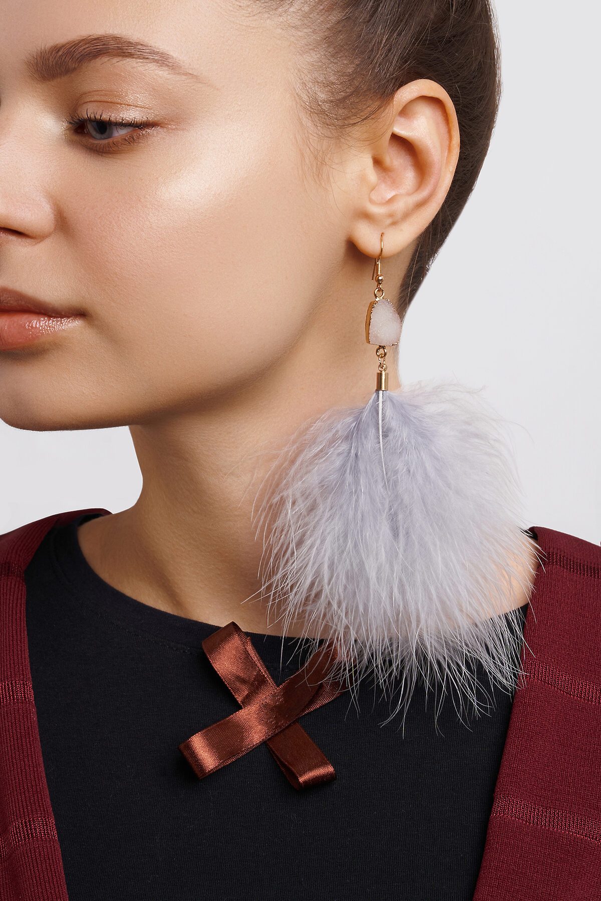 Оригинальные серьги с подвесками выполнены из гипоаллергенного бижутерного сплава и украшены натуральными перьями и декоративными камнями. Украшение фиксируется в мочках с помощью удобных застежек-петель. Легкие воздушные серьги практически не ощущаются в ушах. Длина украшения 16 см.