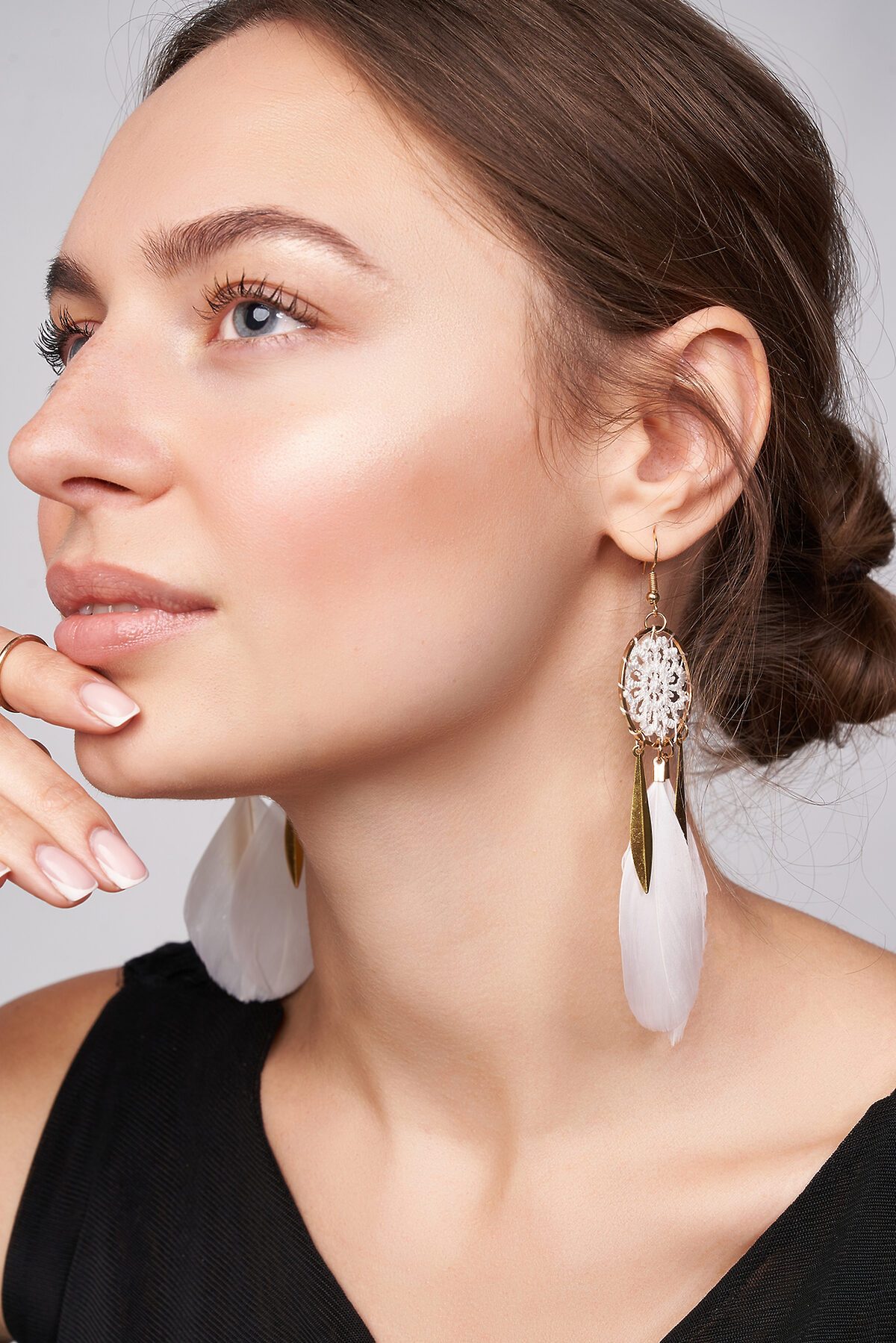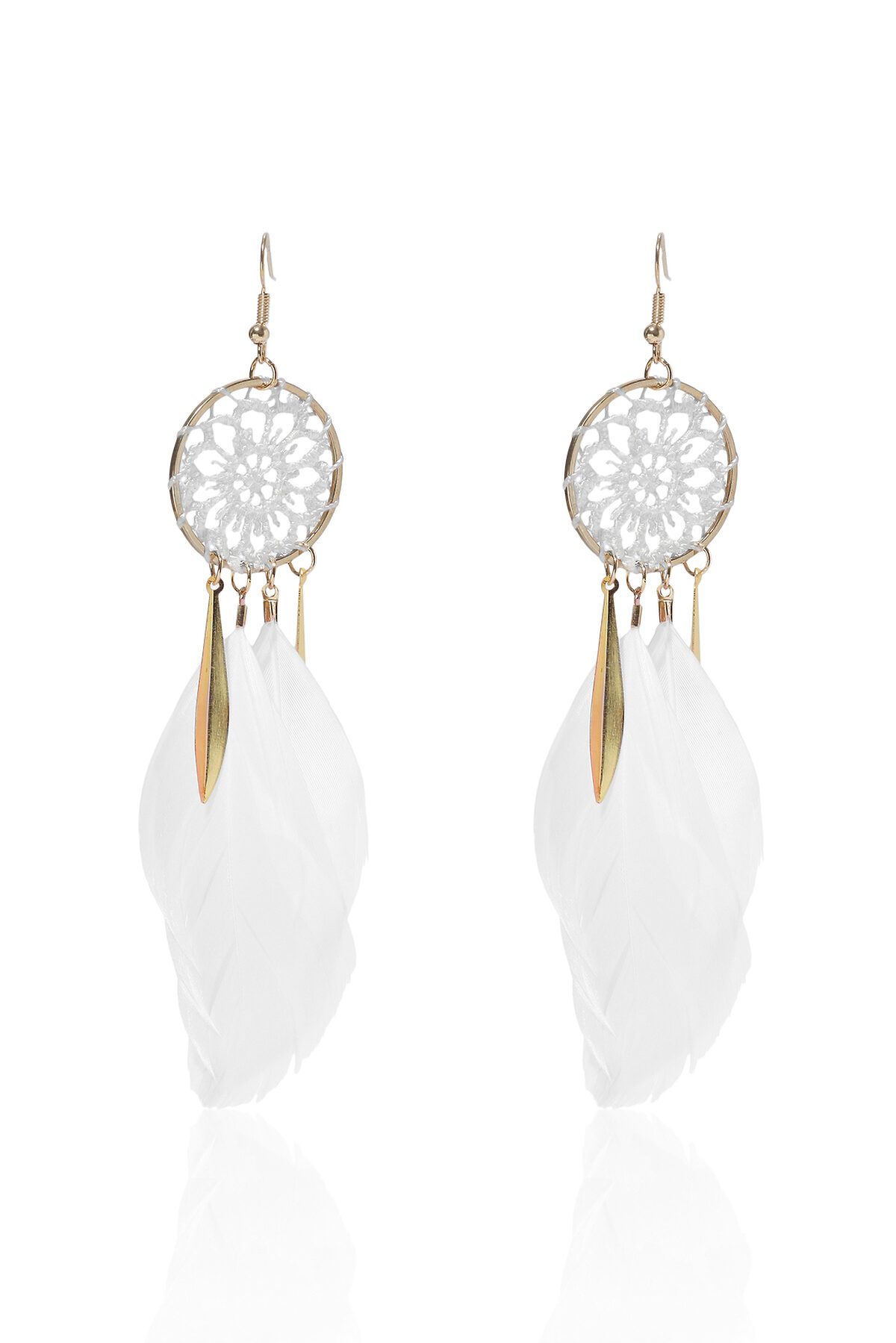 Оригинальные серьги в стиле бохо с подвесками выполнены из гипоаллергенного бижутерного сплава и декорированы натуральными перьями. Украшения фиксируются в мочках с помощью удобных застежек-петель. Серьги легкие, практически не ощущаются в ушах. Длина украшения 12 см.