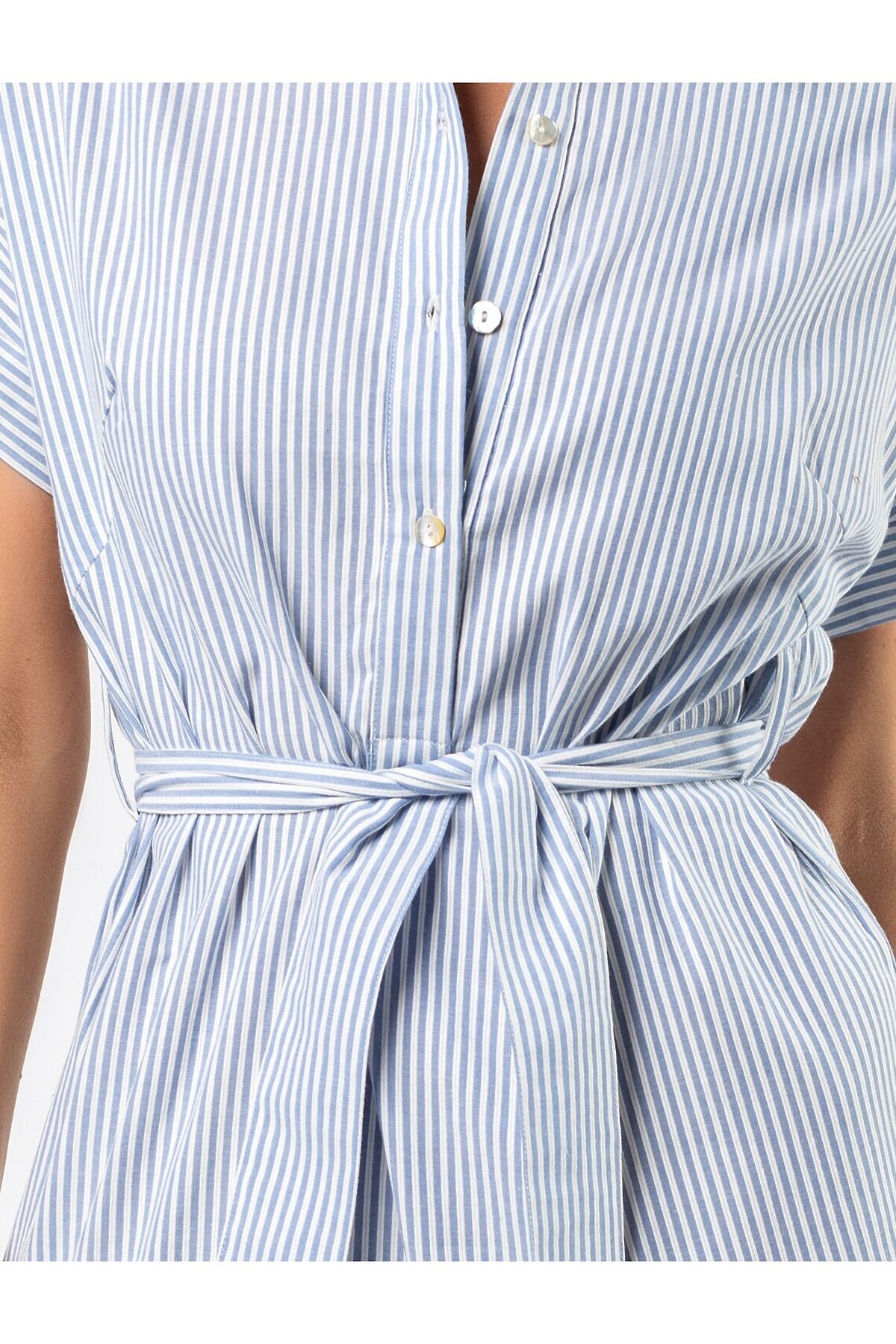 Платье из тонкого 100% хлопка с фактурой полосы. Модель с воротником и коротким рукавом. Застежка на пуговицы. Юбка на заниженной талии в теннисном стиле выглядит романтично и спортивно. В комплекте пояс из общего полотна подчеркивает талию и женственность.