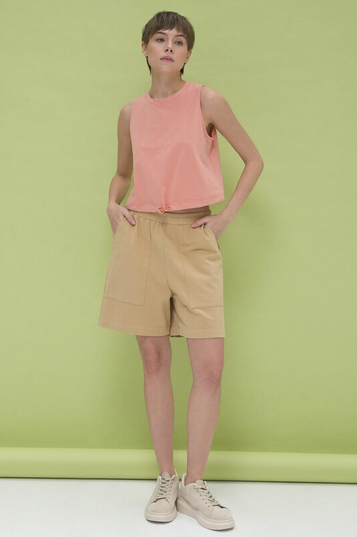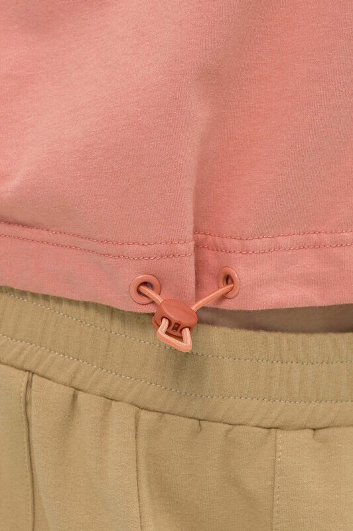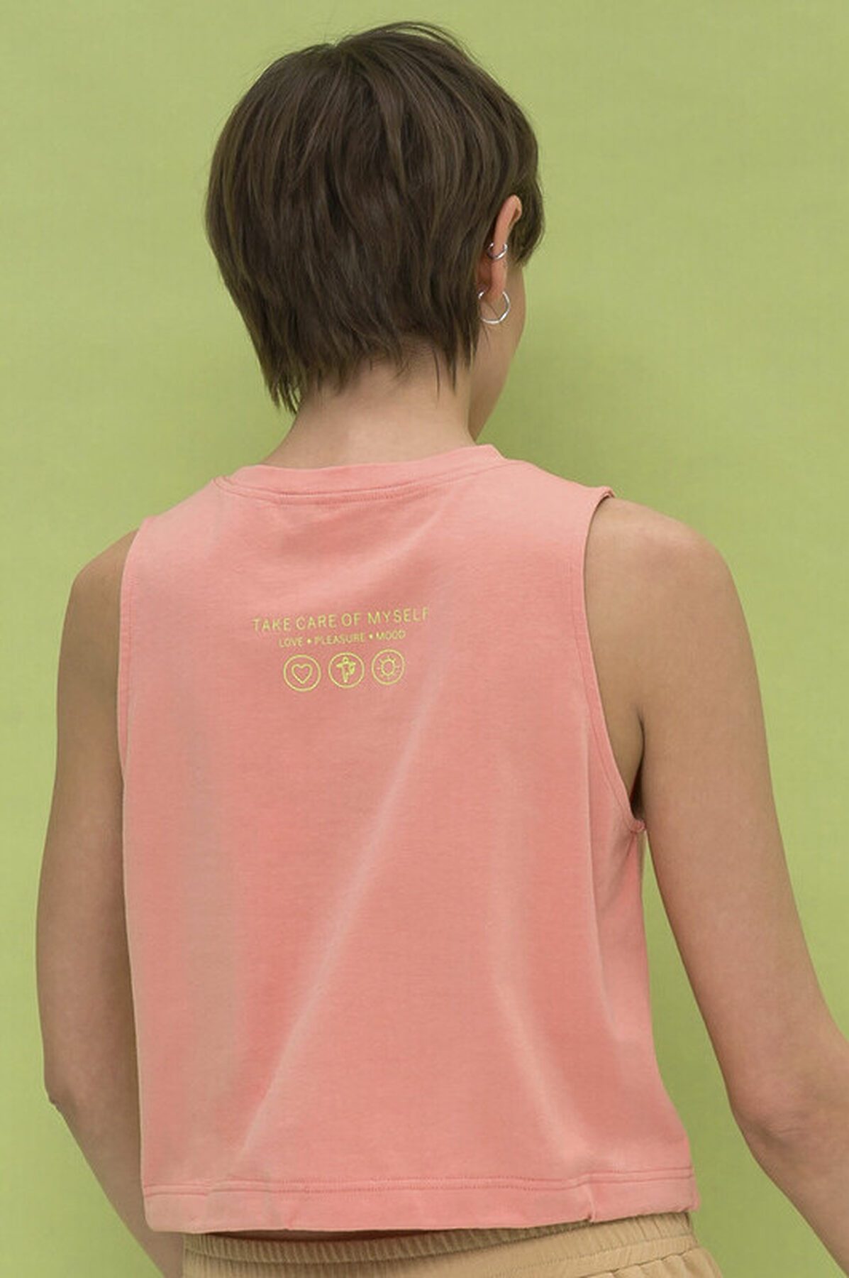 Женский трикотажный кроп-топ в спортивном стиле. В составе ткани преобладает хлопок — изделие дышит, приятно на ощупь и прекрасно подходит для жаркой погоды. Эластан помогает топу не терять форму. Модель с классической округлой горловиной украшает лаконичный позитивный принт на спинке, устойчивый к стиркам. По груди силуэт топа облегающий, по талии — свободный. С помощью эластика со стоппером по низу изделия можно регулировать его объём и менять силуэт. Модель лаконичного дизайна отлично сочетается с различными шортами, леггинсами, джоггерами.