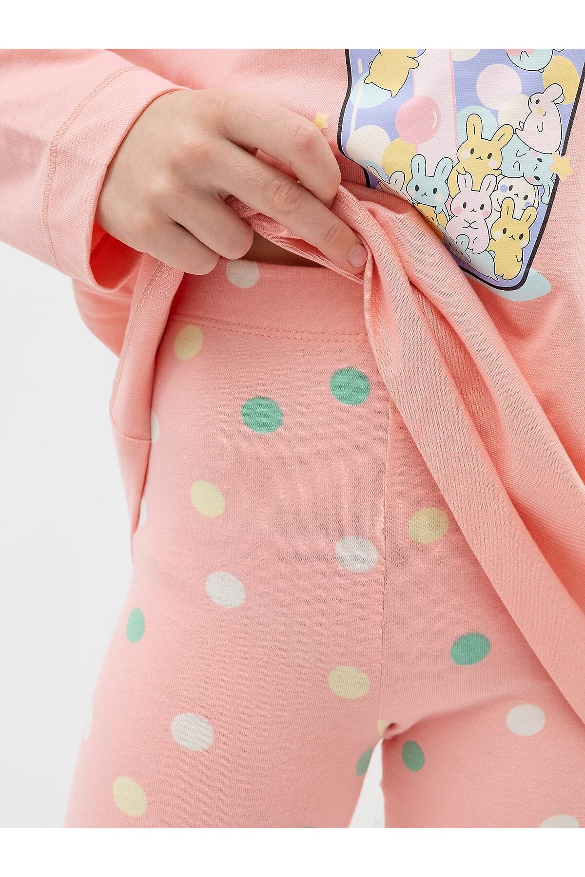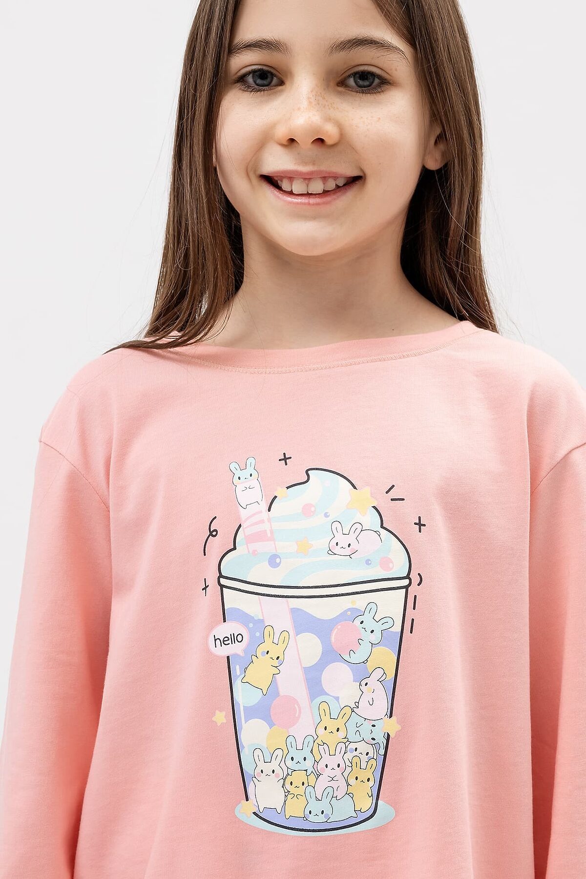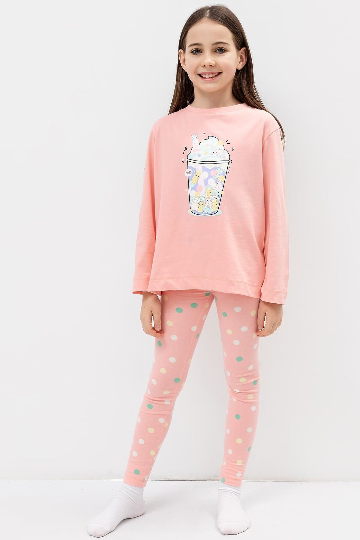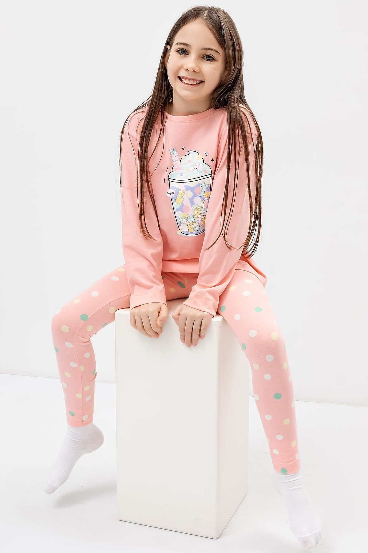 Уютная пижама для стильных девочек. Лонгслив и брюки состоят из хлопковой трикотажной кулирки. Лонгслив свободный, с круглой горловиной, длинными рукавами и слегка спущенной линией плеча. Пижамные брюки плотно облегают ножку, внутри пояса – эластичная резина. Отличный выбор для самых приятных снов!