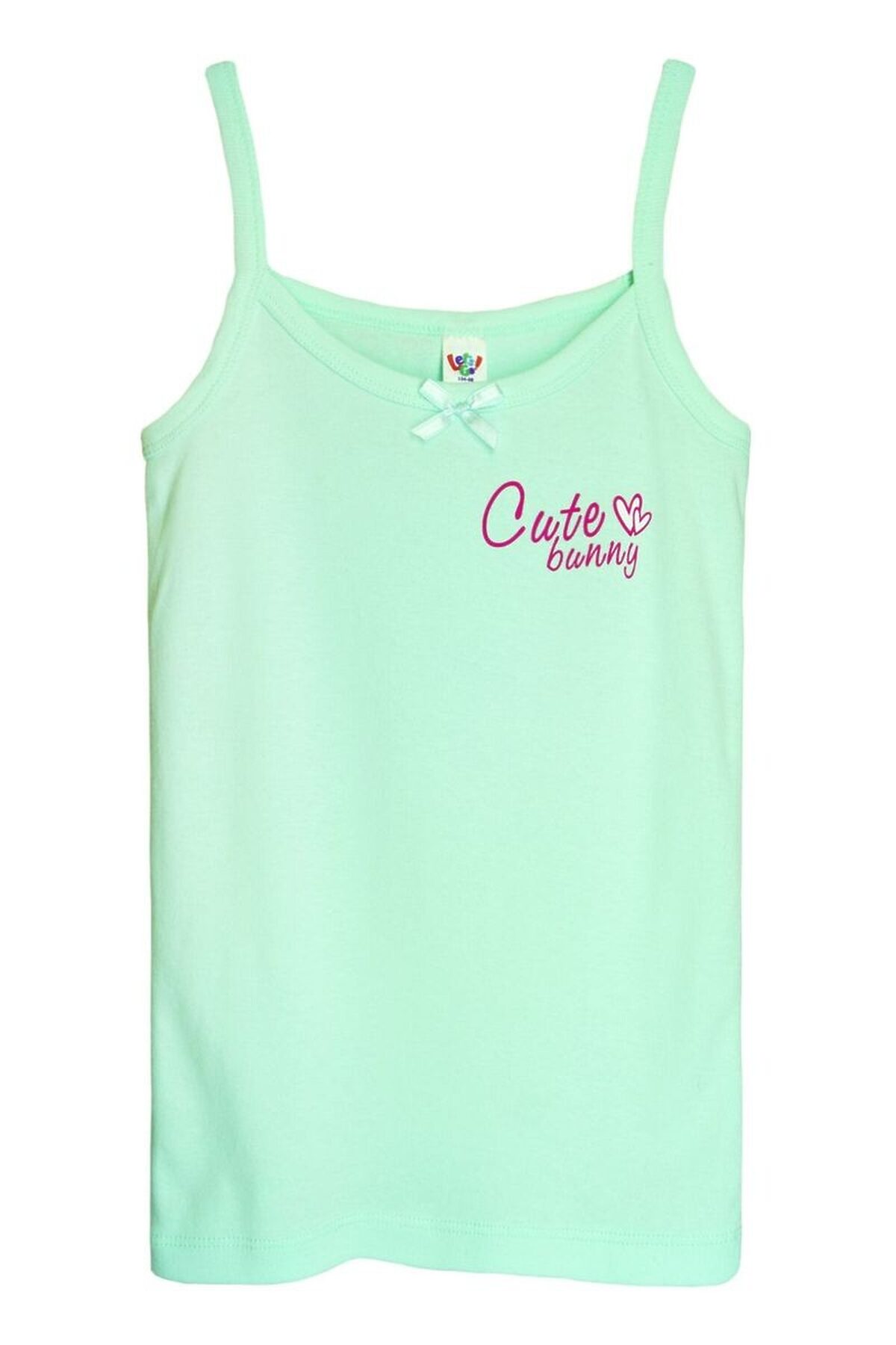 Майка для девочки на бретелях из гладкокрашенной рибаны. Горловина, пройма, бретели окантованы основным полотном.На горловине полочки атласный бант. На полочке выполнен принт (шелкография).