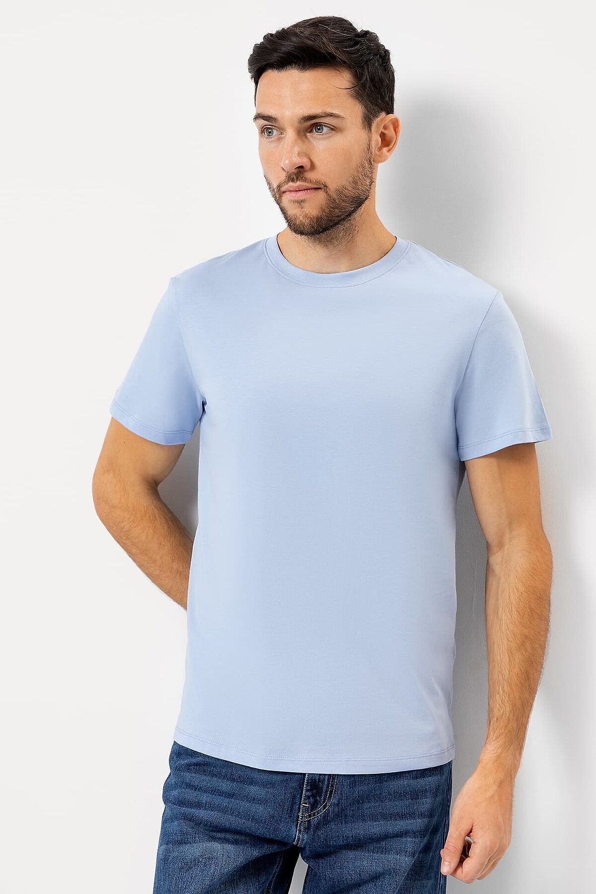 Футболка мужская прямого силуэта из трикотажного полотна кулирка. Горловина круглой формы, обтачка из рибаны. По горловине проложена отделочная строчка. Бейка по горловине спинки из кулирки от плечевого шва. Рукав втачной, короткий.