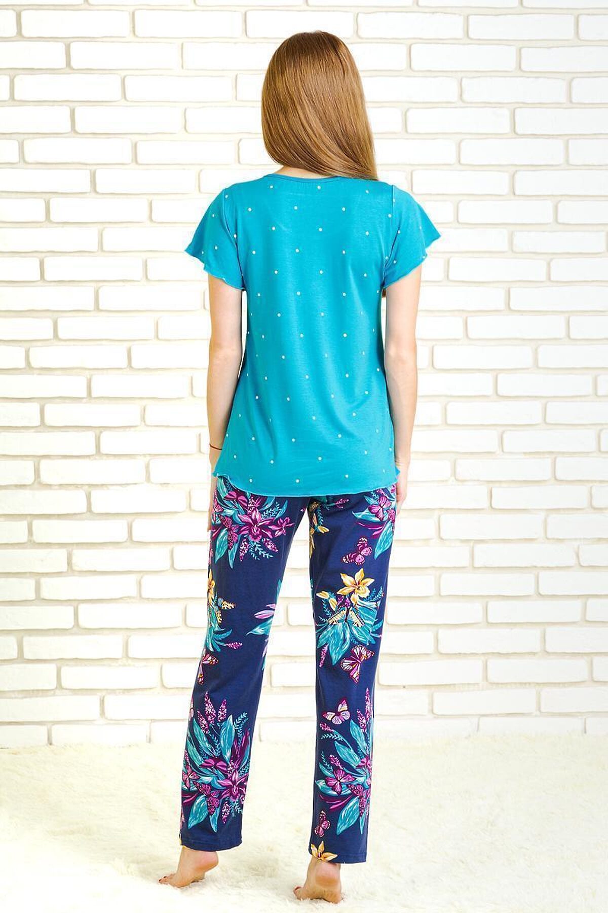Красивый и красочный костюм, в комплекте которого однотонная футболка в мелкий горошек, свободного кроя из качественной вискозы с добавлением лайкры. Рукав футболки короткий, фасон «крылышко», все края обработаны узким спиральным швом. Так же в комплекте брюки прямого кроя из хлопка с добавлением лайкры. Яркий запоминающийся рисунок удерживает в себе оттенки футболки. Гармоничный и практичный костюм, прекрасен как для отдыха, так и для дома.