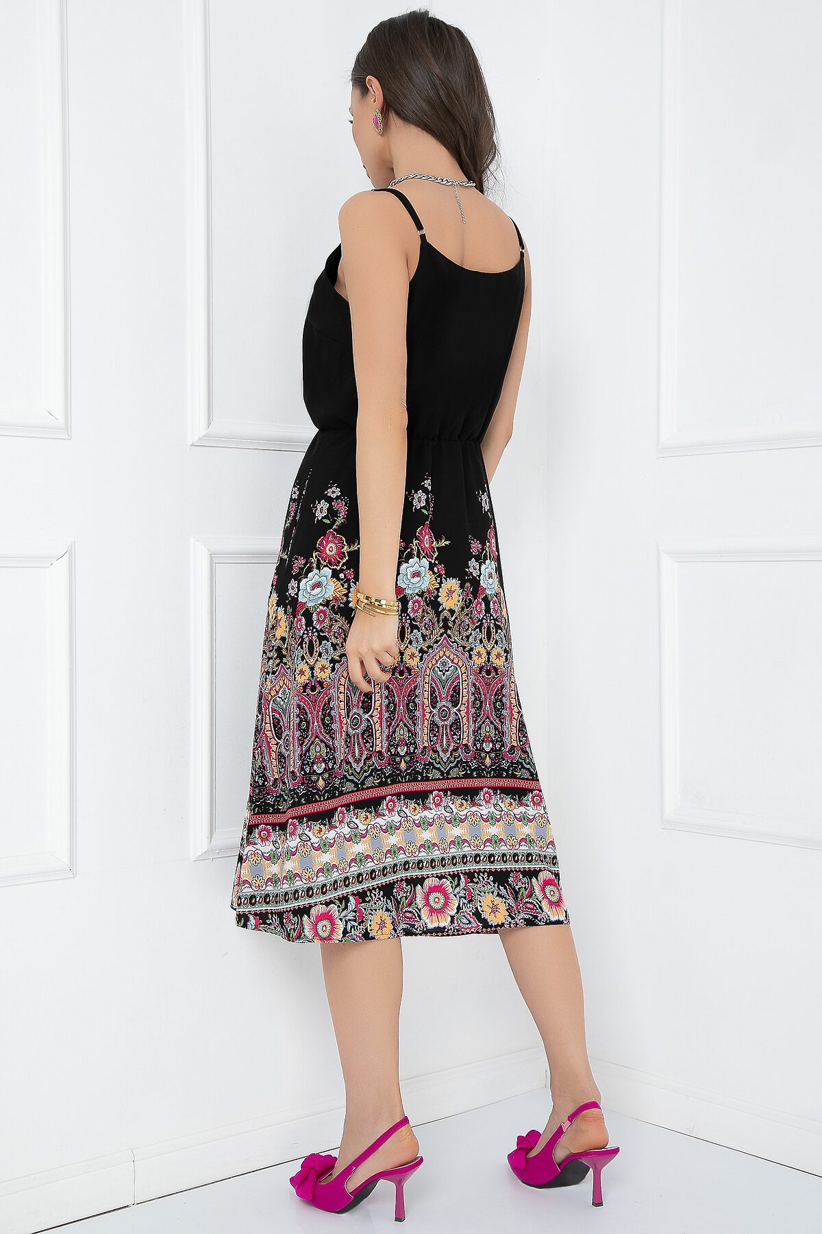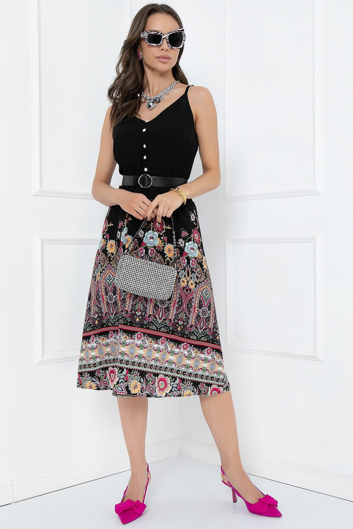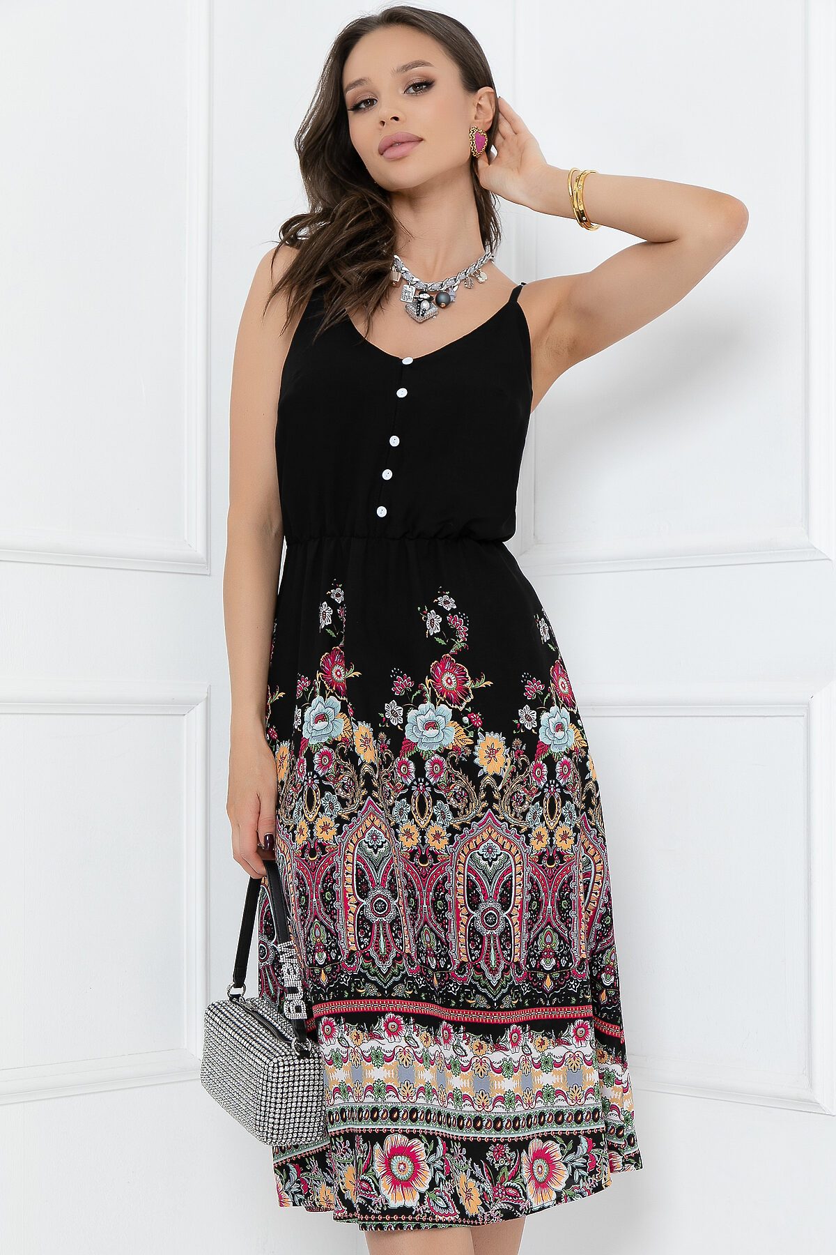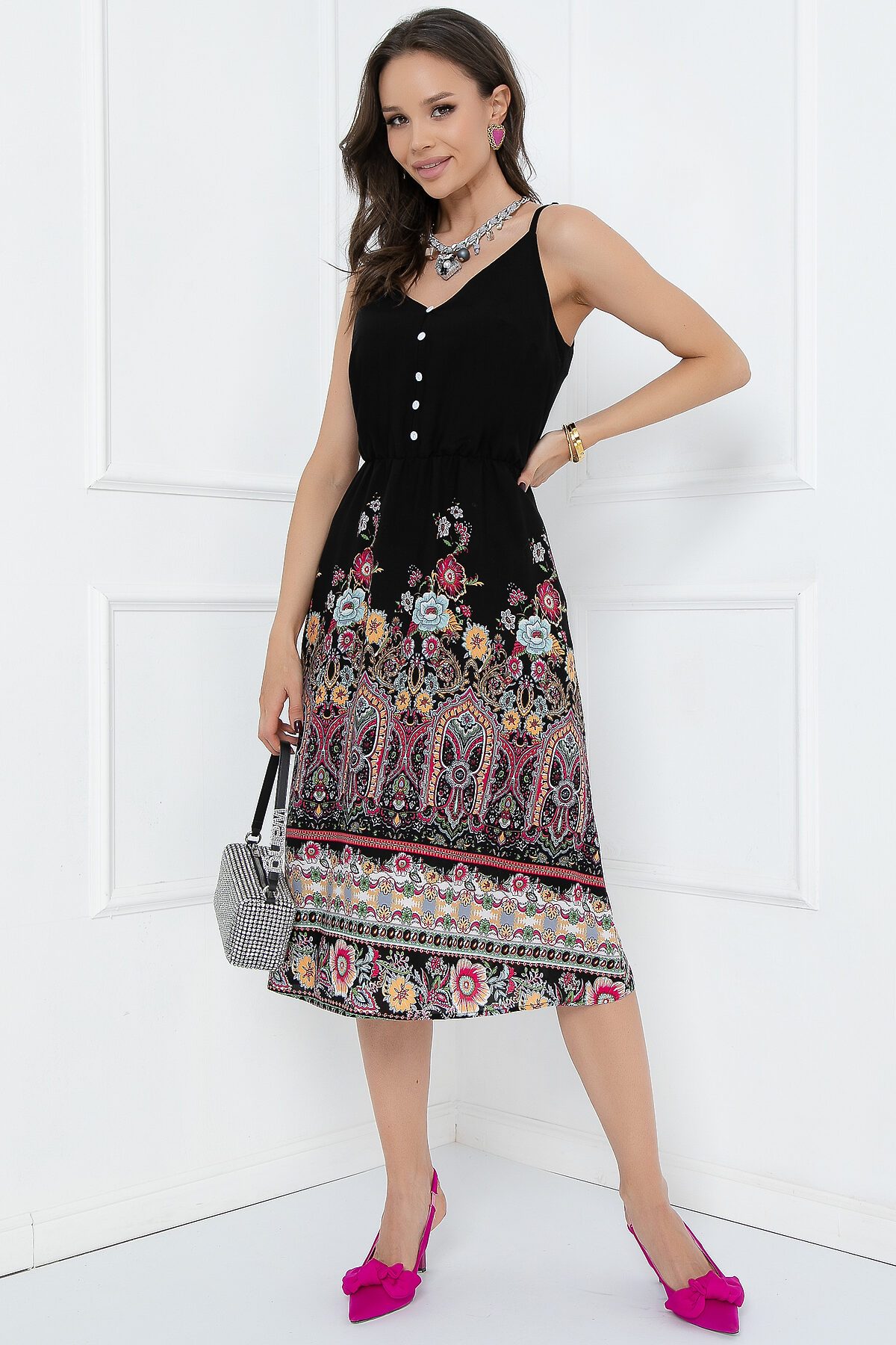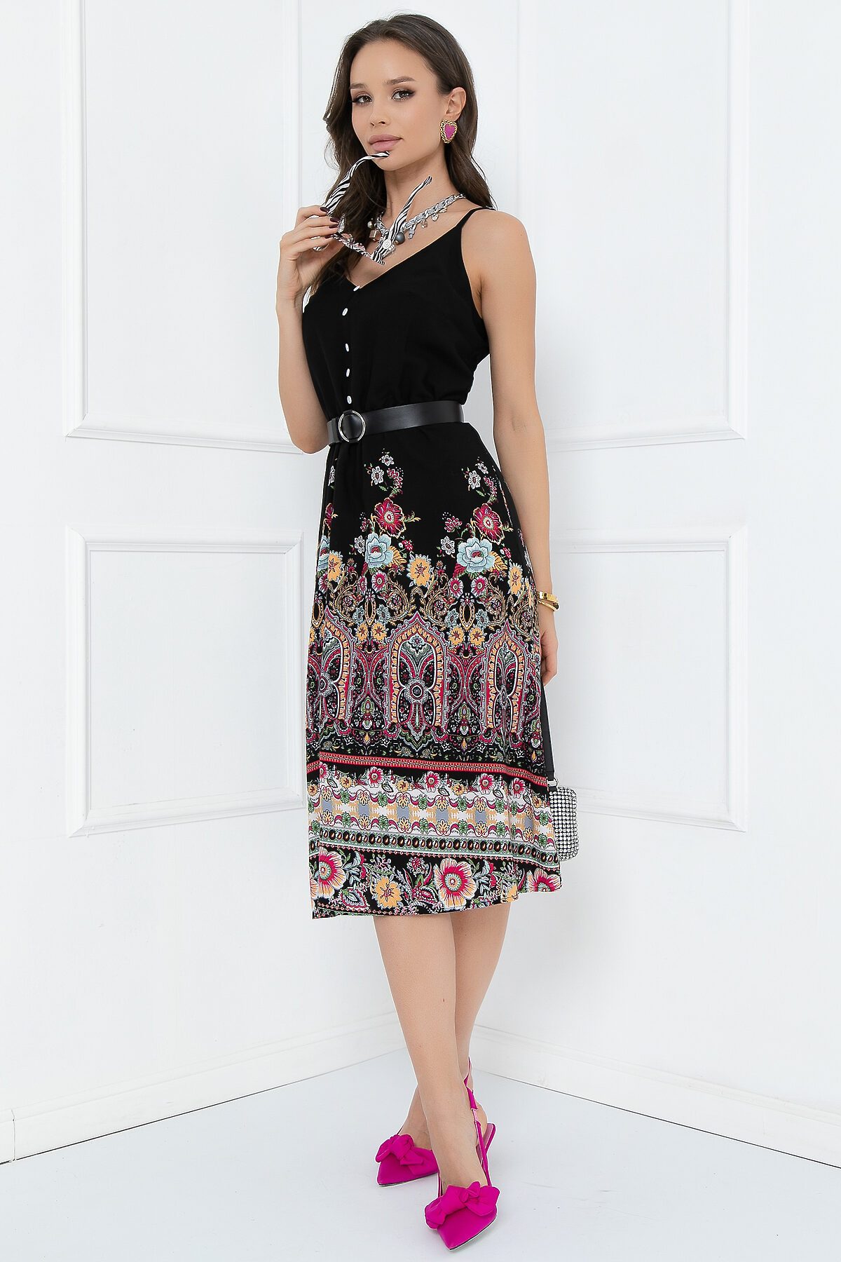 Монелья – легкое, летнее струящееся платье полуприлегающего силуэта из вискозной ткани с необычным и ярким цветочным принтом. Вырез горловины V-образный, переходящий в пуговицу-застежку и воздушные петли. Платье без рукавов, на регулирующих бретельках. В боковых швах – функциональные карманы. Дополнить образ и подчеркнуть линию талии Вы можете с помощью интересного пояса или ремня (на модели использован ремень Мероне, в комплект не входит).