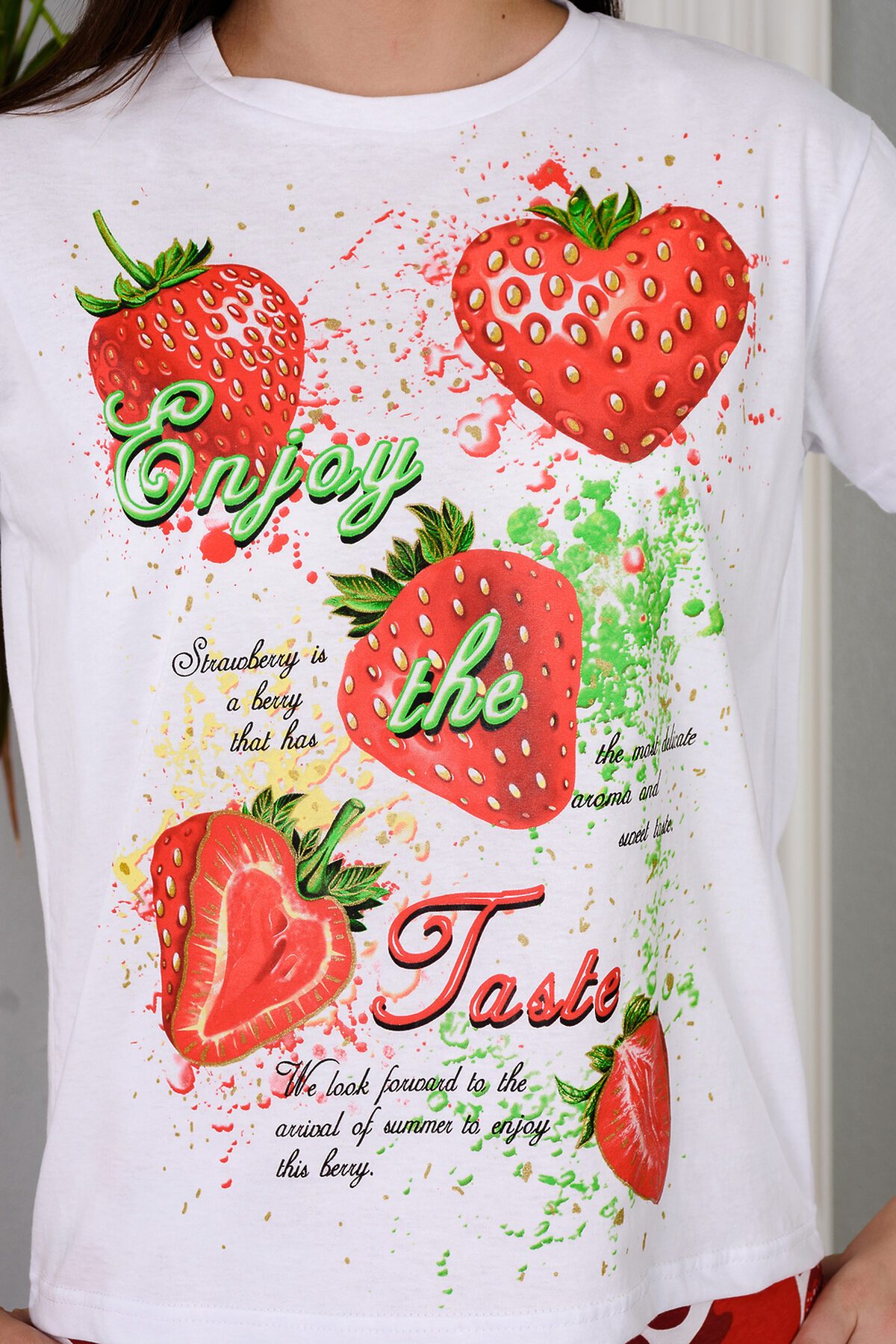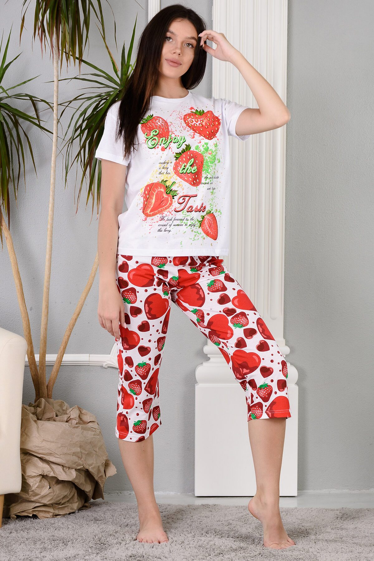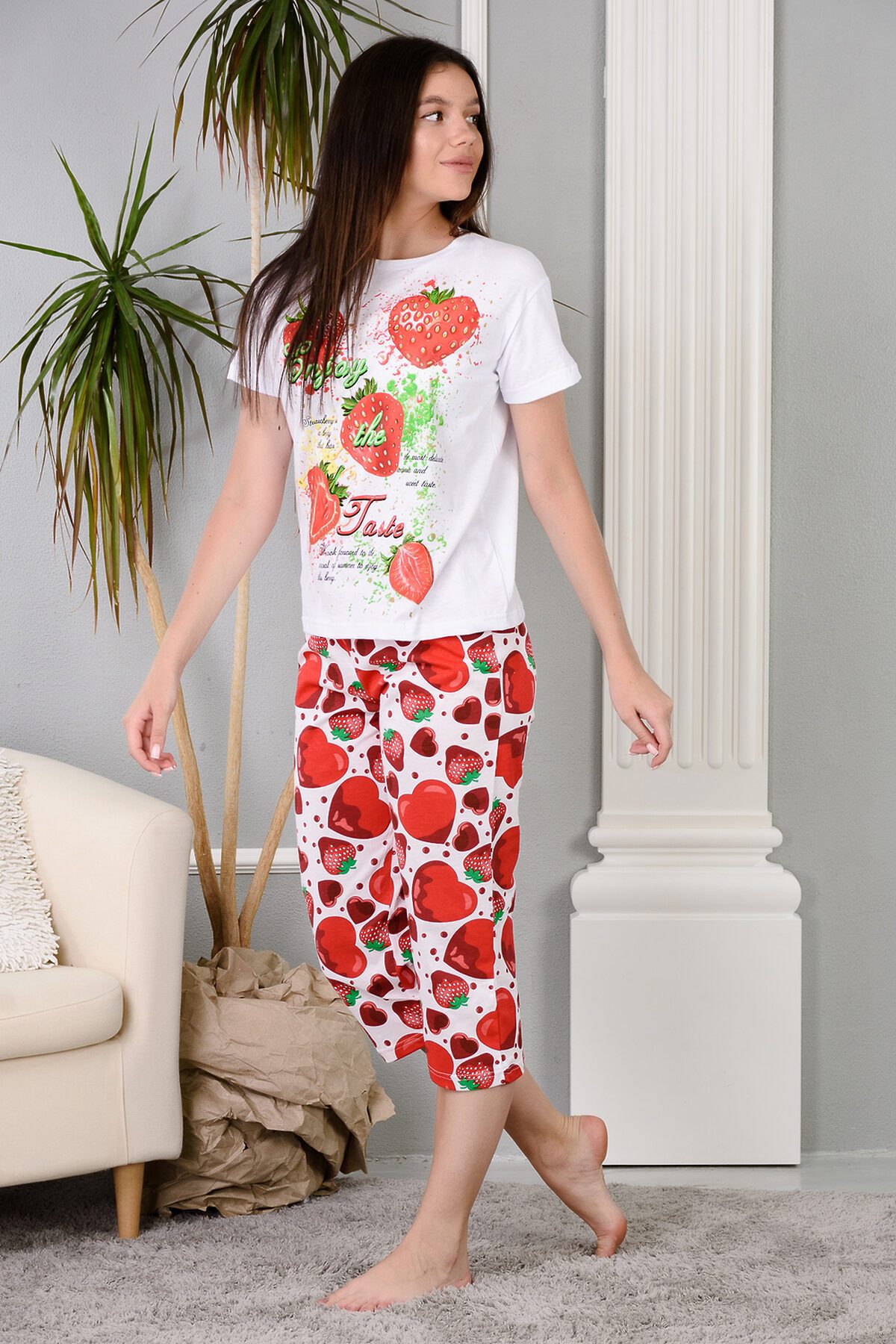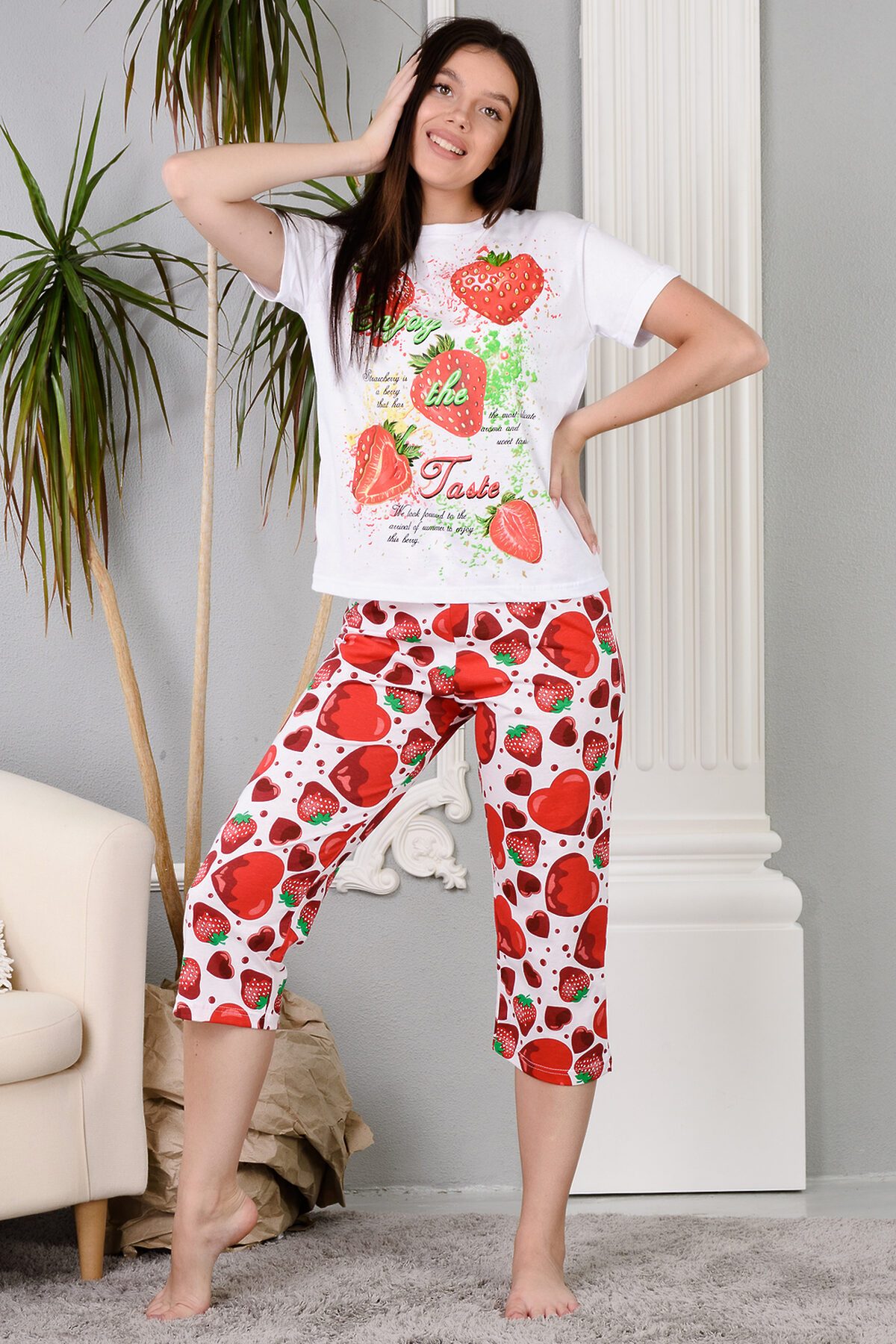 Уютная клубничная пижамка. Футболка со спущенной линией плеча, бриджи свободного кроя. В этой пижаме удобно спать, проводить время дома и на отдыхе.