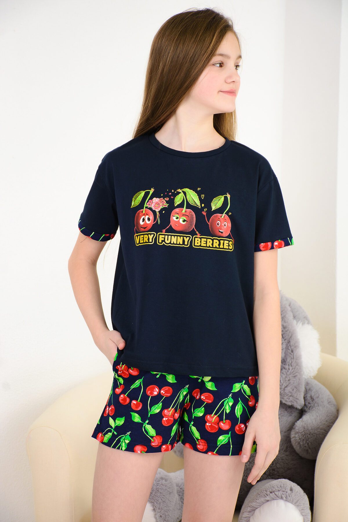 Весёлый костюм для подростков состоит из футболки свободного кроя и шорт с боковыми карманами. Симпатичный принт - три вишенки. На рукавах манжеты с отворотами. Костюм незаменим на отдыхе и дома.