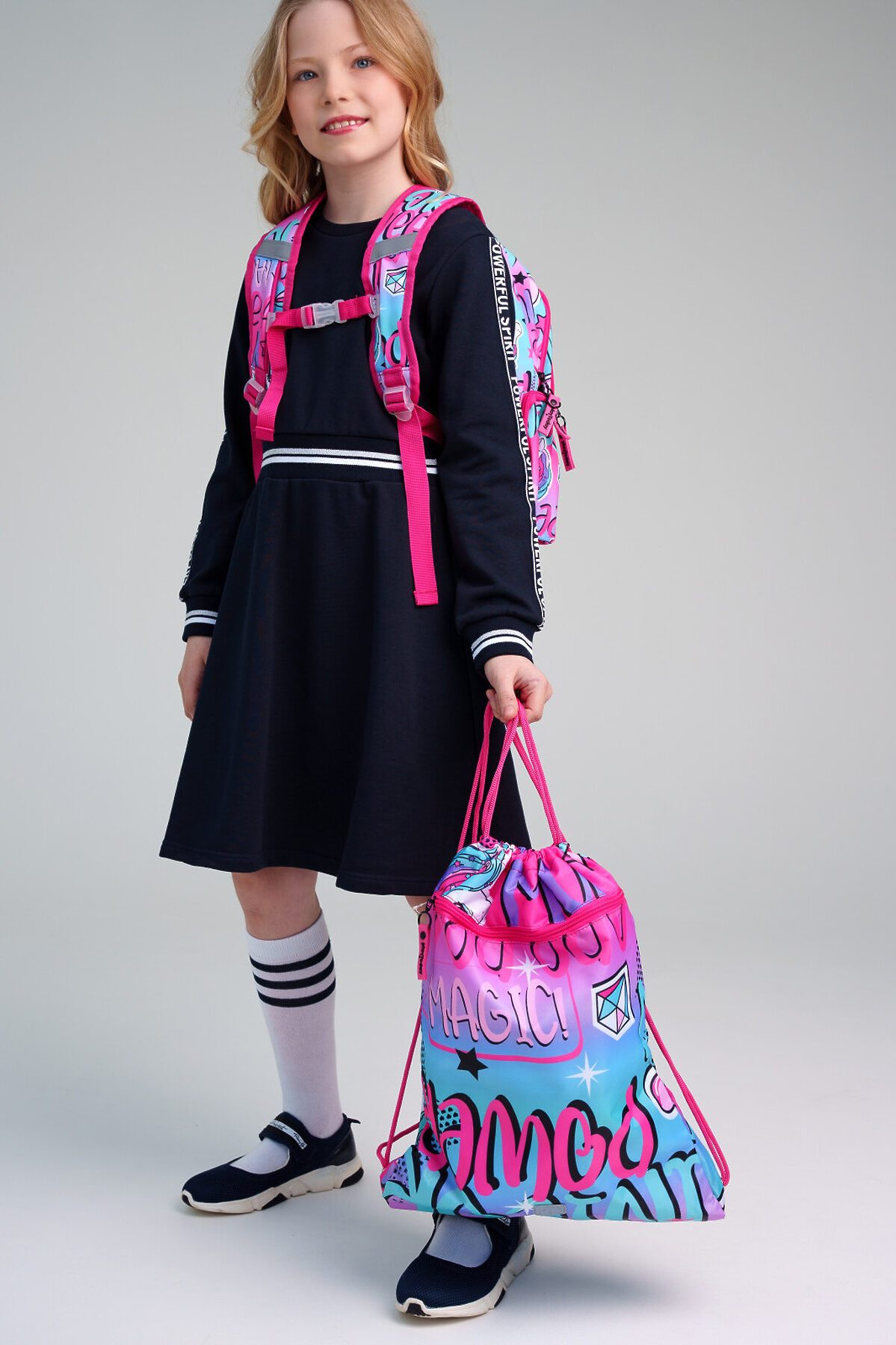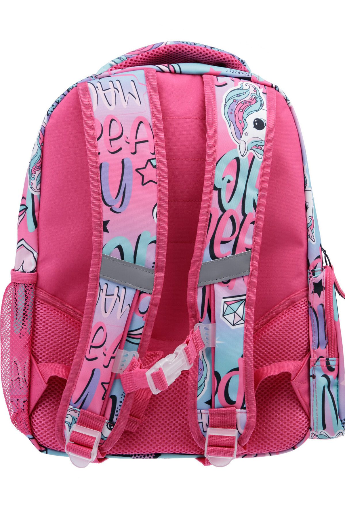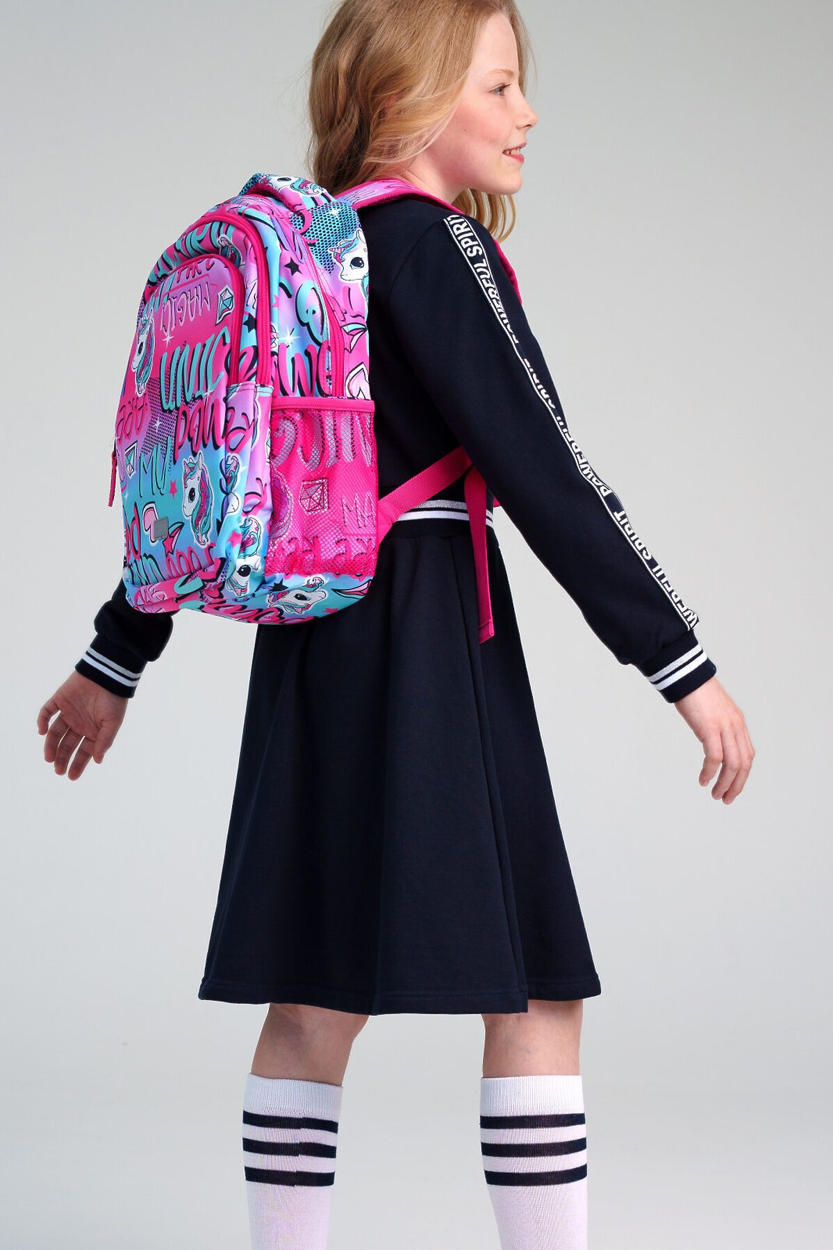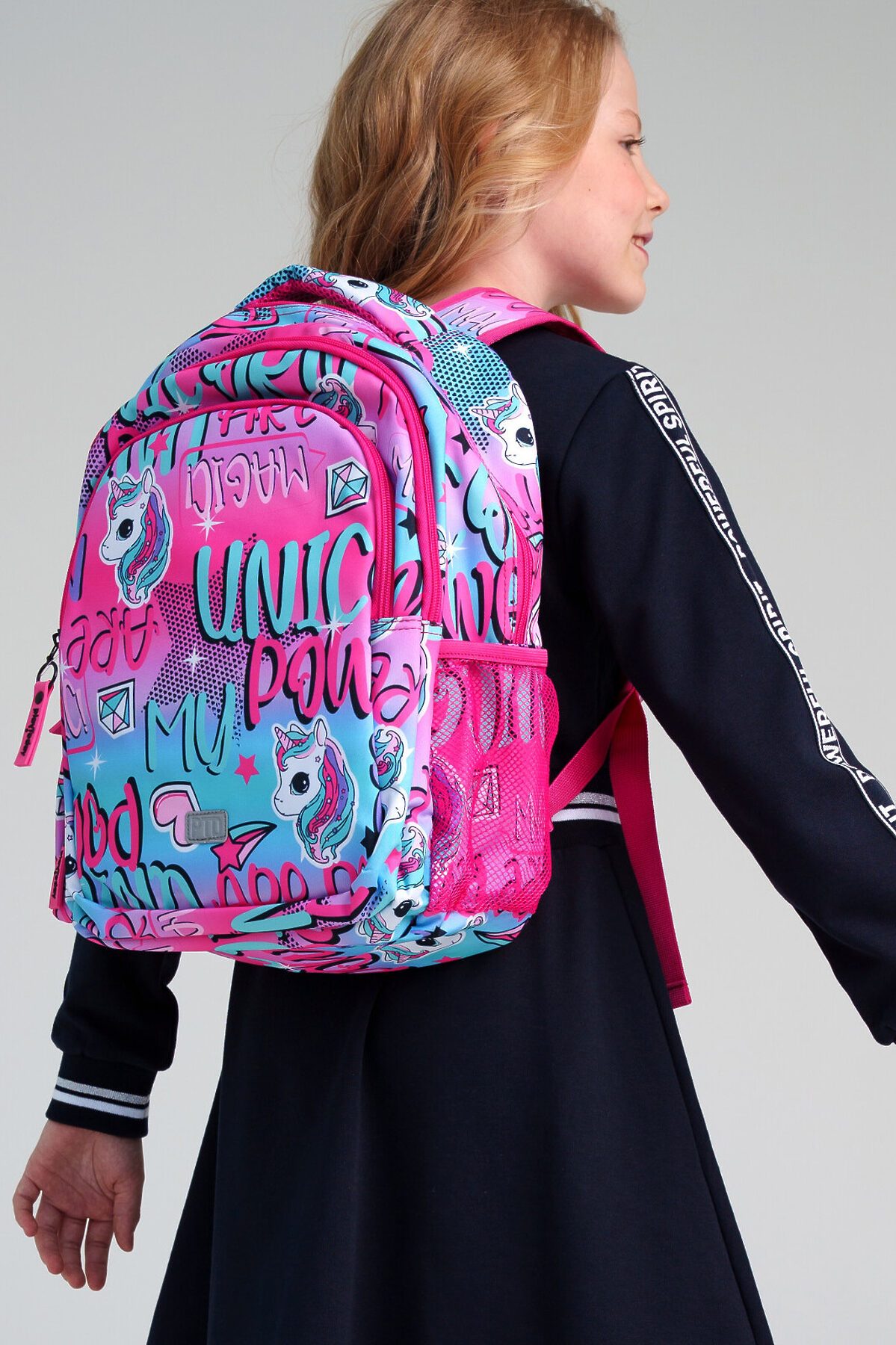 Рюкзак текстильный для девочки. 38*29*19 см. Широкие регулируемые лямки с мягкими вкладками и сетчатым покрытием. Ортопедическая спинка. 3 основных отделения на молнии. 2 боковых кармана: сетчатый и на молнии. Внутри рюкзака: 1 отсек - карман на молнии, открытые карманы для канцелярии. 2 отсек - без карманов, 3 отсек - карман для папок, карман на молнии, 2 кармана без замка, карабин для крепления пенала/ключей. Усиленная спинка, дно и верхняя ручка. Светоотражающие элементы на переднем кармане и плечевых ремнях.