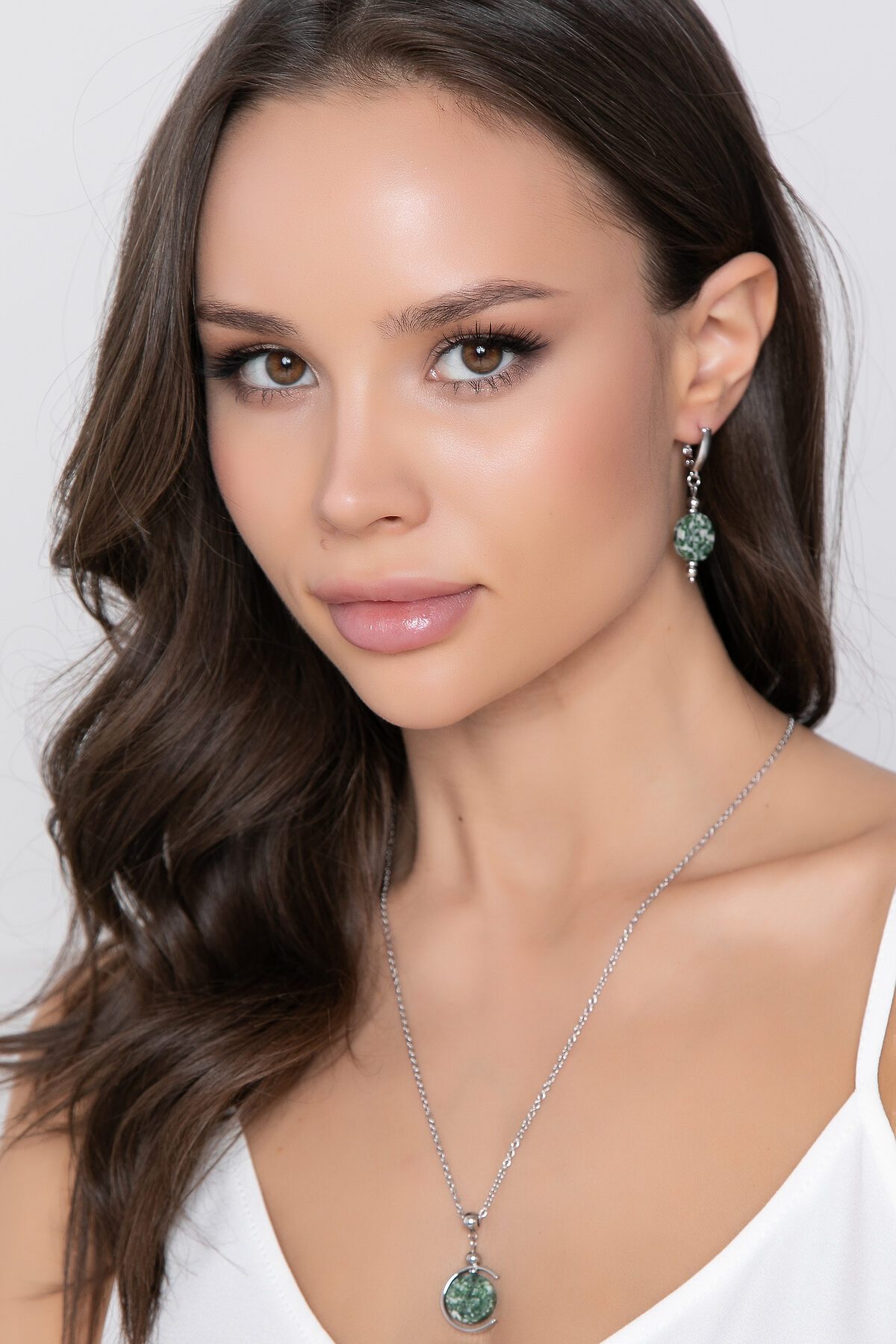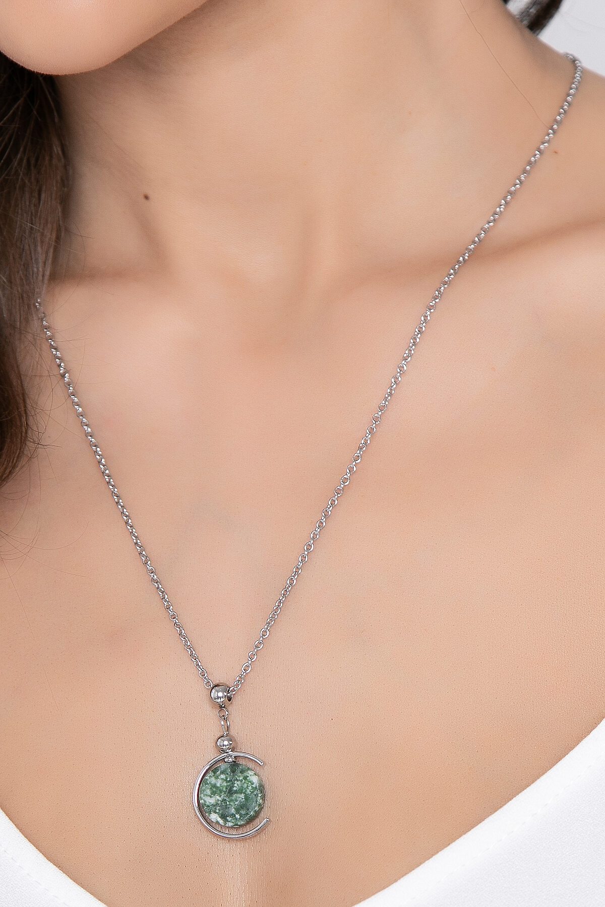 Кадоре – изысканное колье с подвеской из мохового агата. Моховой агат помогает равномерно распределять жизненные силы, определяя проблемы и способствуя из решению.