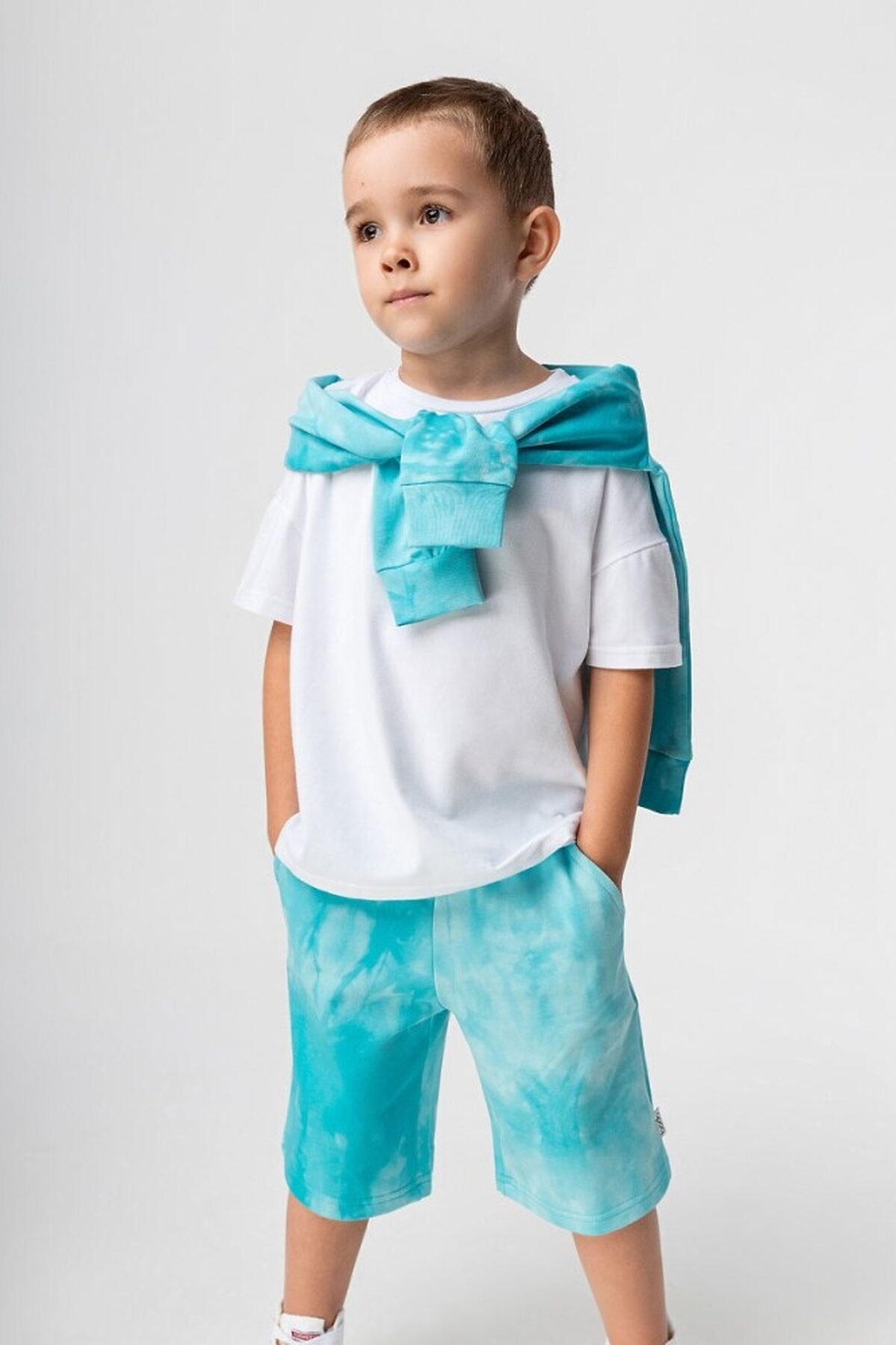 Костюм детский. Свитшот, полуприлегающий покрой, рукава на манжетах, округлый вырез горловины. Шорты, детали: свободный покрой, пояс - эластичная резинка, карманы с отрезным бочком. Состав: футер двухнитка 92% хлопок 8% лайкра